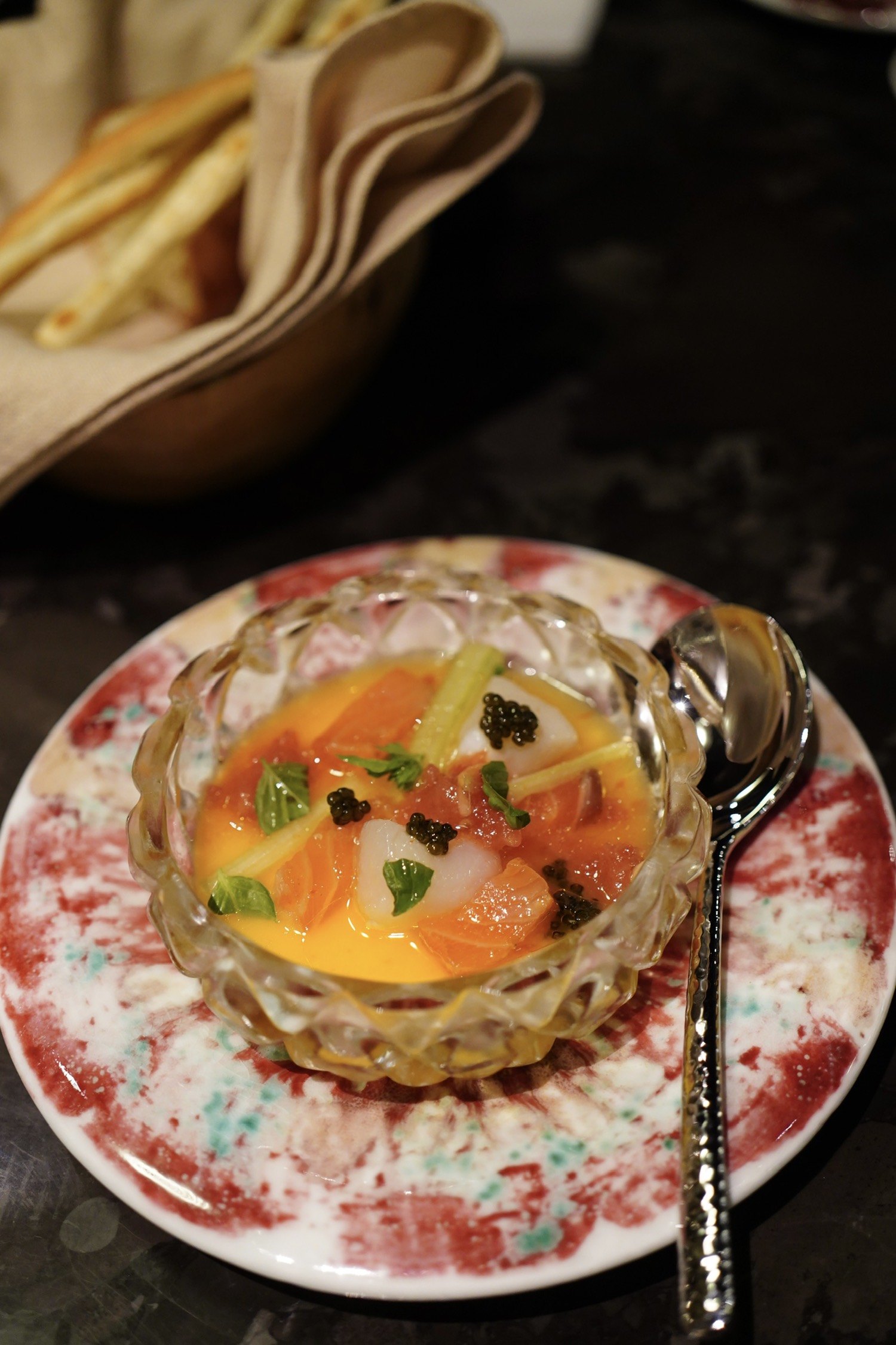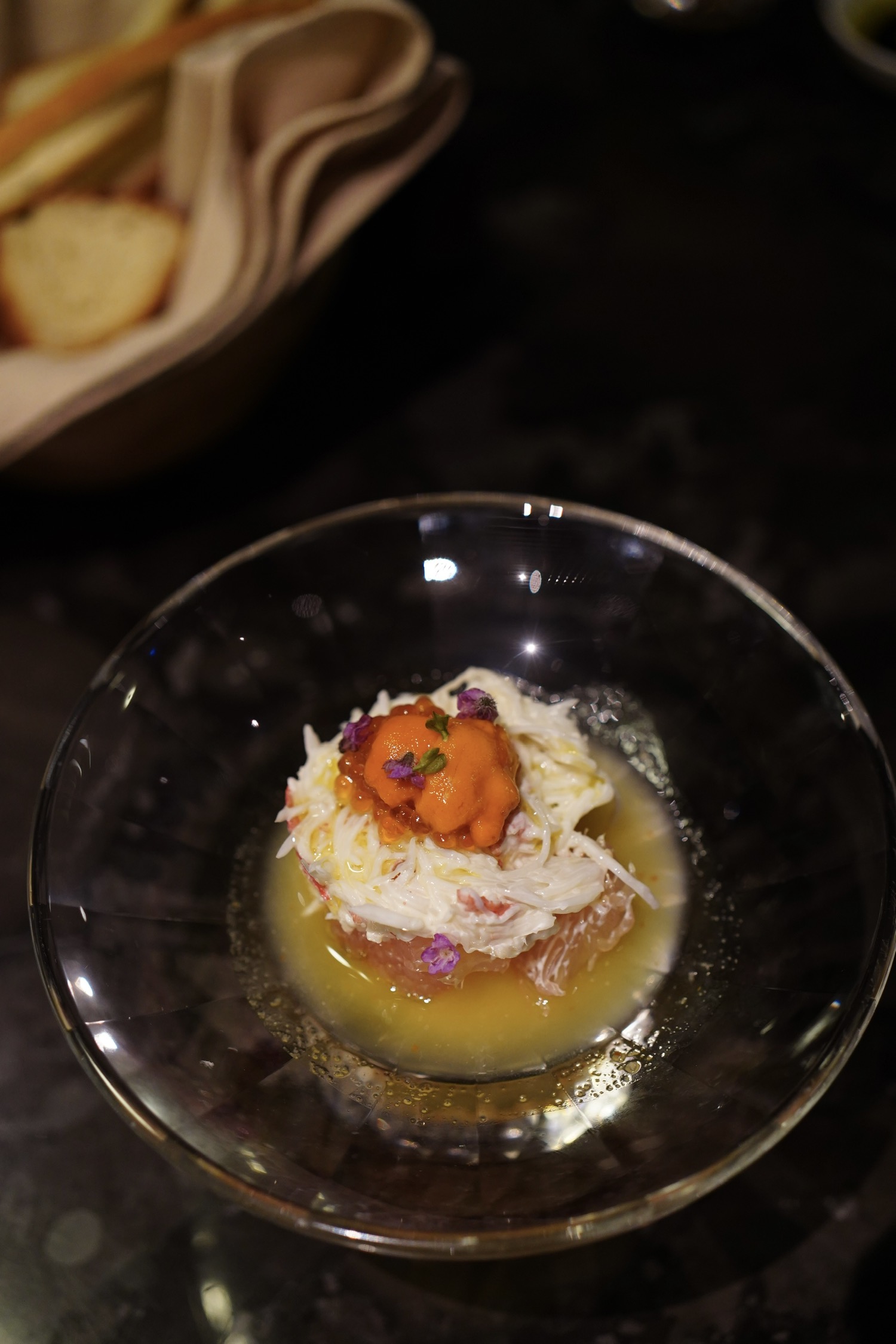 amuse-bouche换成了牛肉塔塔为主体,海苔元素依旧。牛肉粒腴嫩,温润脂香,烟熏mayo的咸酸调味或许明确些会更开胃。