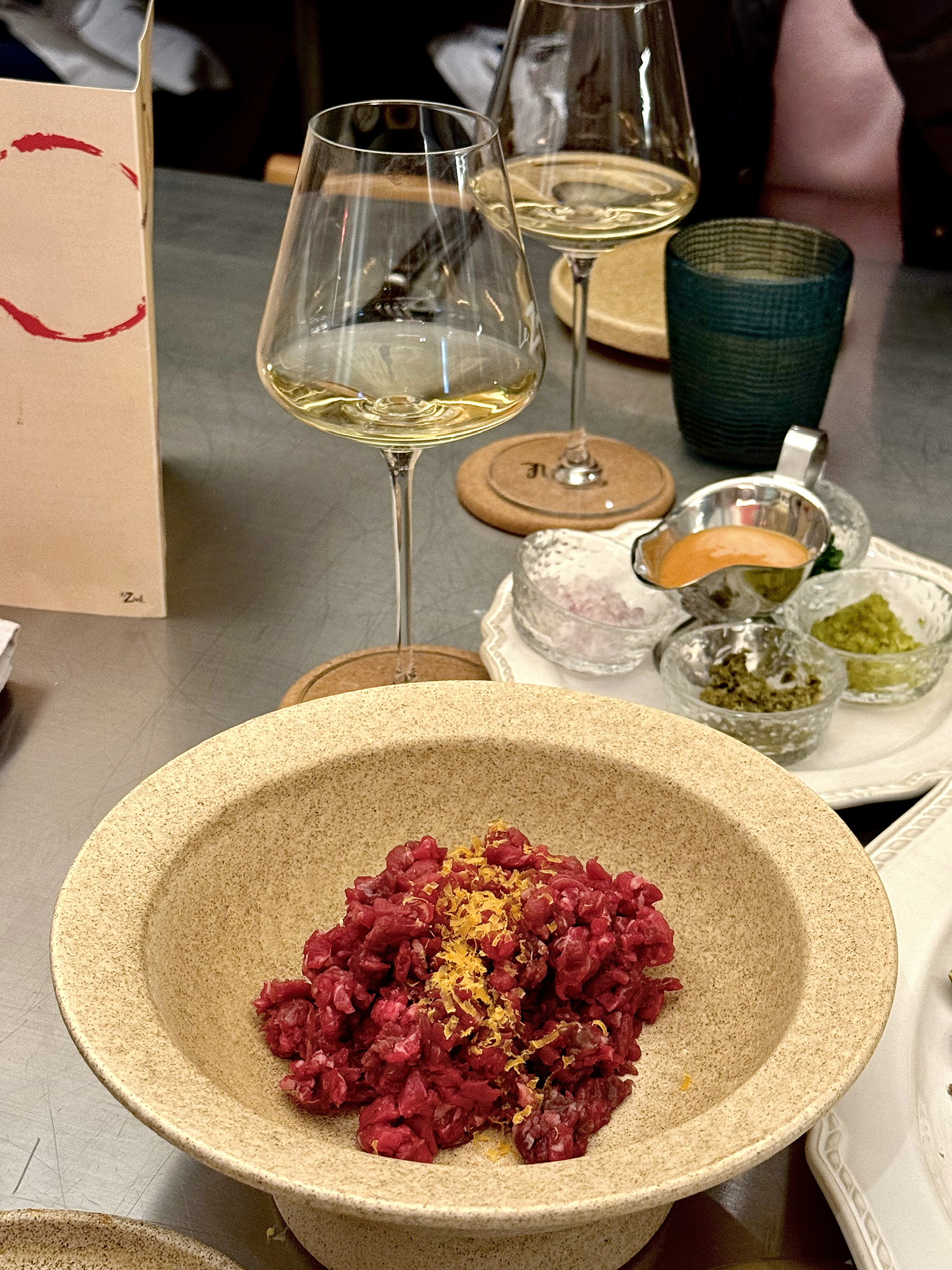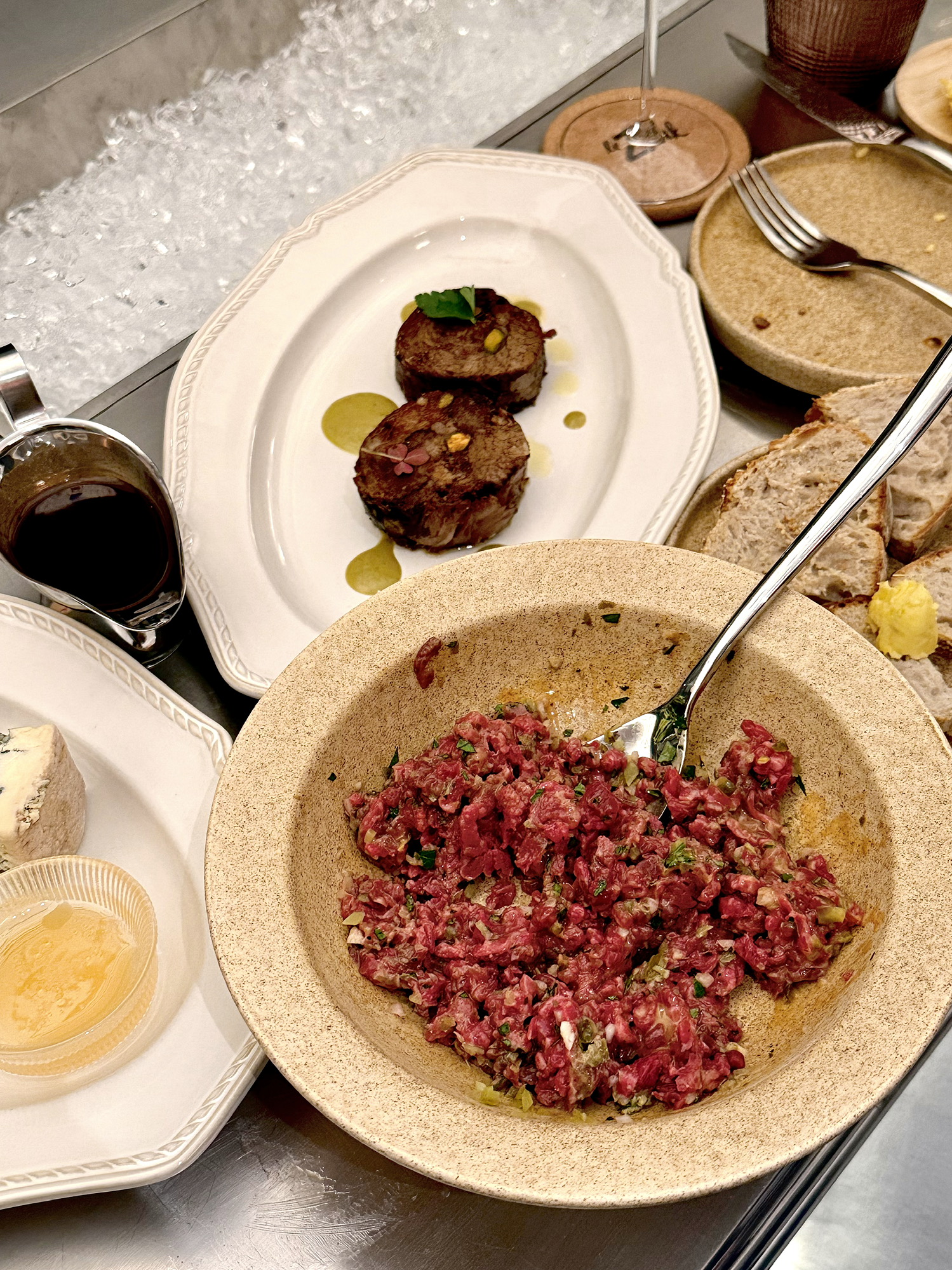Tartare不用单独的生蛋黄而是蛋黄塔塔酱,自己拌进打成泥状的caper和酸黄瓜/洋葱粒/欧芹,传统的咸酸辛调味,不出错的酒馆菜。