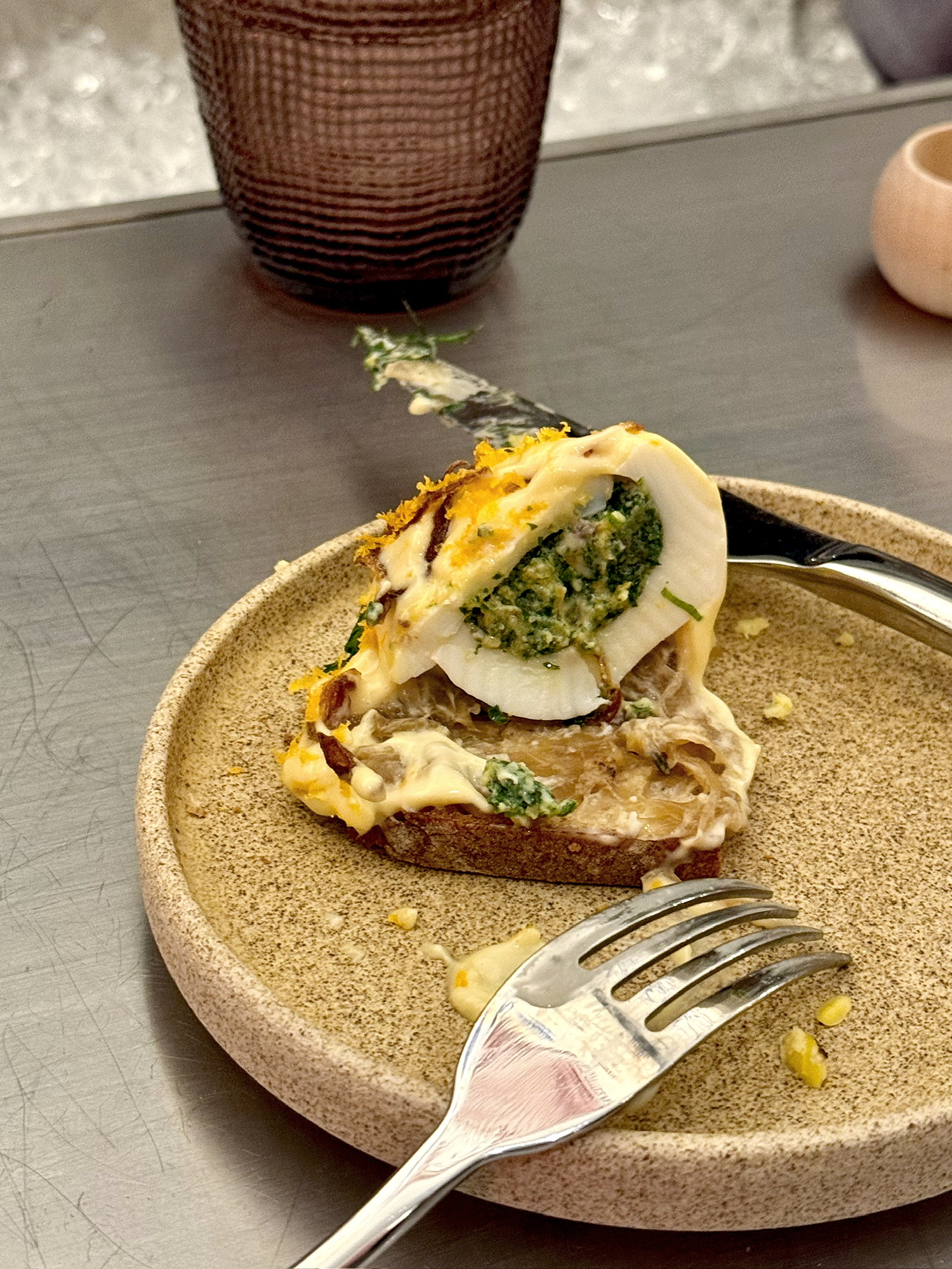 配的荞麦酸包上是甘甜的焦糖洋葱,自己手动叠成鸡蛋小挞后有蛋奶/草本/谷物/焦糖香,口感很丰富。