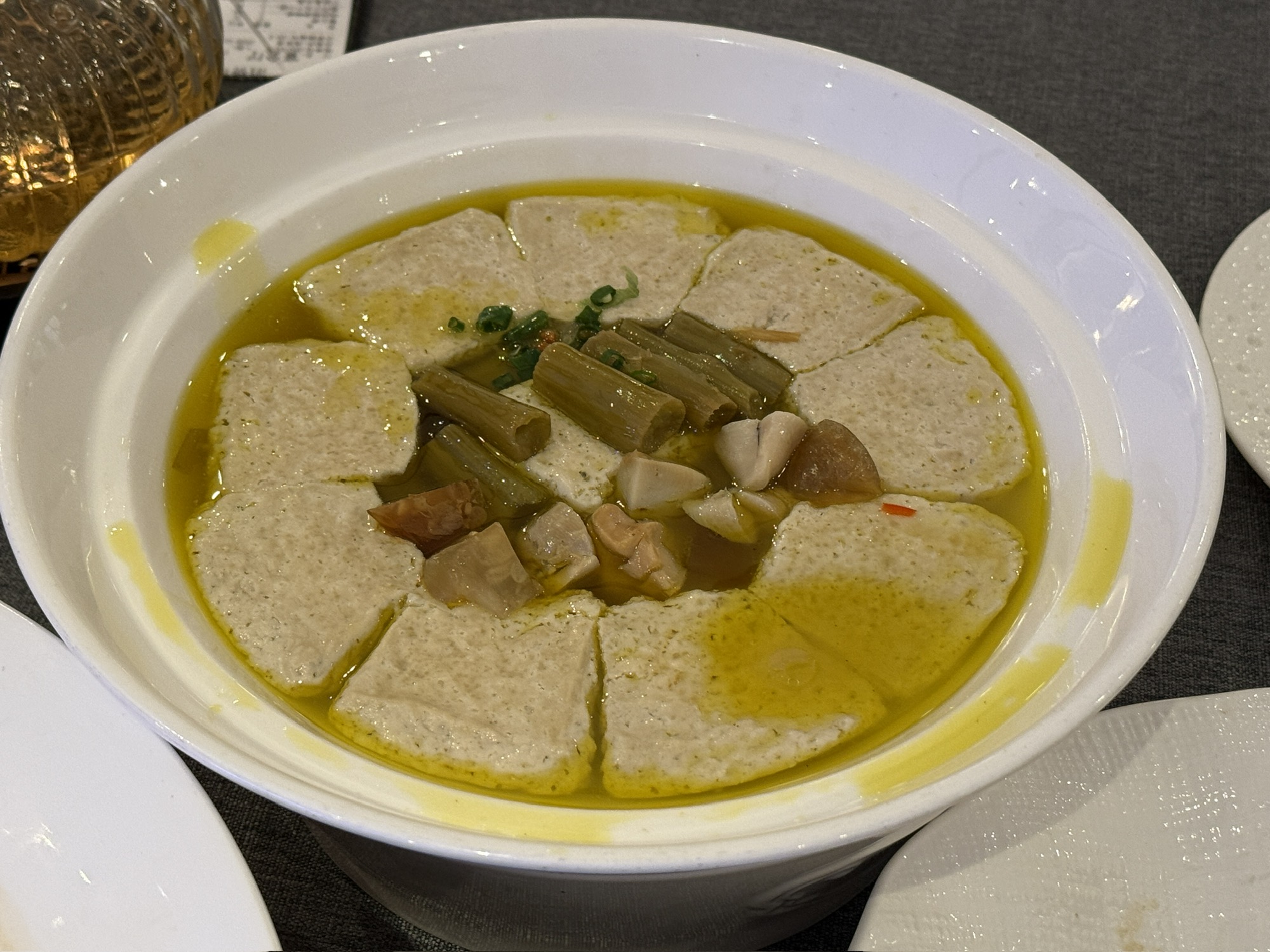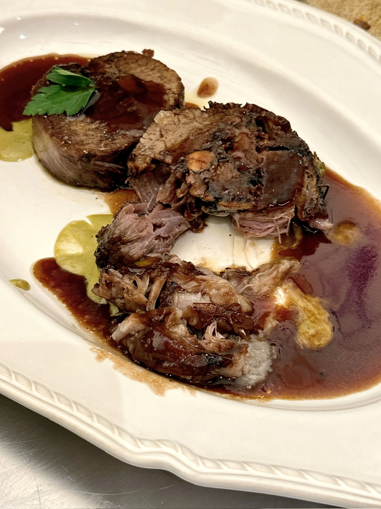 羊肩肉卷外表微脆焦,炖得酥嫩,一戳即散,带着筋皮部分最是美味,油润又微微黏糯。