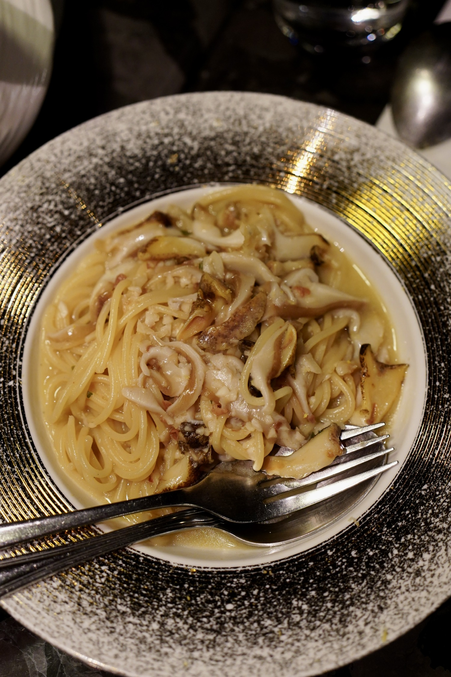 菌菇高汤蒸蛋嫩滑像云朵,龙虾钳肉/扇贝的海味鲜甜,黑松露/羊肚菌/高汤的菌鲜,Gruyere屑的奶香与碗底蔬菜的脆爽,多重鲜味糅合得温润。