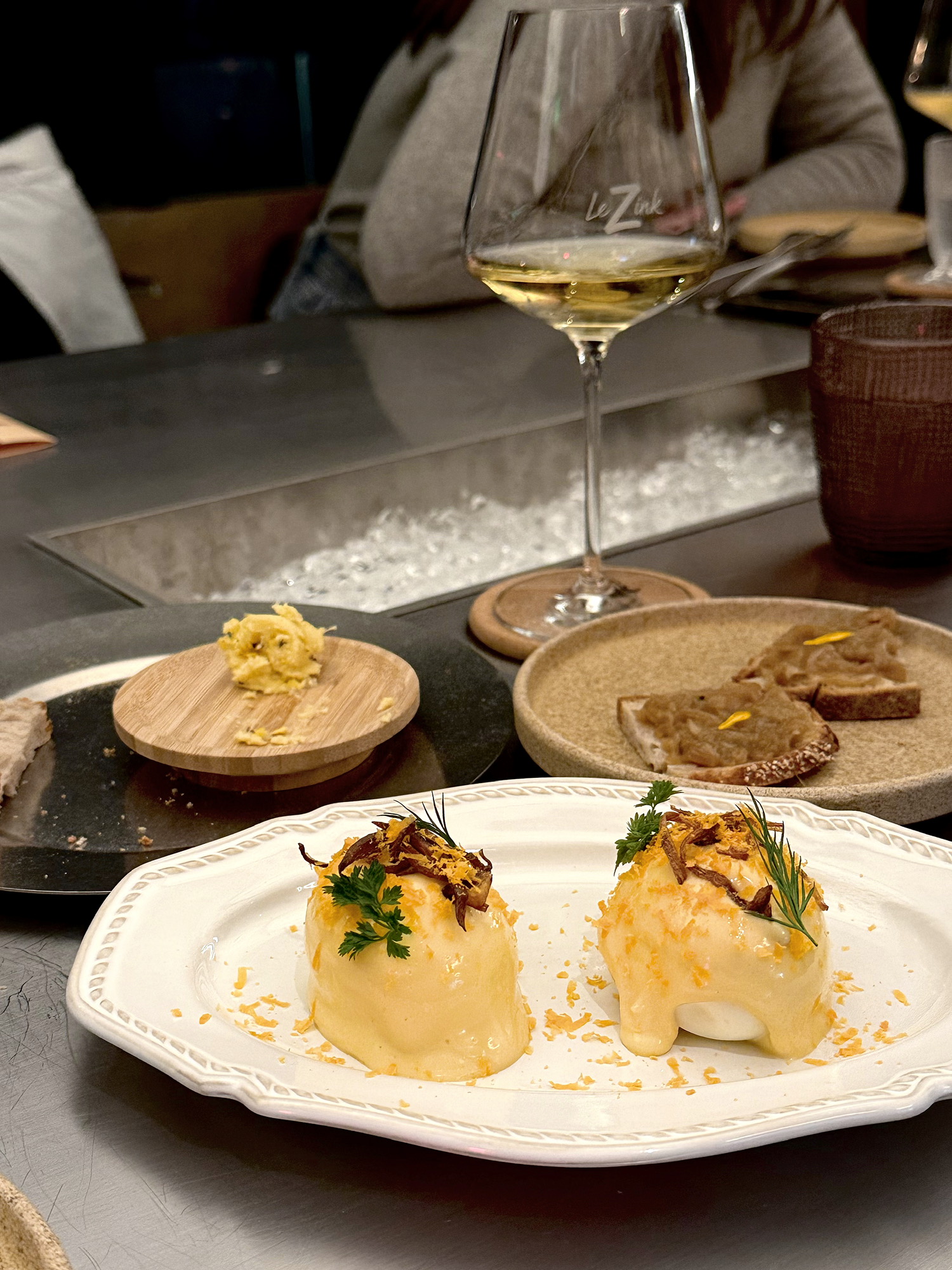 脆培根作topping,煮熟蛋黄并非简单与mayo混合成内馅,而是和小葱/细香芹/欧芹各种香草(似乎还有青辣椒和橄榄?)糅合在一起回填,盘底有酸香hollandaise作酱汁。