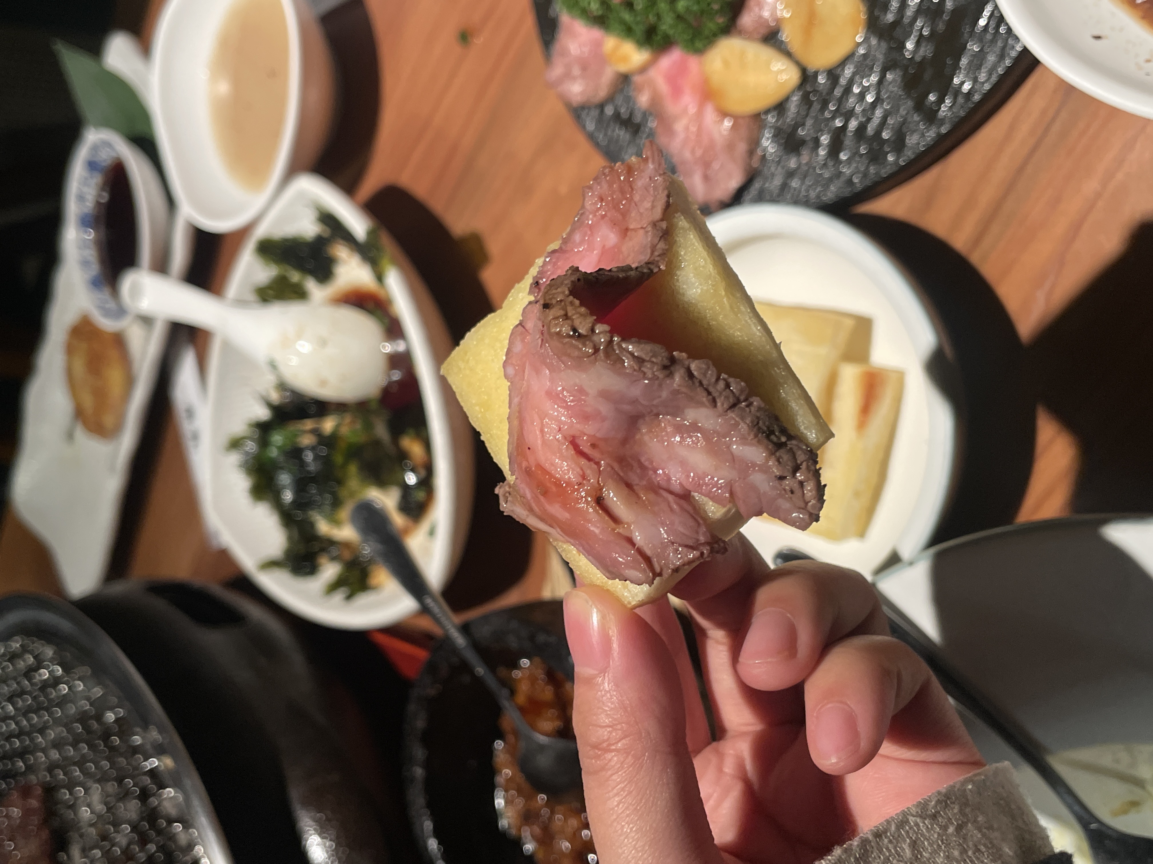 收稠的羊肉原汁咸度略高,搭配的韭菜花mayo很有中西融合的巧思,给rich的酱汁增了清新。