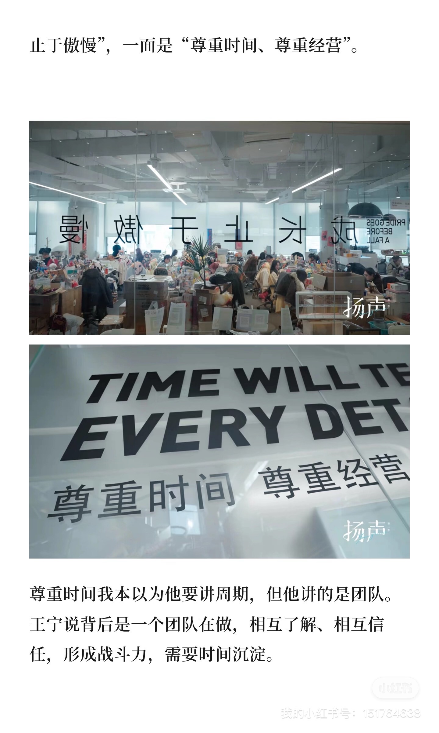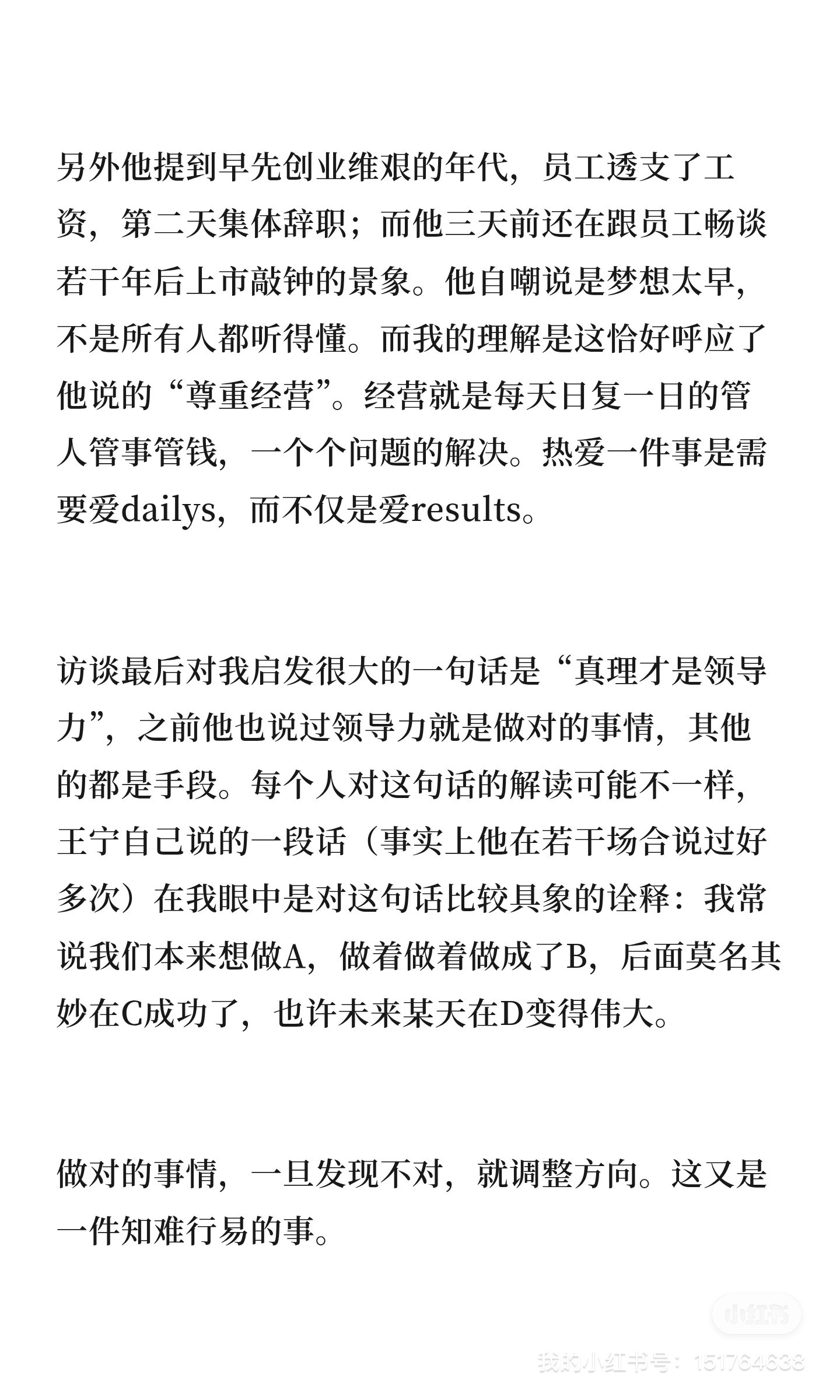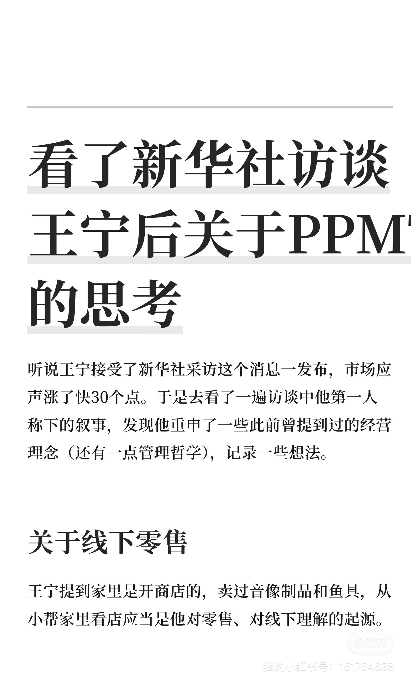 听说王宁接受了新华社采访这个消息一发布,市场应声涨了快30个点。于是去看了一遍访谈中他第一人称下的叙事,发现他重申了一些此前曾提到过的经营理念(还有一点管理哲学),记录一些想法。