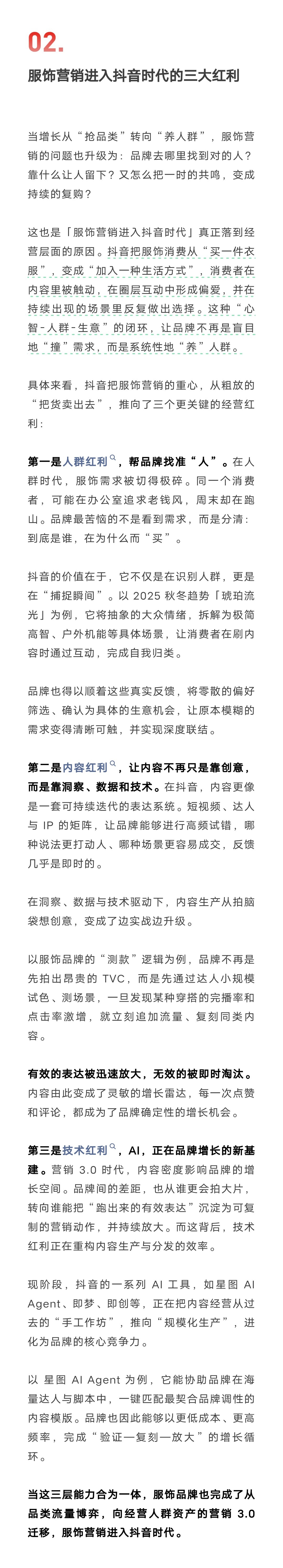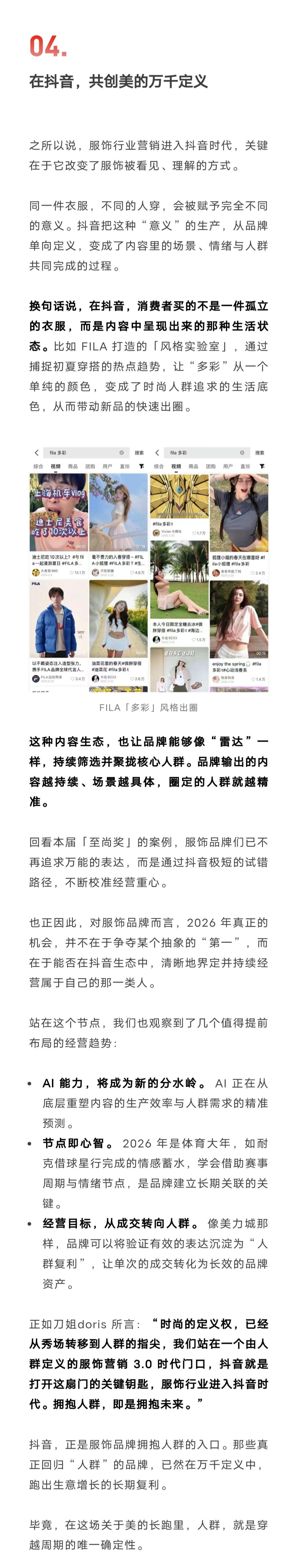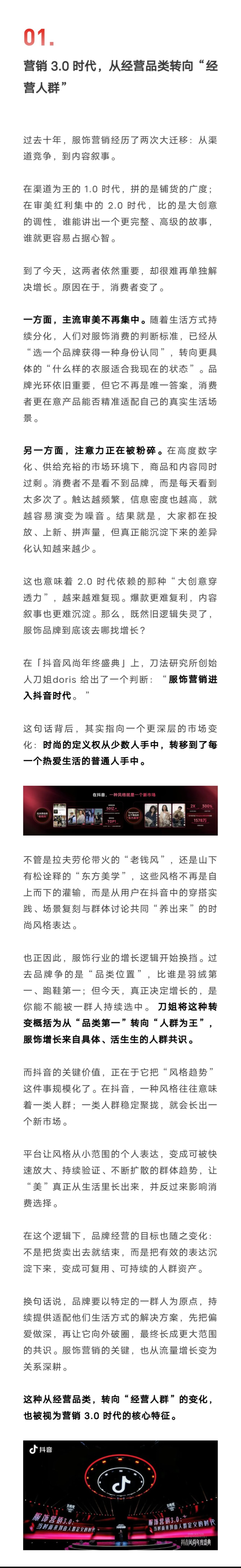 在近期举办的「抖音风尚年终盛典」上,刀姐doris 给出了一个判断:“服饰营销进入抖音时代。 ”一起来看看,营销 3.0 时代,服饰品牌如何从经营品类,转向“经营人群”?