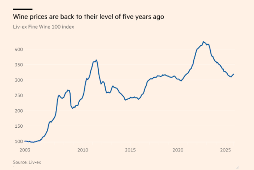 据葡萄酒交易平台Liv-ex的Fine Wine 100指数数据显示,到11月为止,葡萄酒价格今年已下跌2.8%,其中波尔多葡萄酒价格下降了6.6%,勃艮第葡萄酒下跌了4.4%,香槟价格也下跌了4.3%。这一波下跌使得葡萄酒价格回落至2020年底的水平,几乎完全抹去了疫情期间的涨幅。