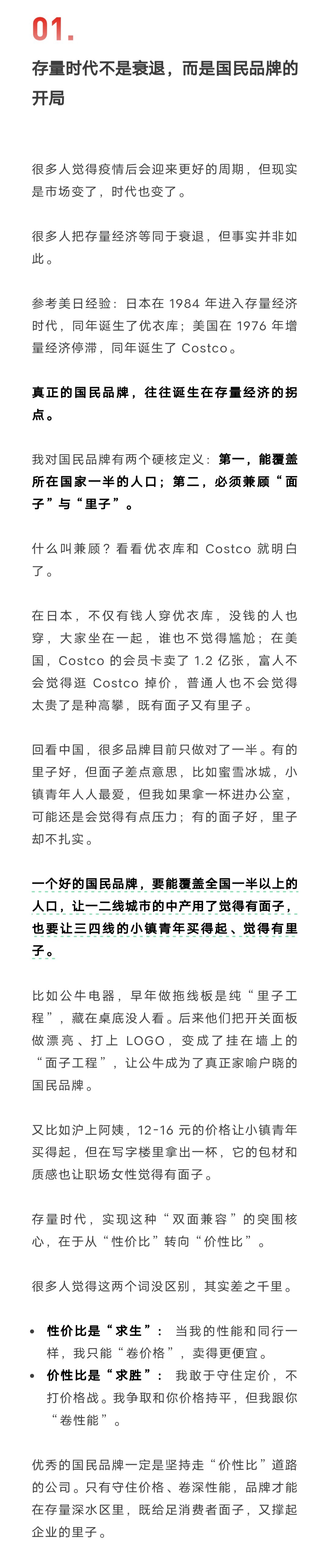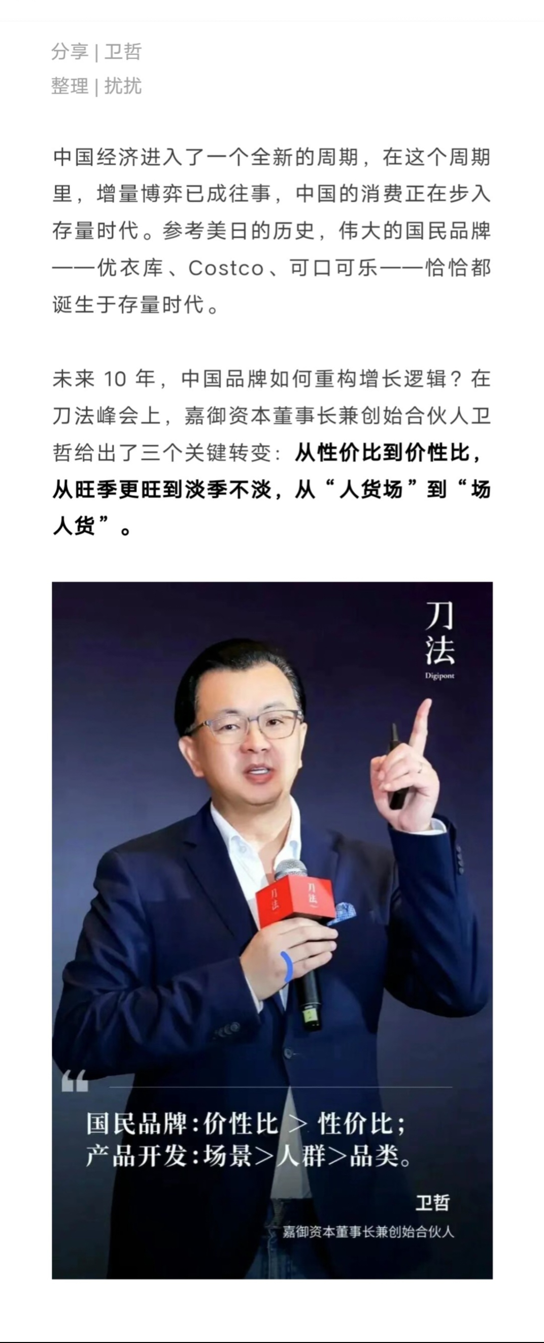 参考美日历史,优衣库、Costco、可口可乐这样的国民品牌都诞生于存量时代。如何打造国民品牌?嘉御资本董事长兼创始合伙人卫哲给出了三个关键转变:从性价比到价性比,从旺季更旺到淡季不淡,从“人货场”到“场人货”。