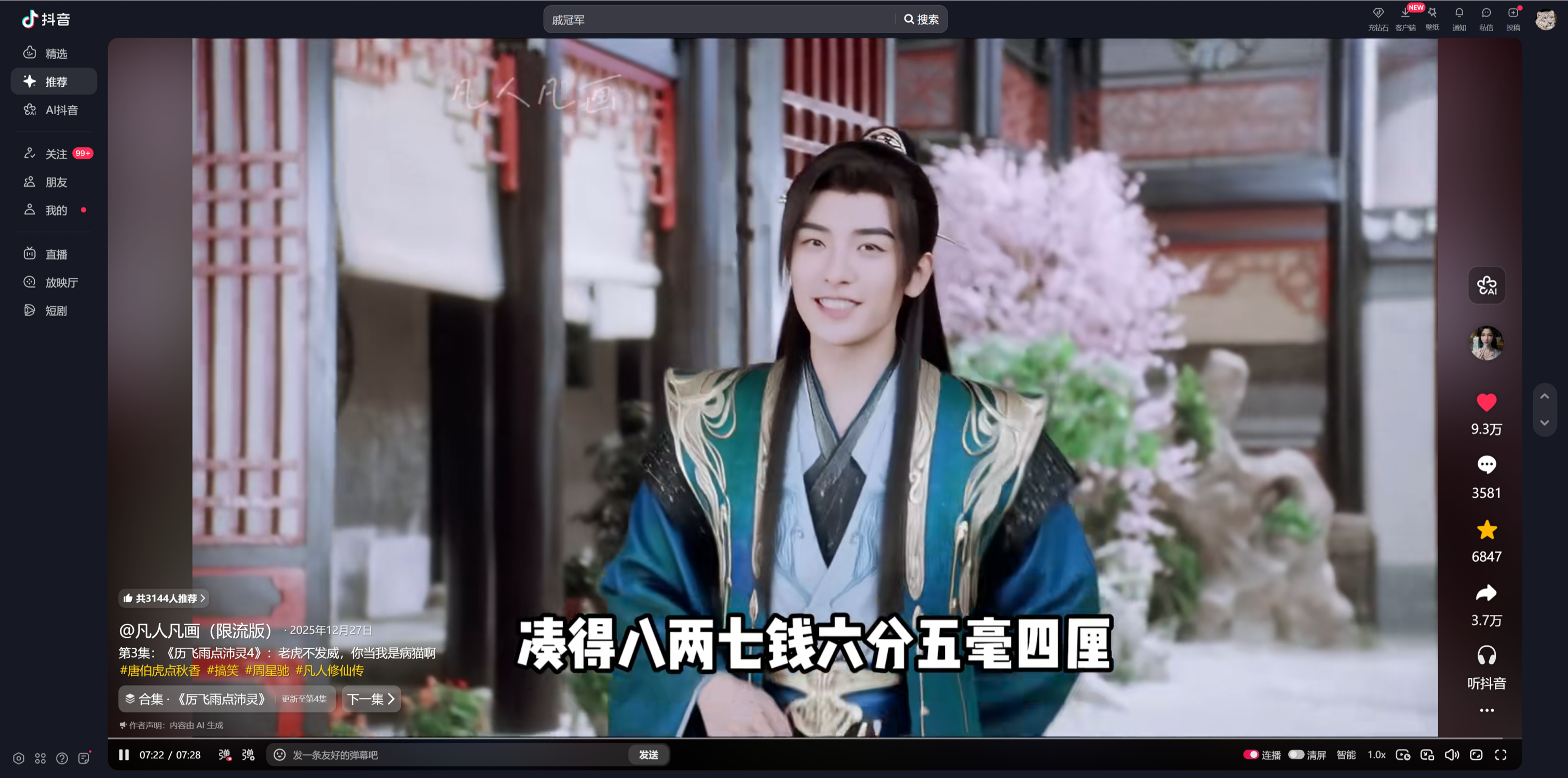 最近在抖音、B站刷到很多凡人的二创,都是用动画里的建模+经典老片的剧情魔改(周星驰、爱情公寓、周润发等),再加上AIGC的能力,看着都非常爽,很快能GET到剧情。这可能是一种未来快速创造memo的方式,即用一些有情感共情的形象、剧情,来进行桥接。 并且这些IP大部分都诞生于十几二十年前。 因为只有在十几年前那个内容相对更稀缺的年代,才会有大量的作品能诞生群体共鸣。 自从进入短视频时代之后,因为供给侧的井喷式爆发,已经很难形成有小范围共鸣的内容了,即使诞生,也会因为传播速度太快而被各种监管封杀(例如雪豹闭嘴?)
