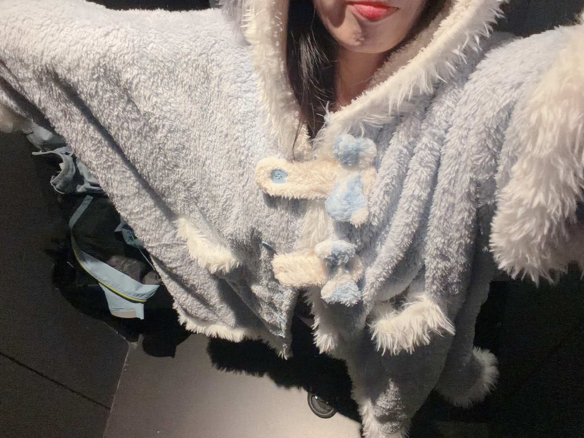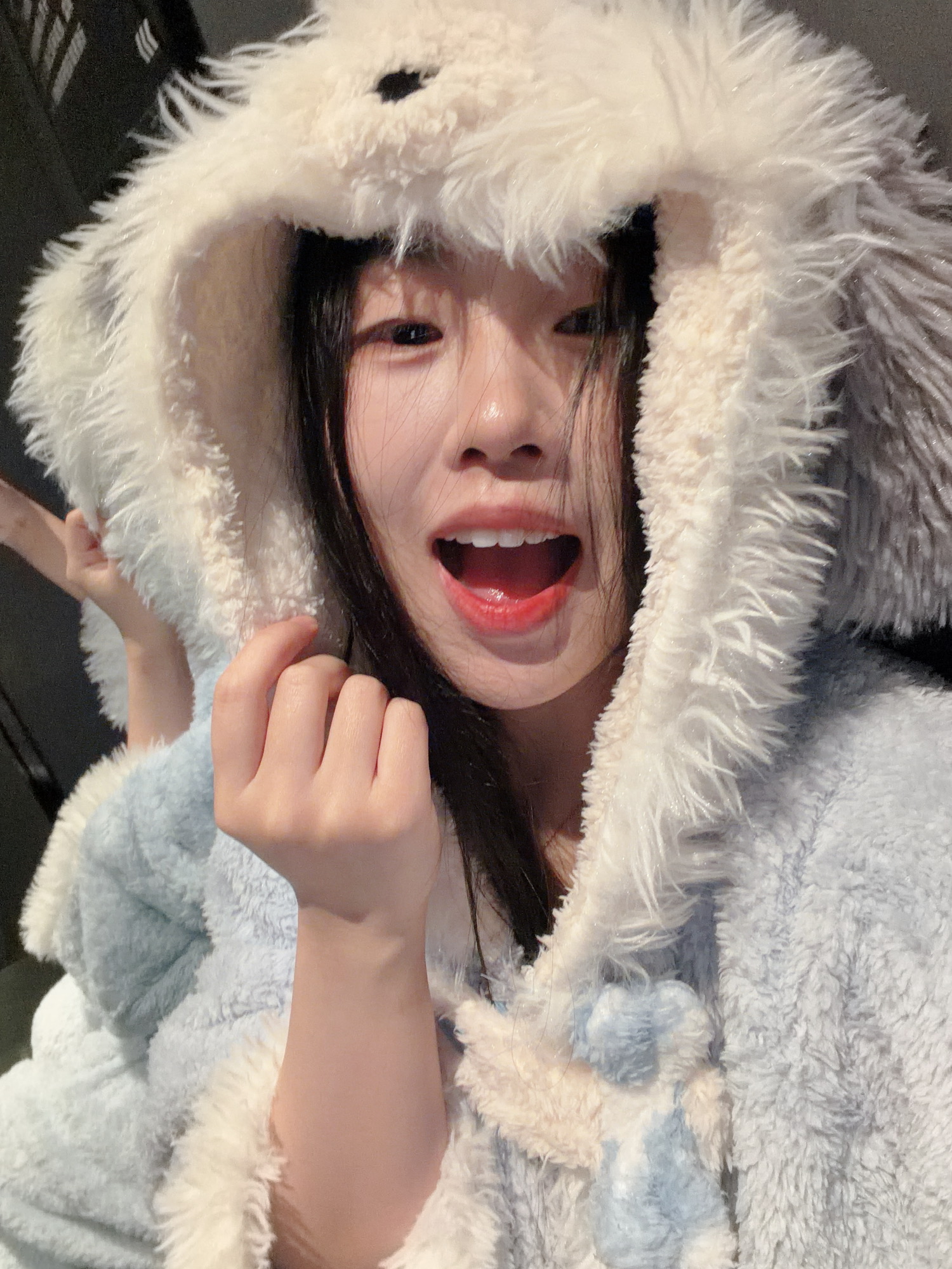 感觉后脖颈子冷,于是就有了这种穿着短袖戴毛茸茸背帽的造型