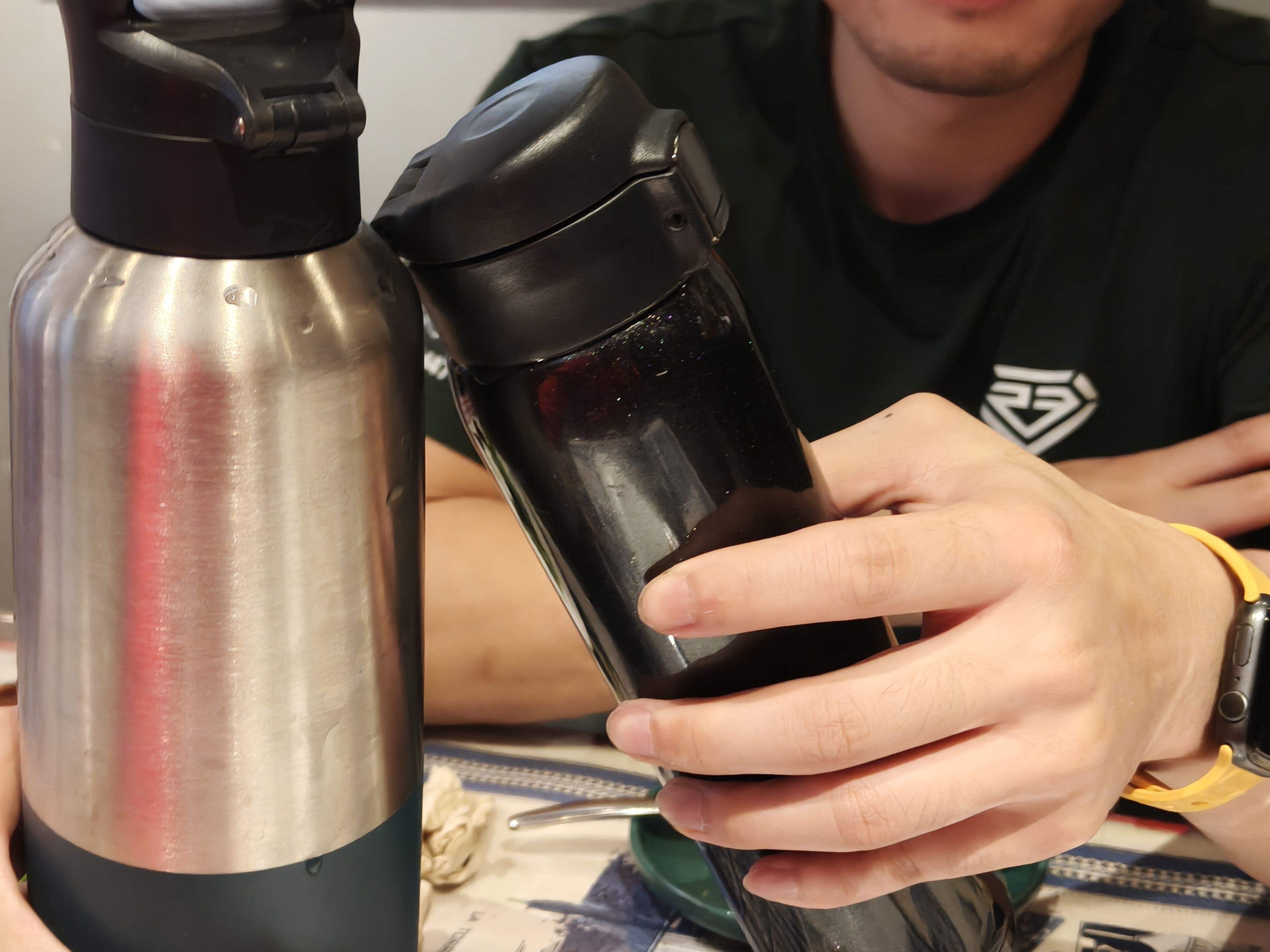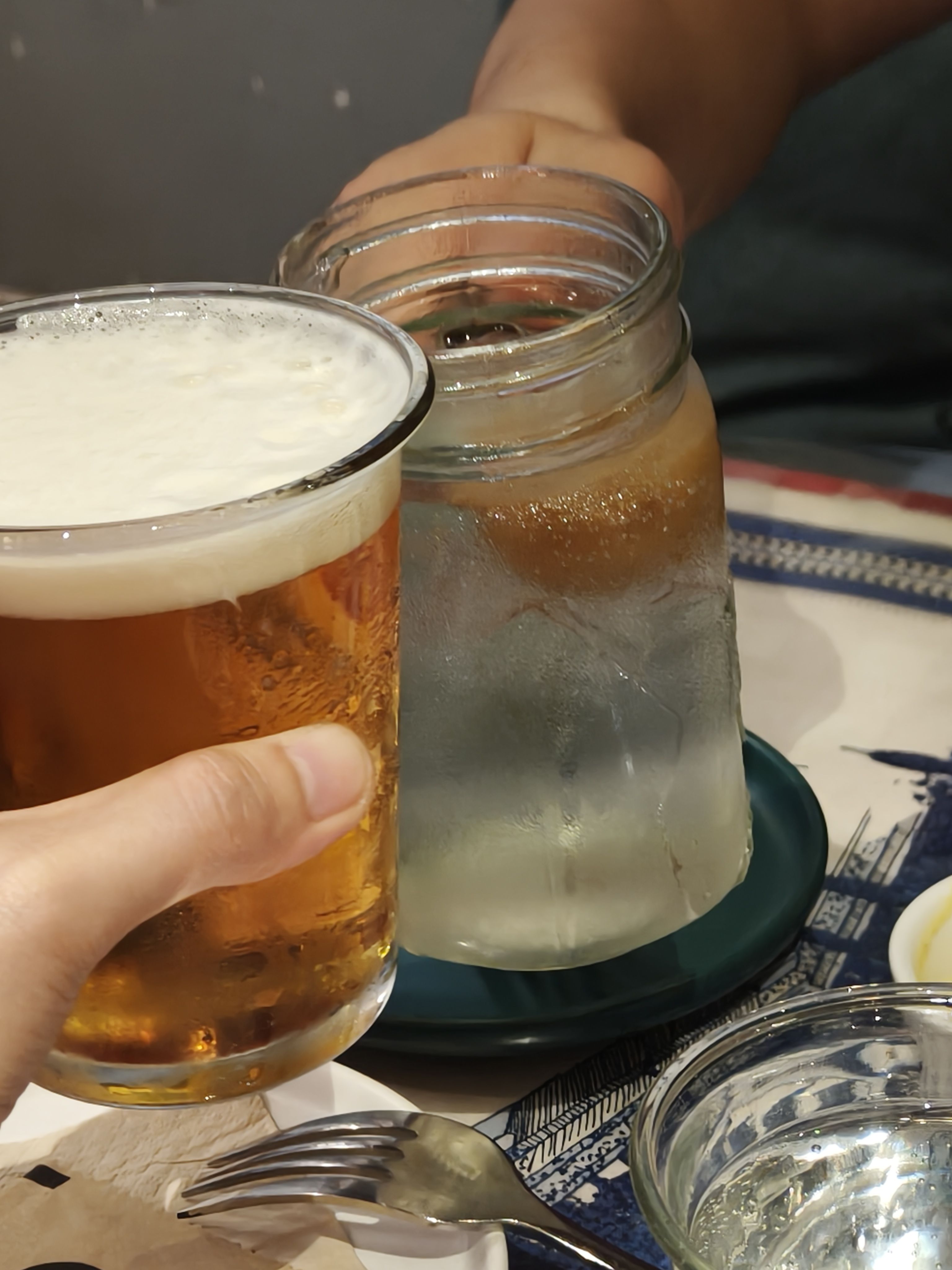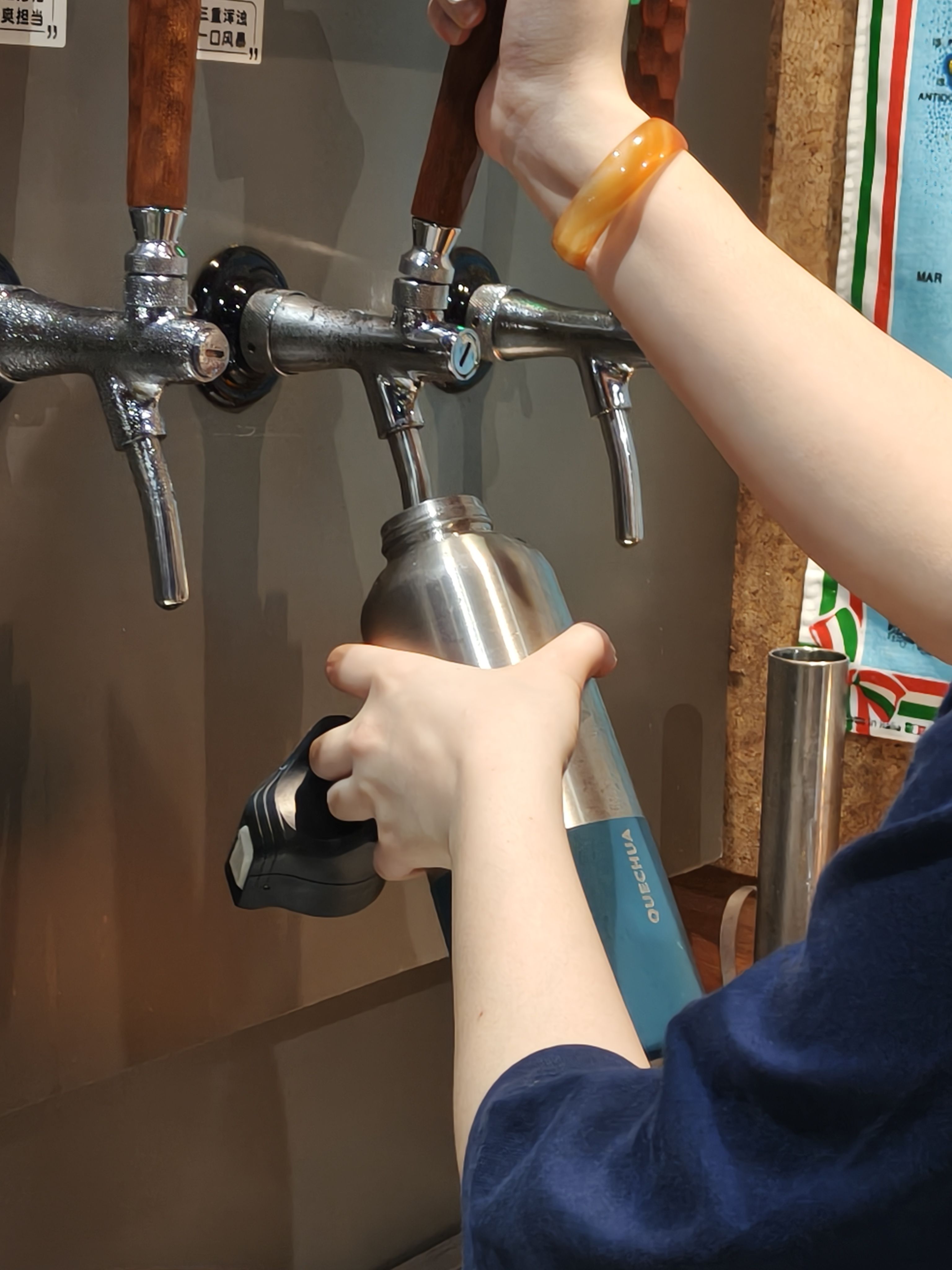 选啤酒的时候和老板边聊酿酒知识和啤酒花风味,边尝了五六种酒,最后选定了台风的得奖产品和三鸟ipa,司机吃饭的时候不能喝酒,我们还特意带了两个大保温杯过来,喜提保温杯打包啤酒经验值。倒也不是为了保温,主要是把啤酒的气保住,这样开车几十公里到家还能喝上最原汁原味的好酒!