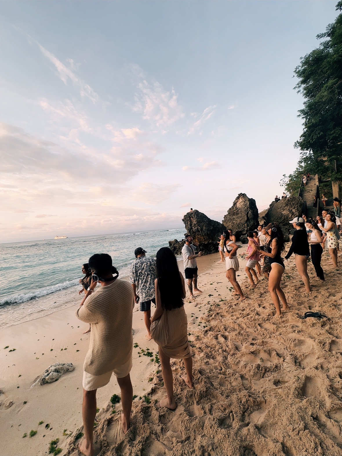 沙滩上是随音乐舞动的亲友
