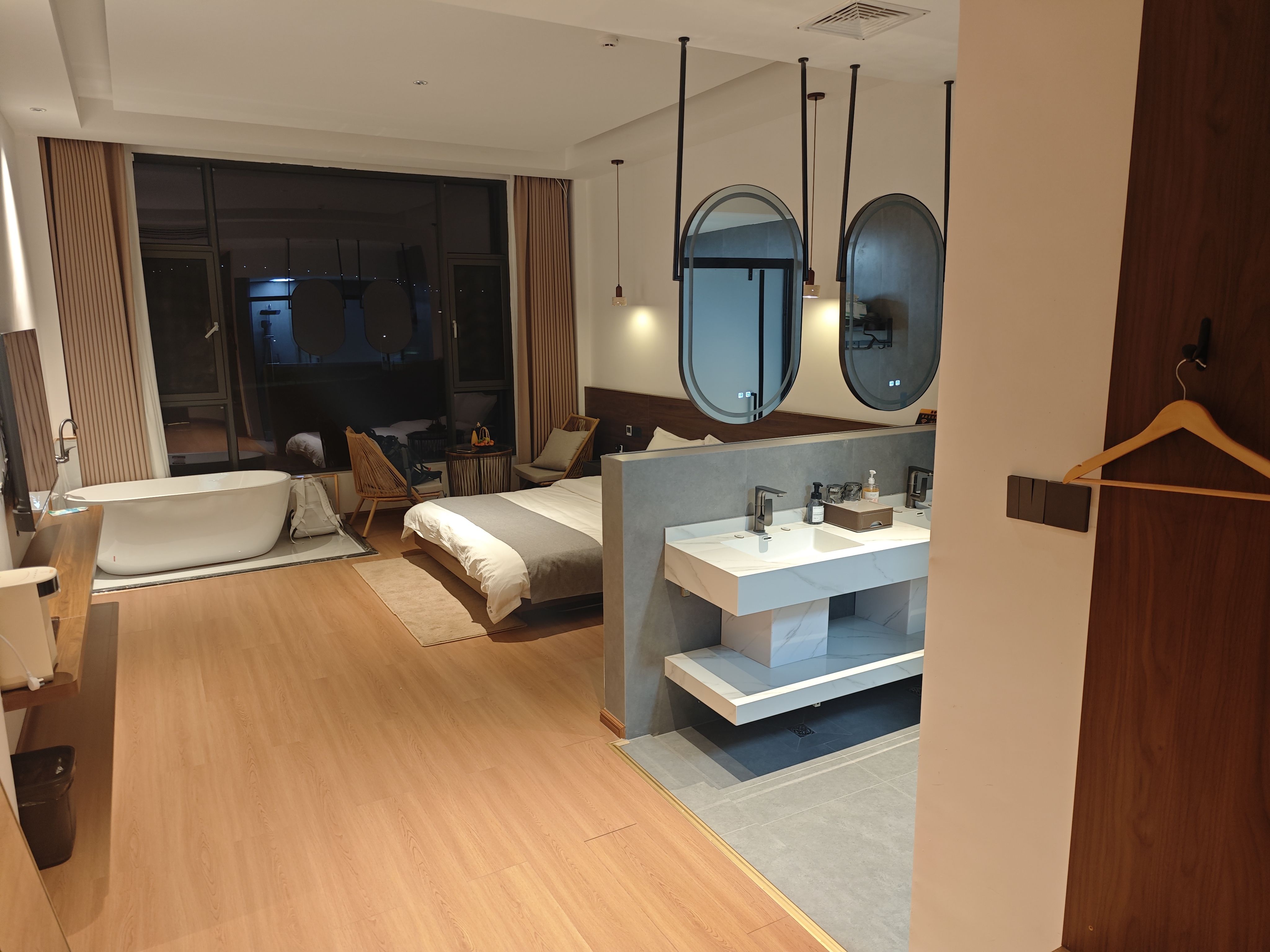 想特意夸的是:这次我住了两个房型,风格差异很清晰。一个是舒适型,就小小的,配了两个洗漱台,配的大电视。另一个是景观房,就果断放弃了一个洗漱台,电视换成了投影,做成了两面窗户加一面阳台。