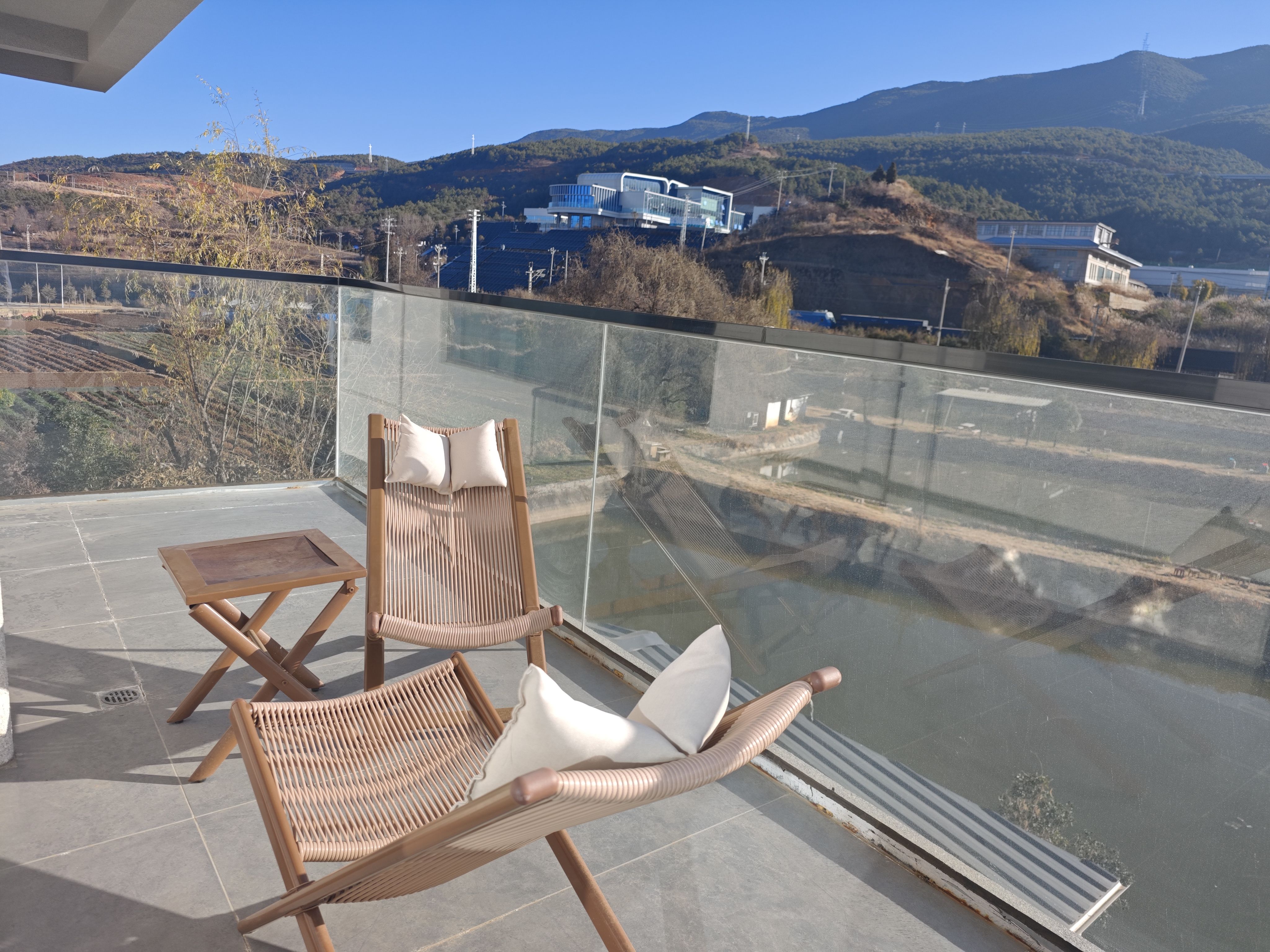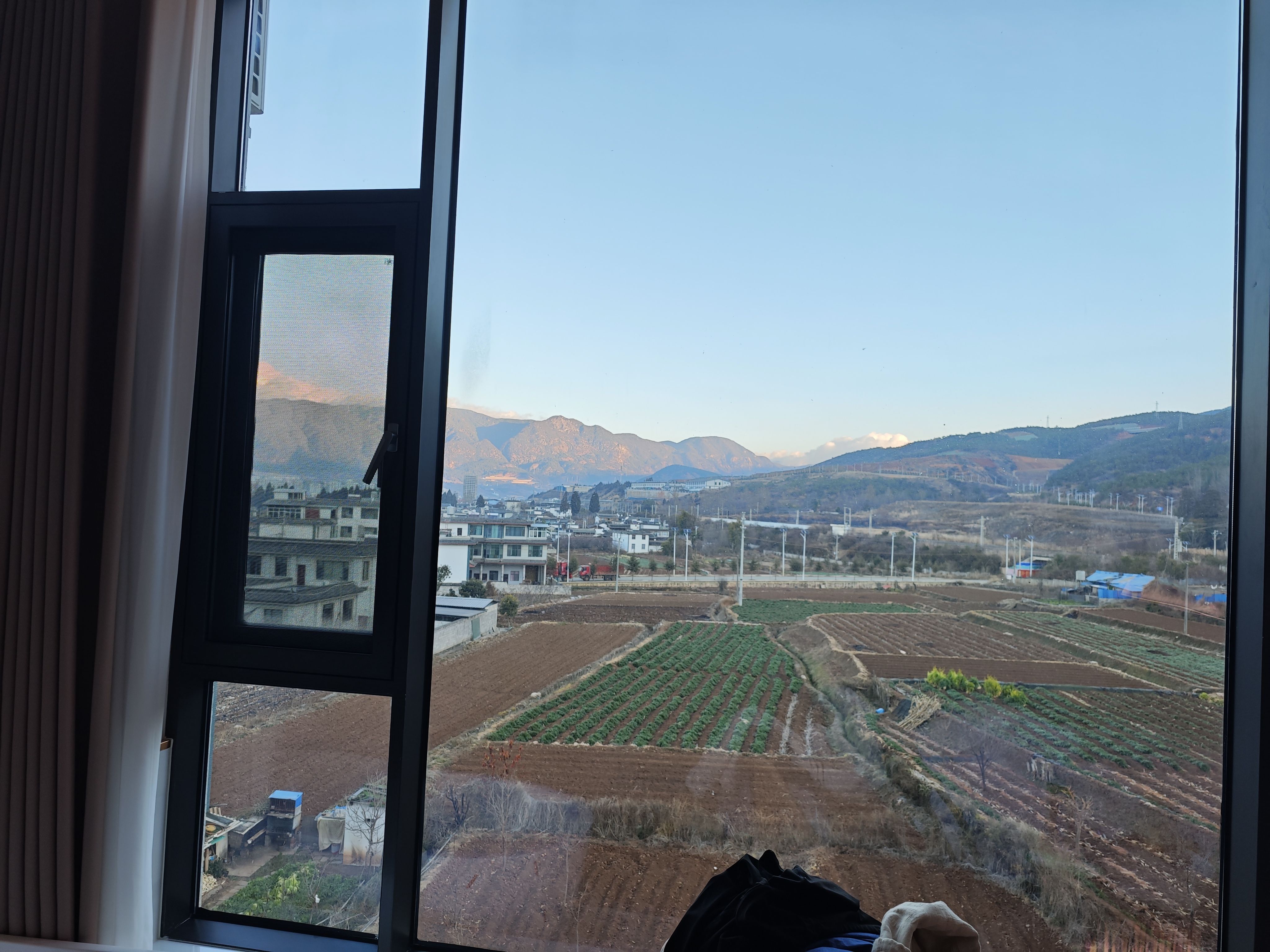 在距离古城8公里的地方,人少车少。窗户也厚,睡觉安静。窗景有山,不过冬天,秃秃的。