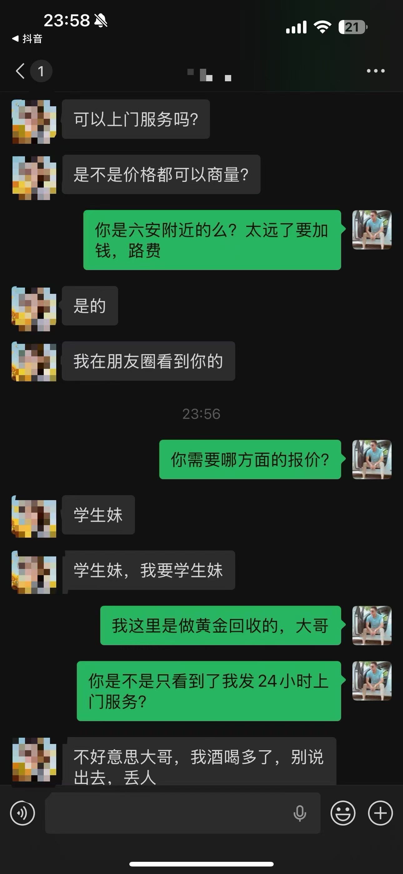 终于有人问上门服务的话,是不是价格可以商量,他说最好是六安附近,如果距离六安远的话要加钱。
