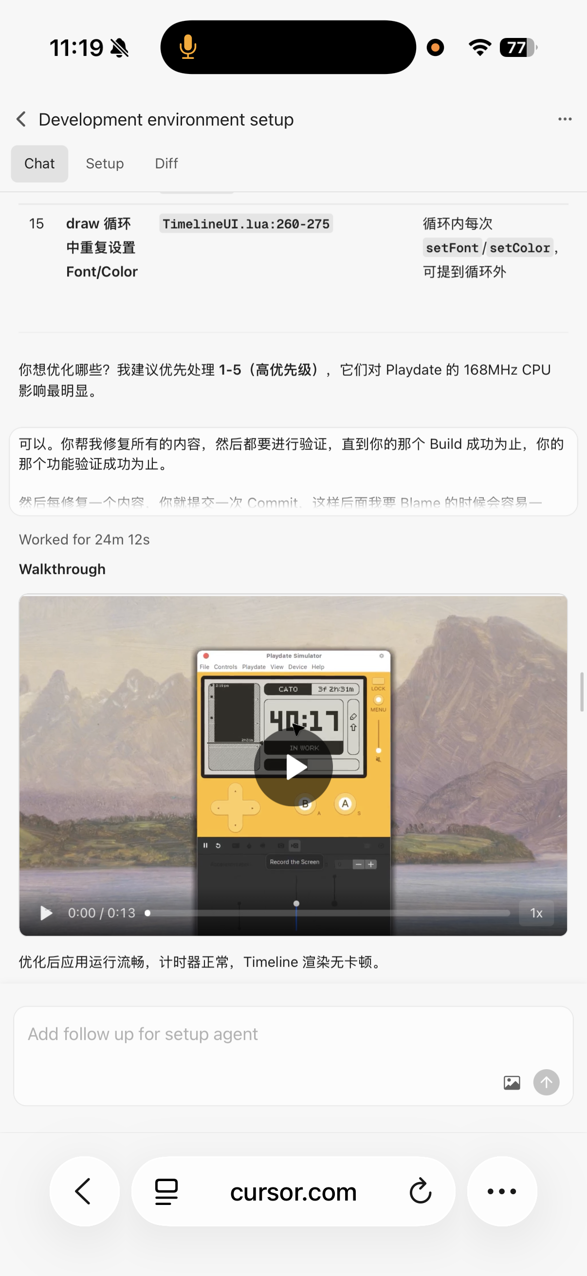 上个月看到这个云端 Cursor 就随便试了一下,它能自己搭环境跑 Playdate 模拟器,把我的 bug 都修了,最后还会录一段操作视频给我验收,真闭环了!用手机就能派活到验收。