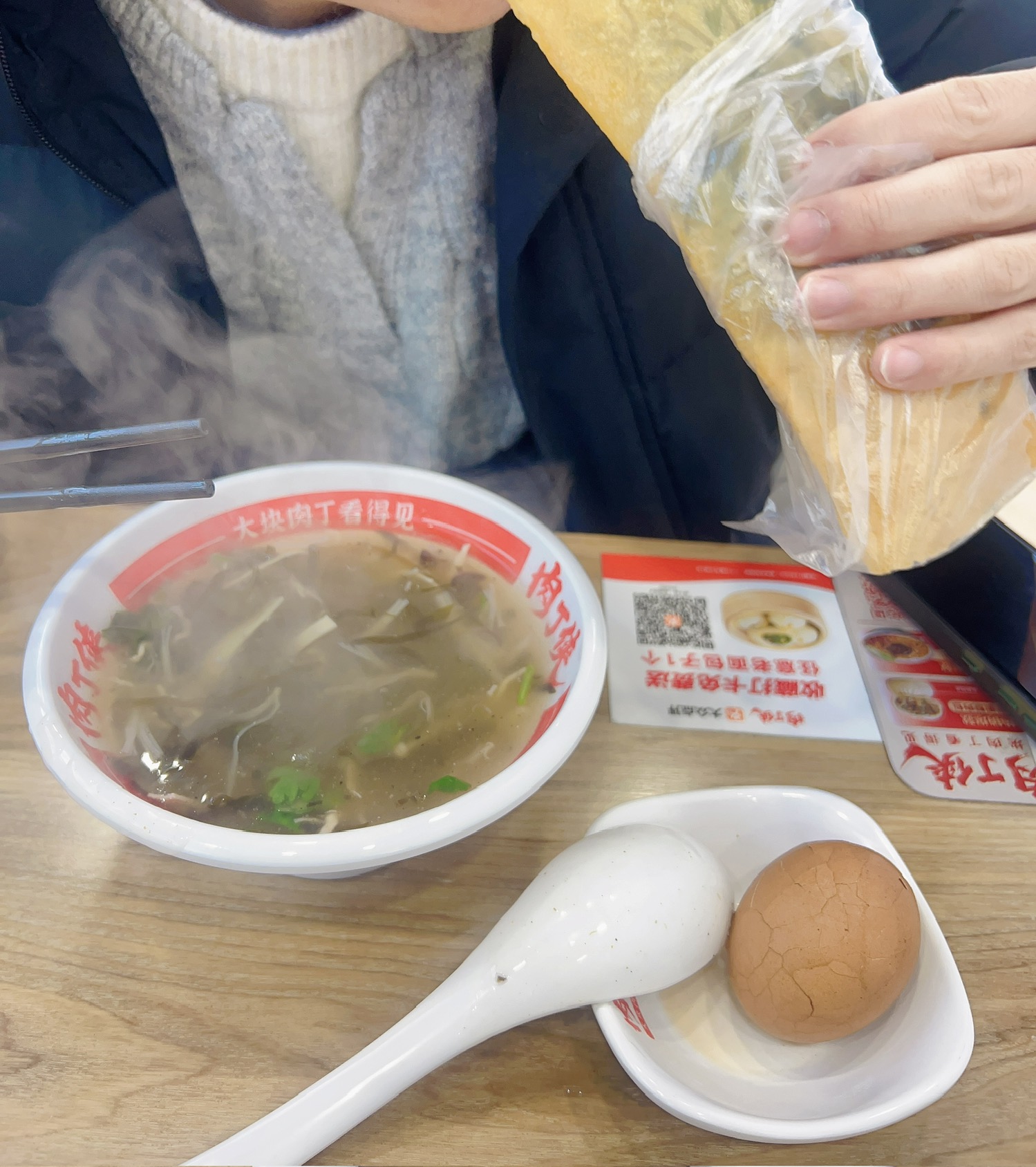 在早点店,我给他的早饭买好端上来后。