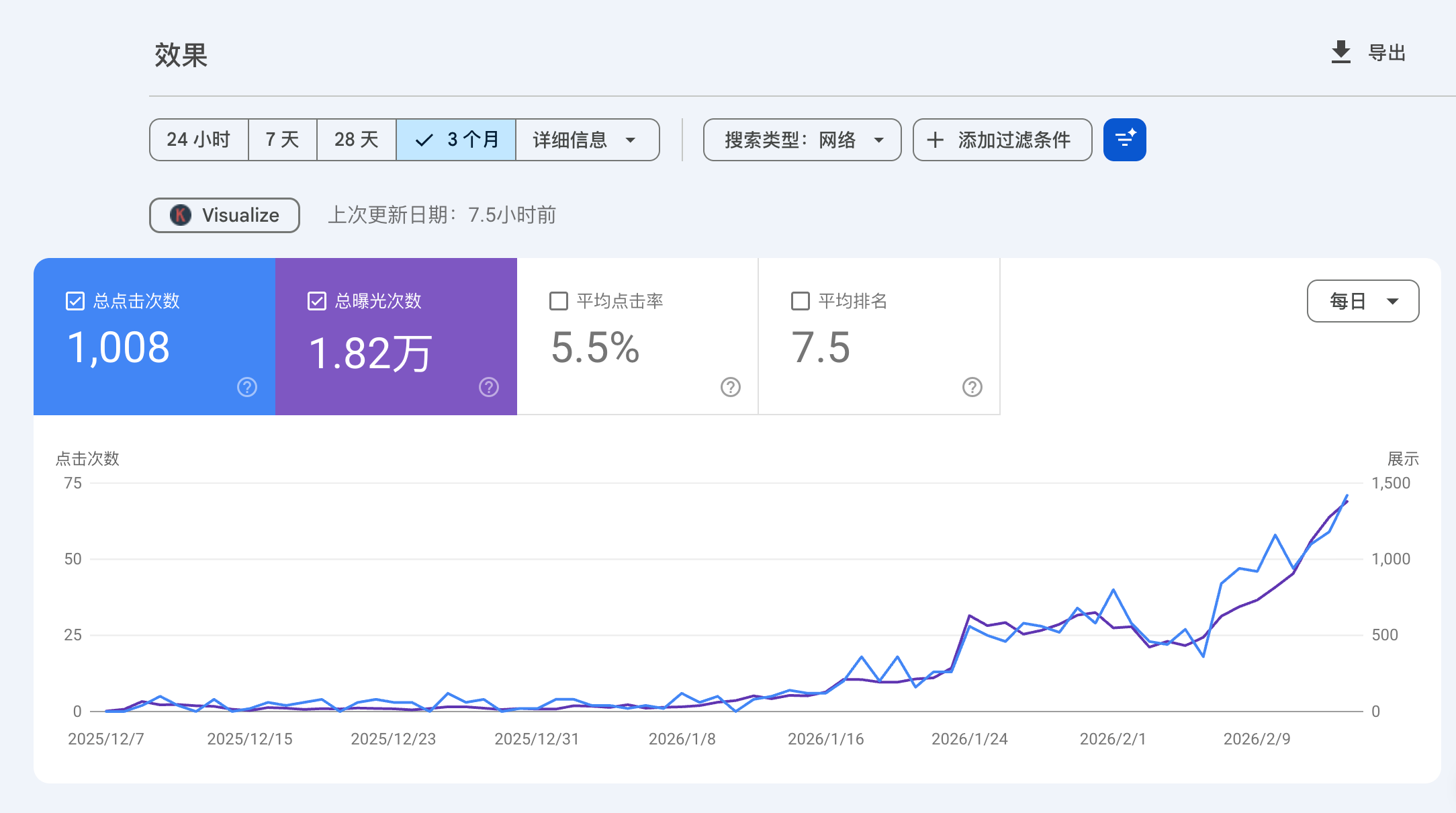 1 月初,也就是27 天前优化了这个老站,流量就开始慢慢上升,到现在日展现终于破千~