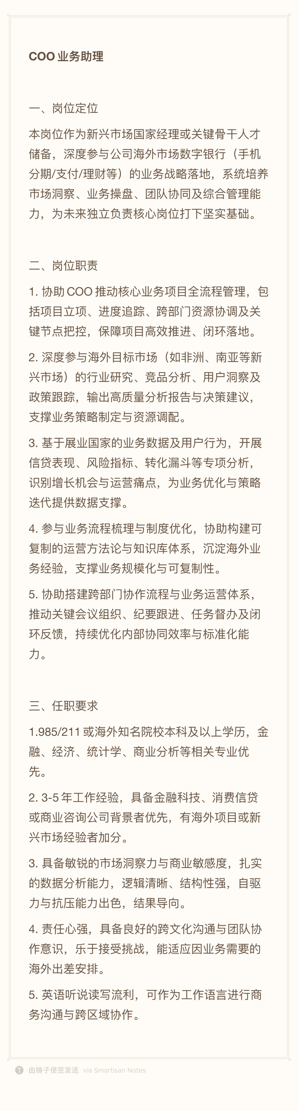 要求3-5年以上工作经验,具备金融科技、消费信贷或商业咨询公司背景者优先,有海外项目或新兴市场经验者加分,英语可作为工作语言进行商务沟通与跨区域协作。