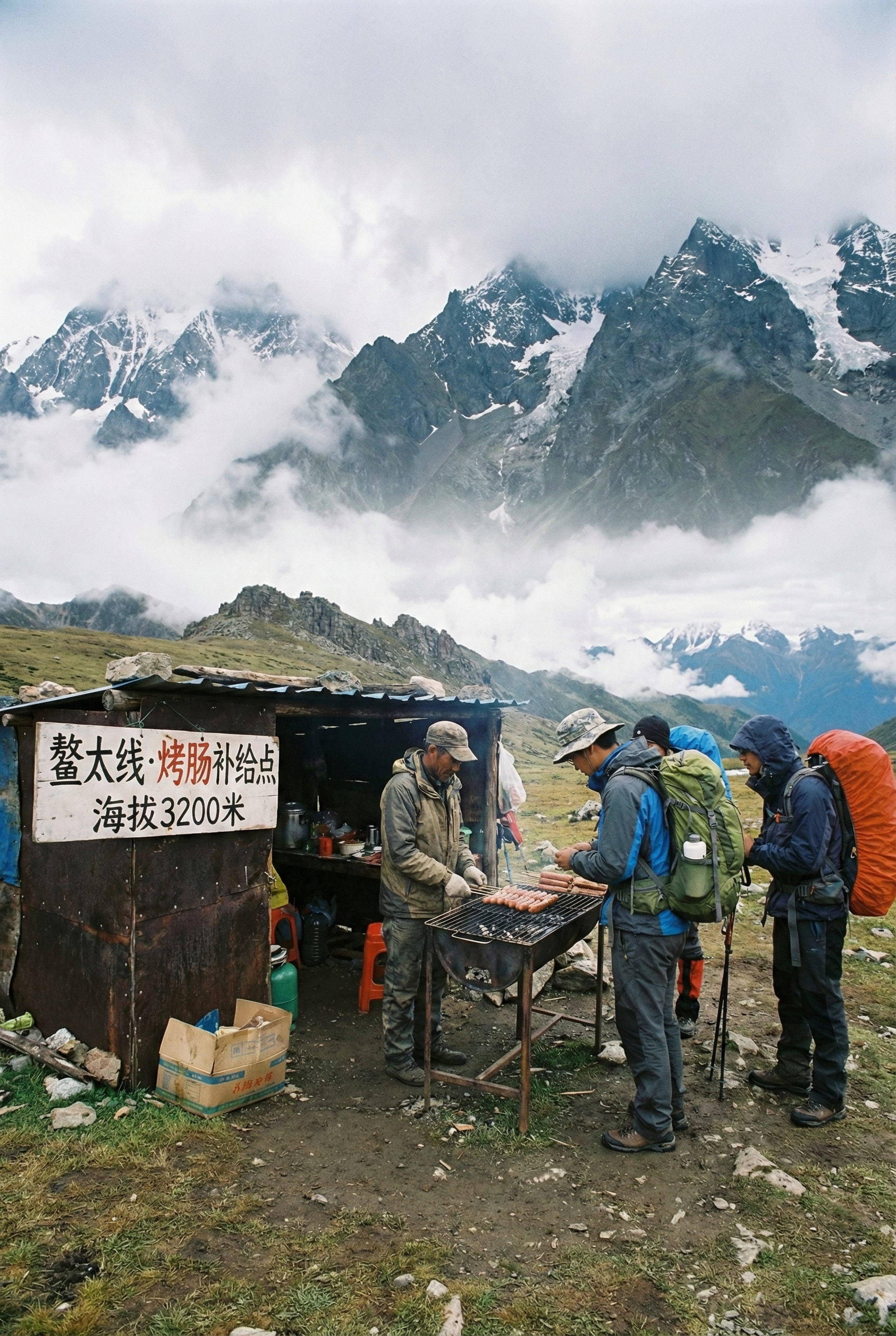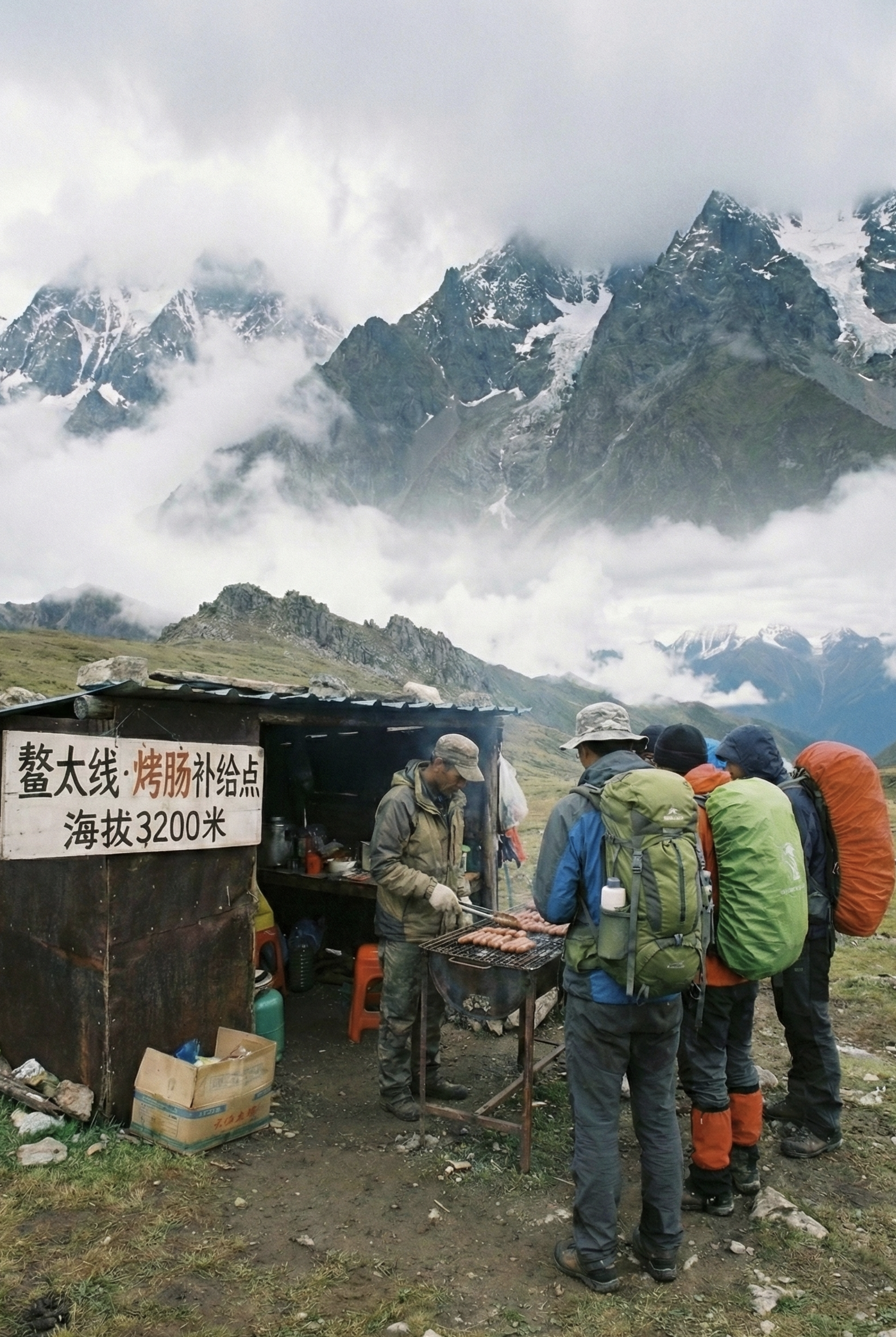 1️⃣生成一张在鳌太线上卖烤肠的摊位照片,2:3比例。