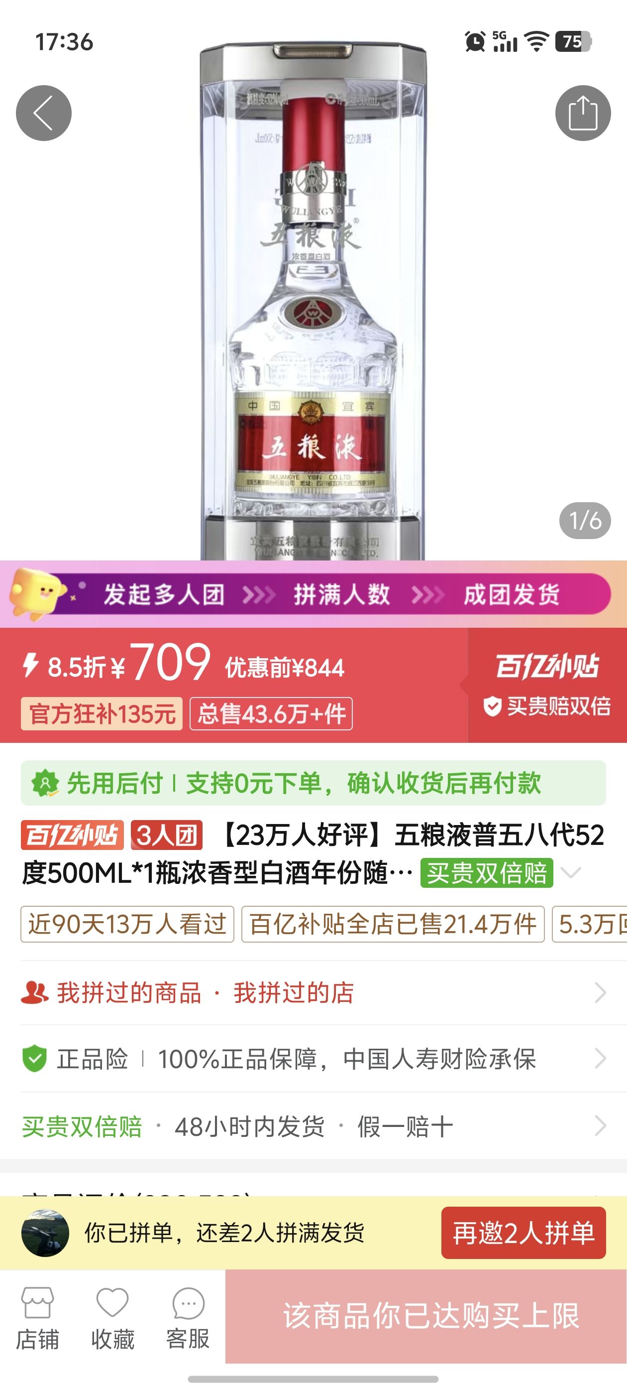 0:/⇥5ErzFKyk2g8W9⇤ 复制并打开拼多多APP,709元拼团购买五粮液普五八代52度500ML*1瓶浓香...,仅剩2个名额