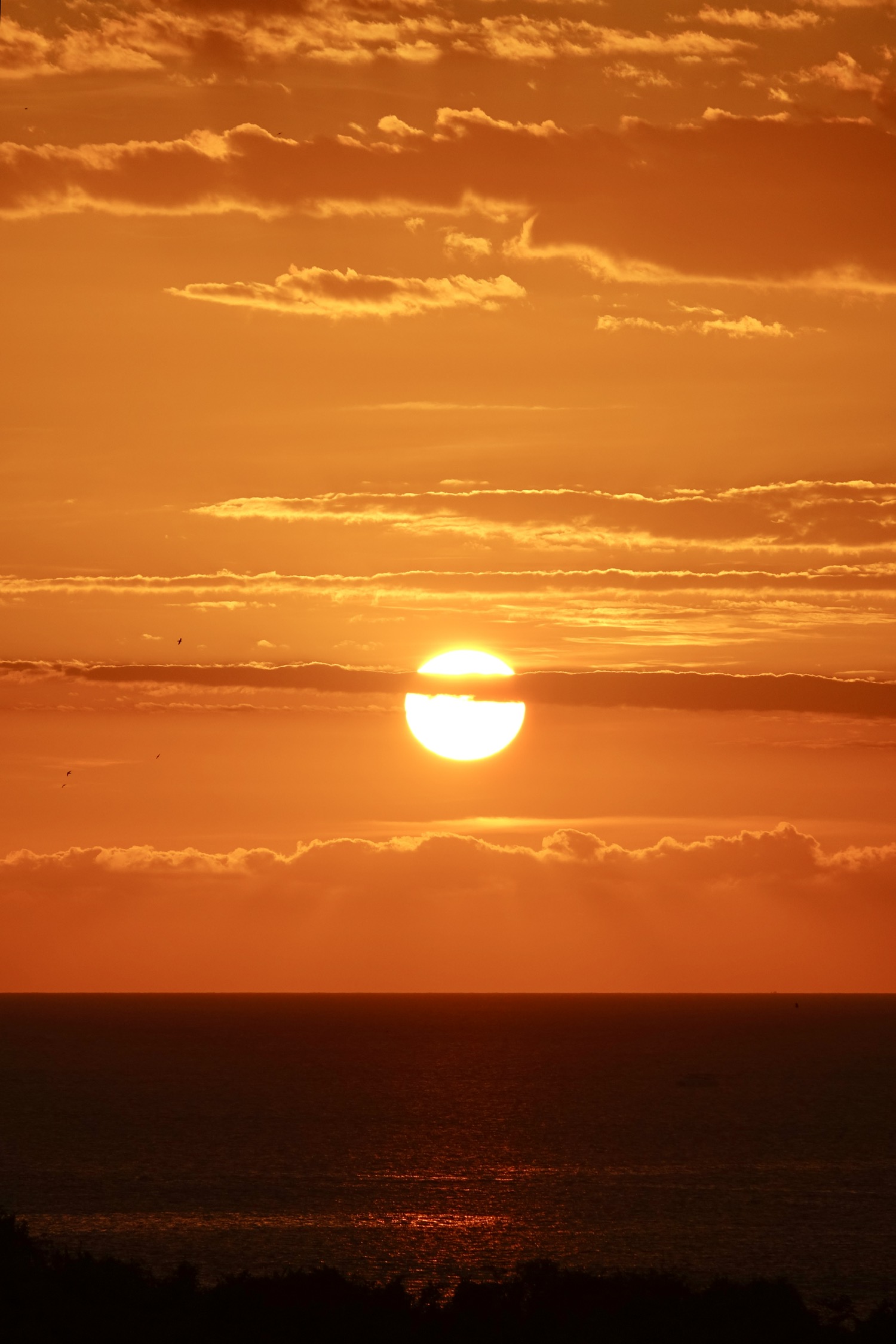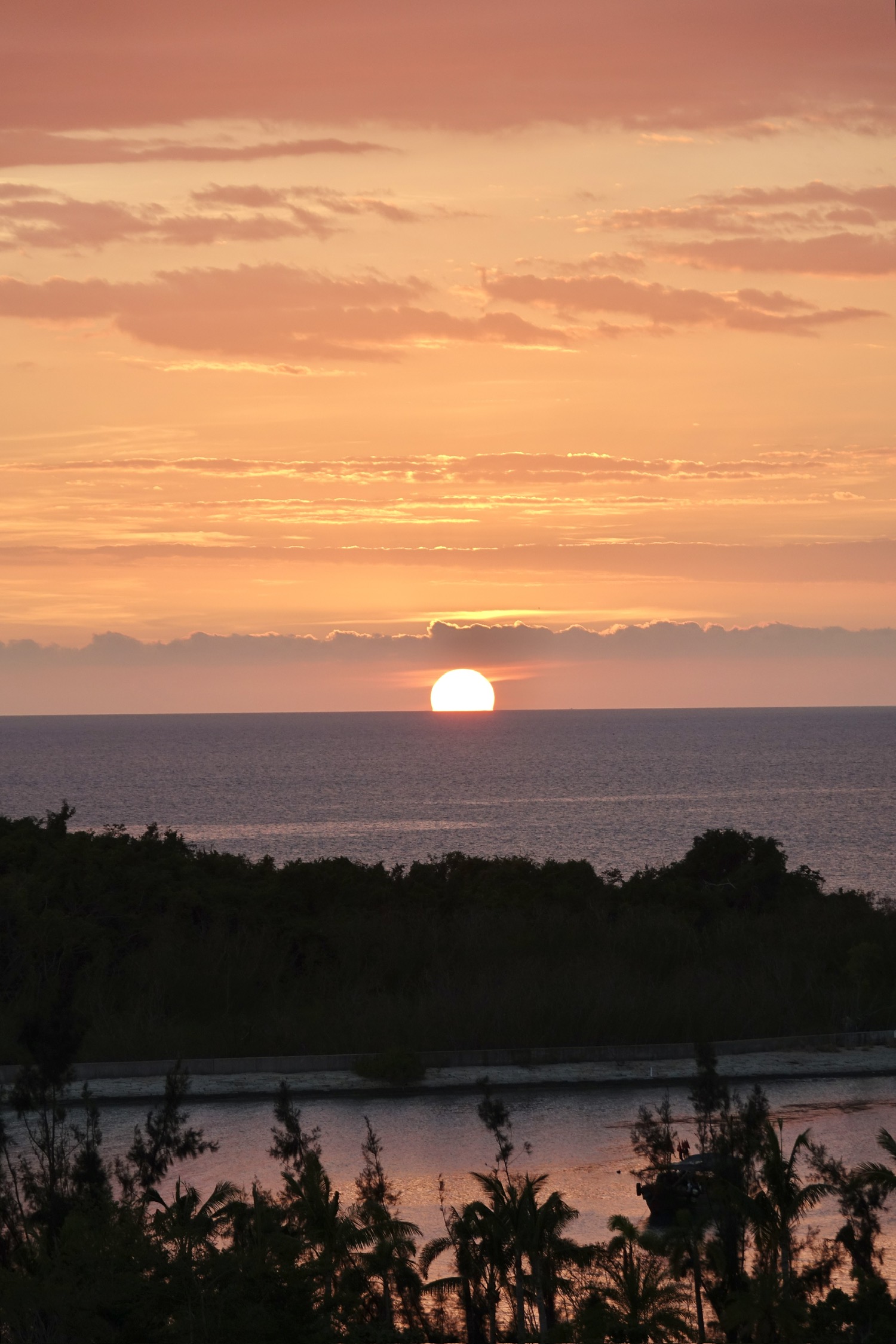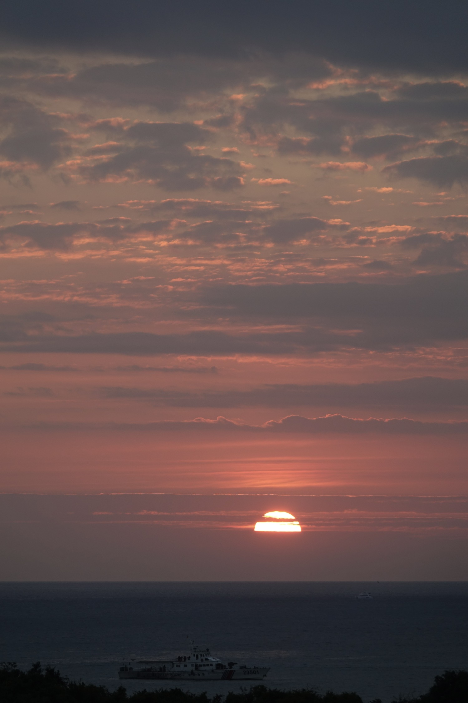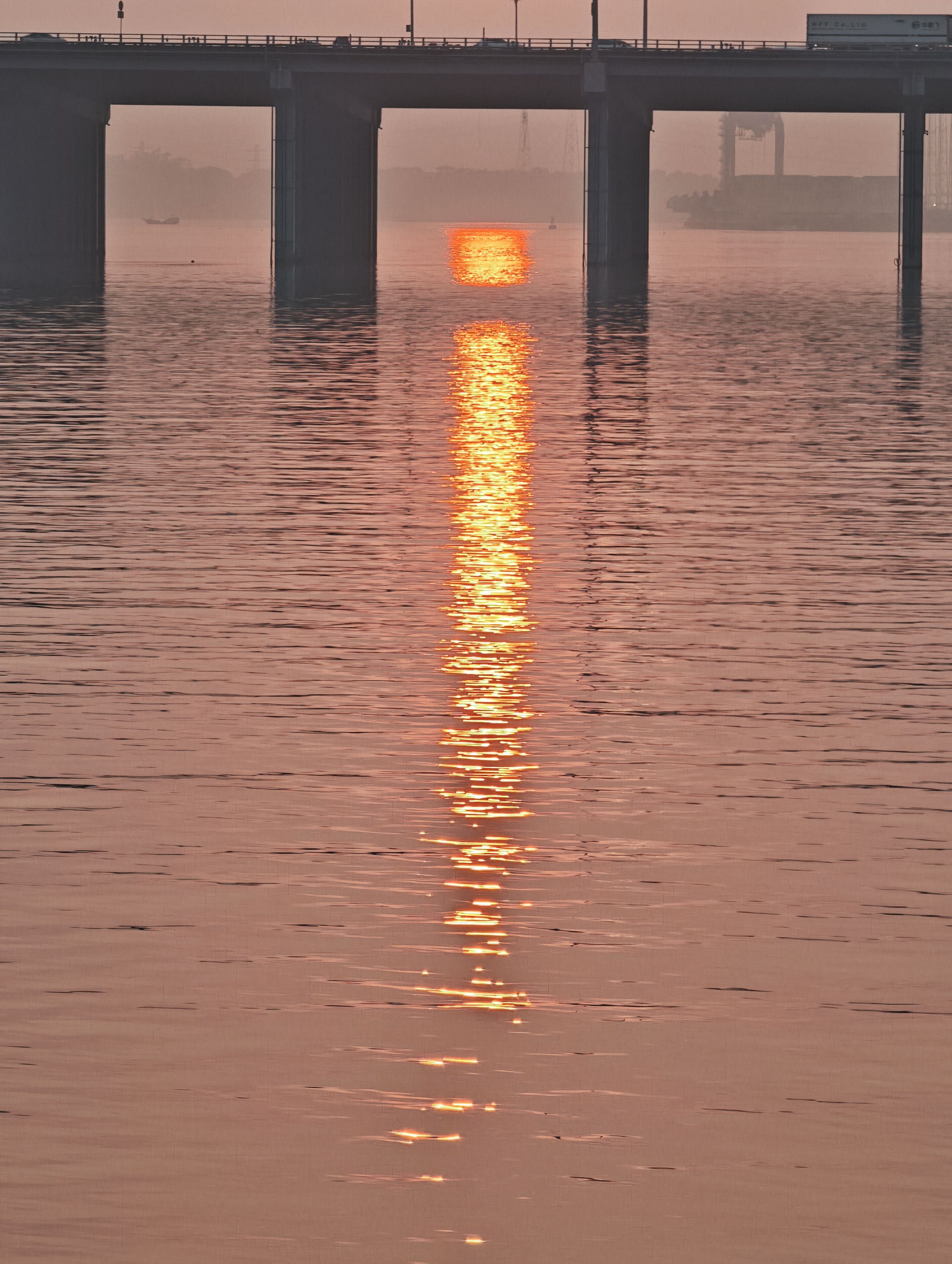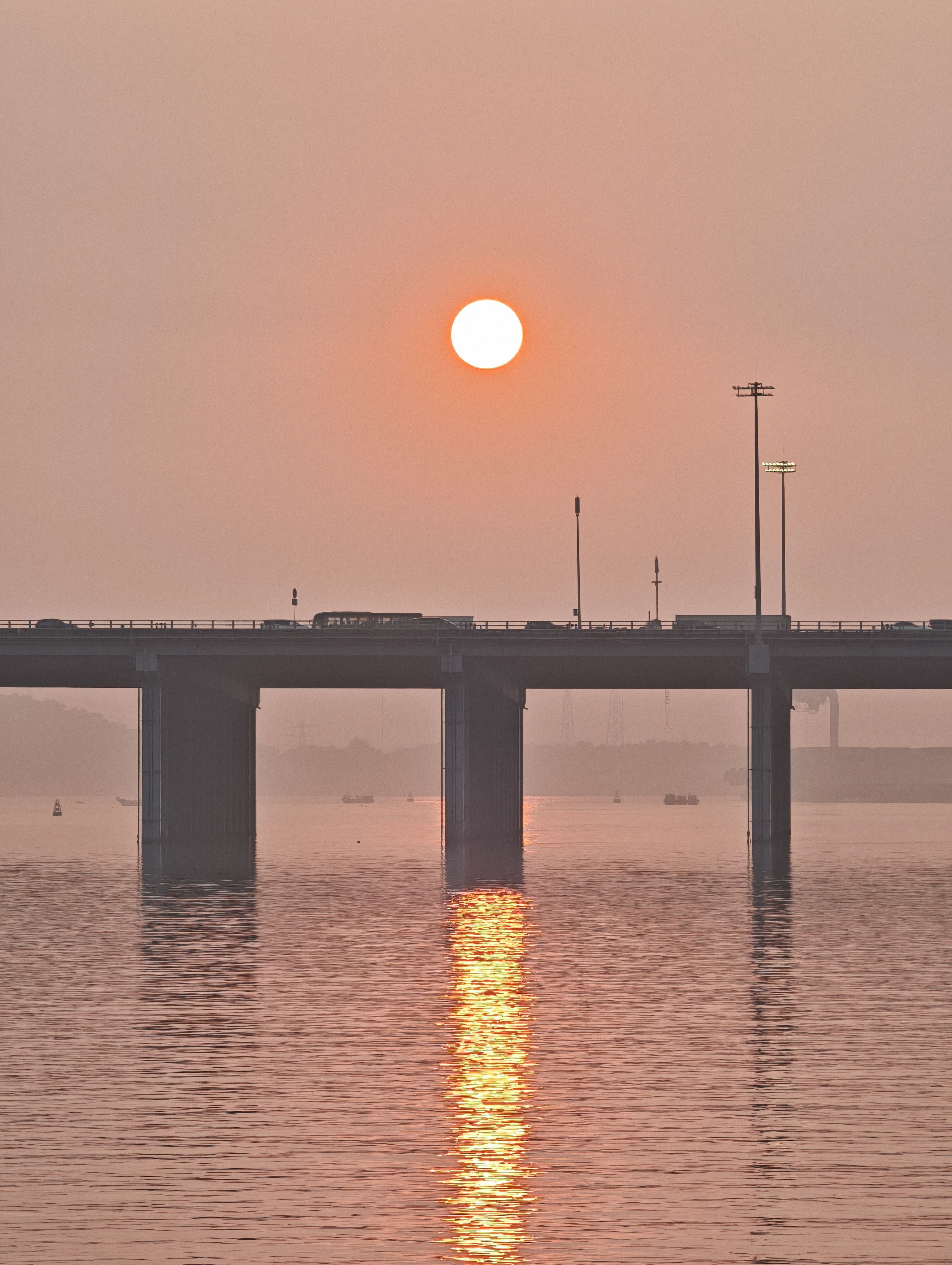 日落时分海上天上有朦胧的雾,落日的橙红不再那么浓烈,有种温柔静谧的美。