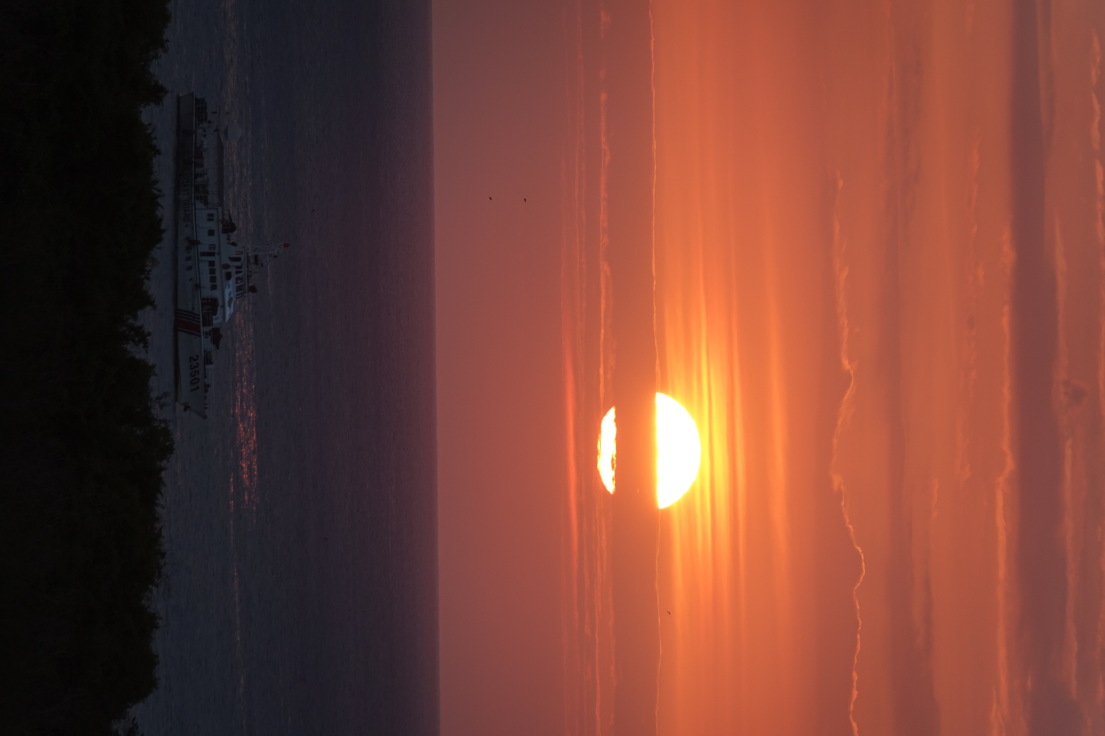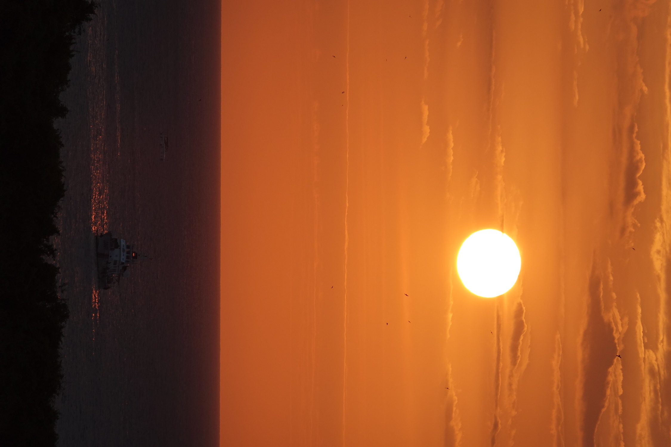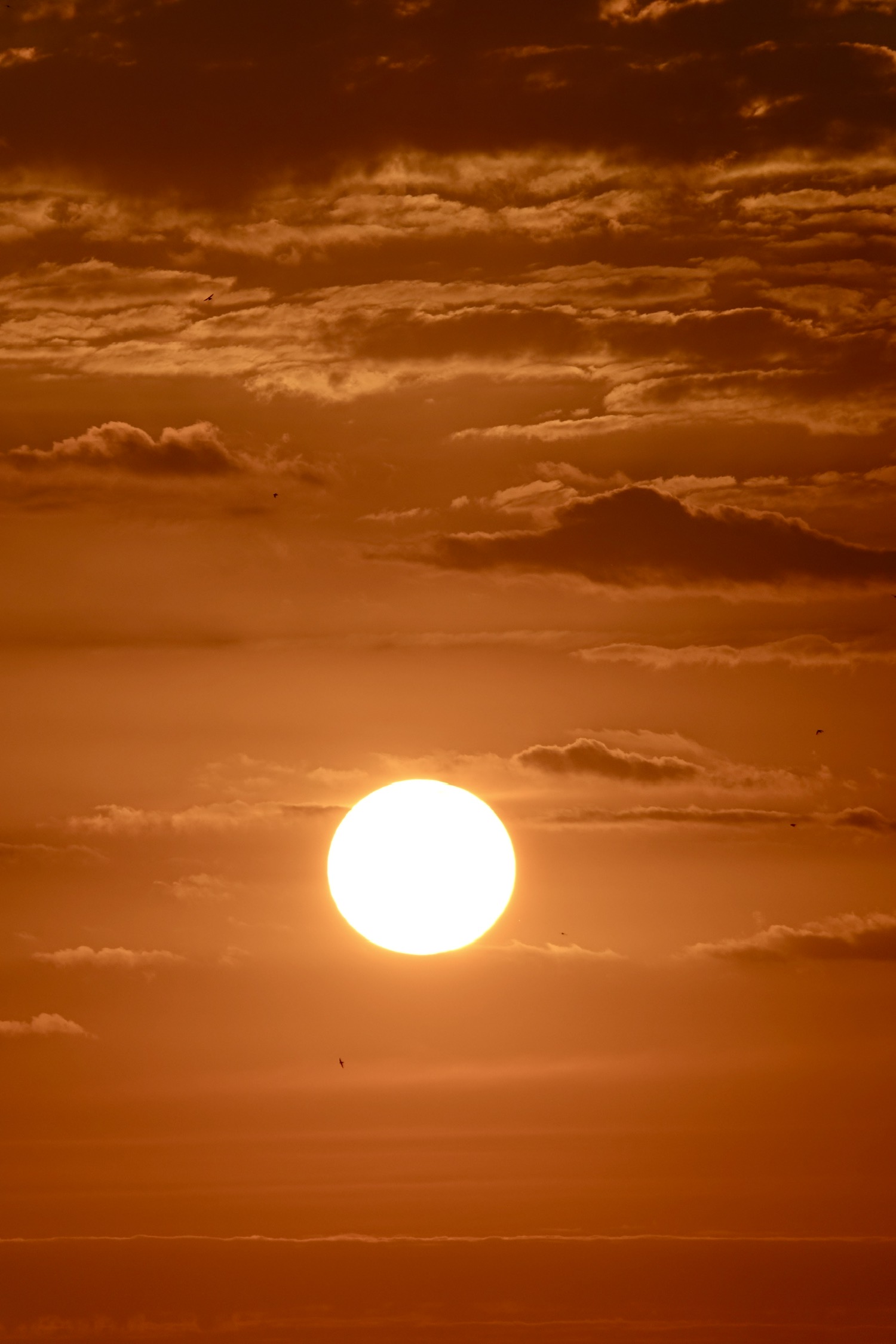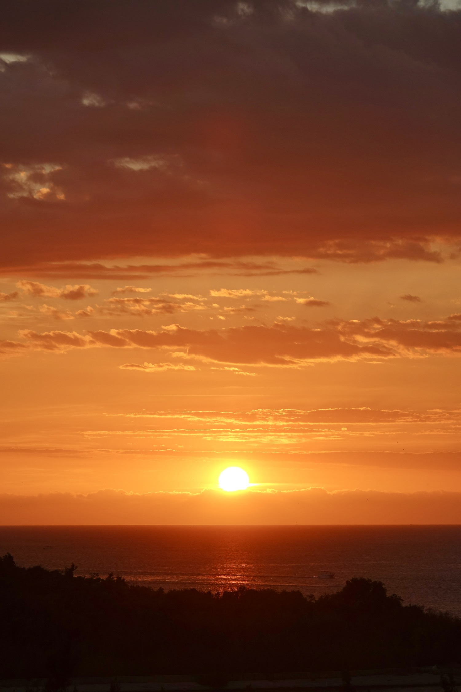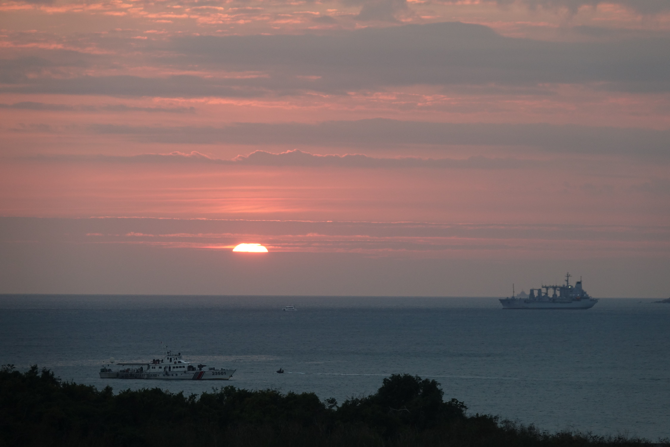 日落时分海上天上有朦胧的雾,落日的橙红不再那么浓烈,有种温柔静谧的美。