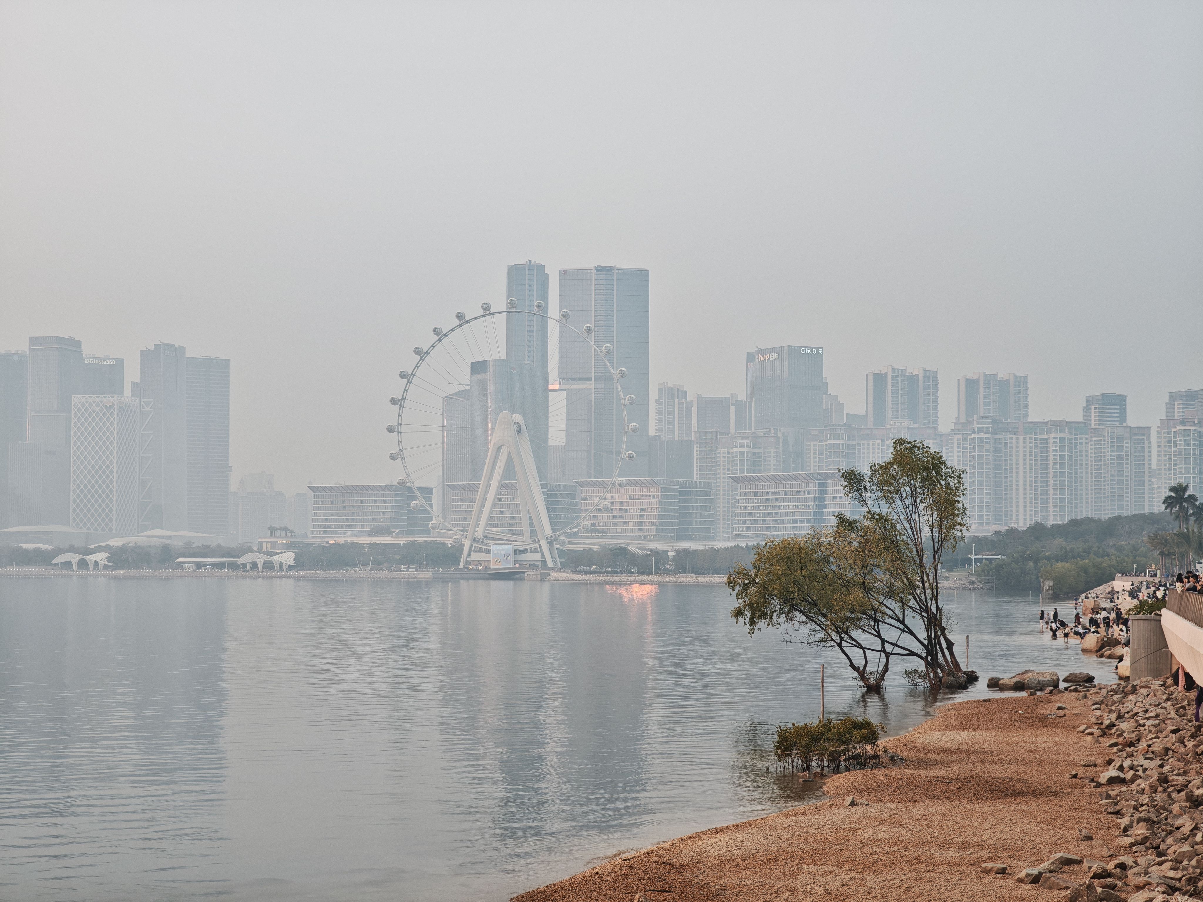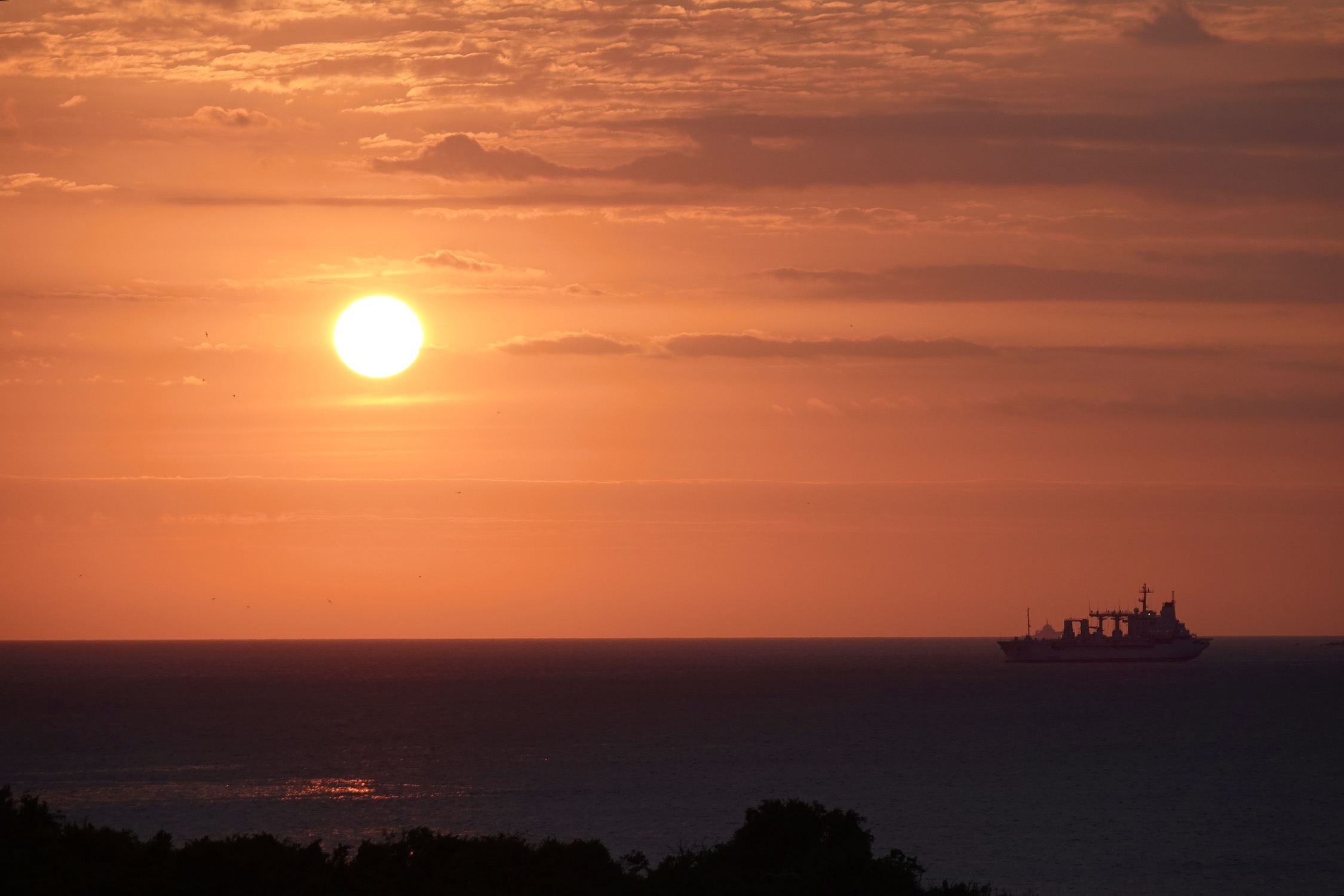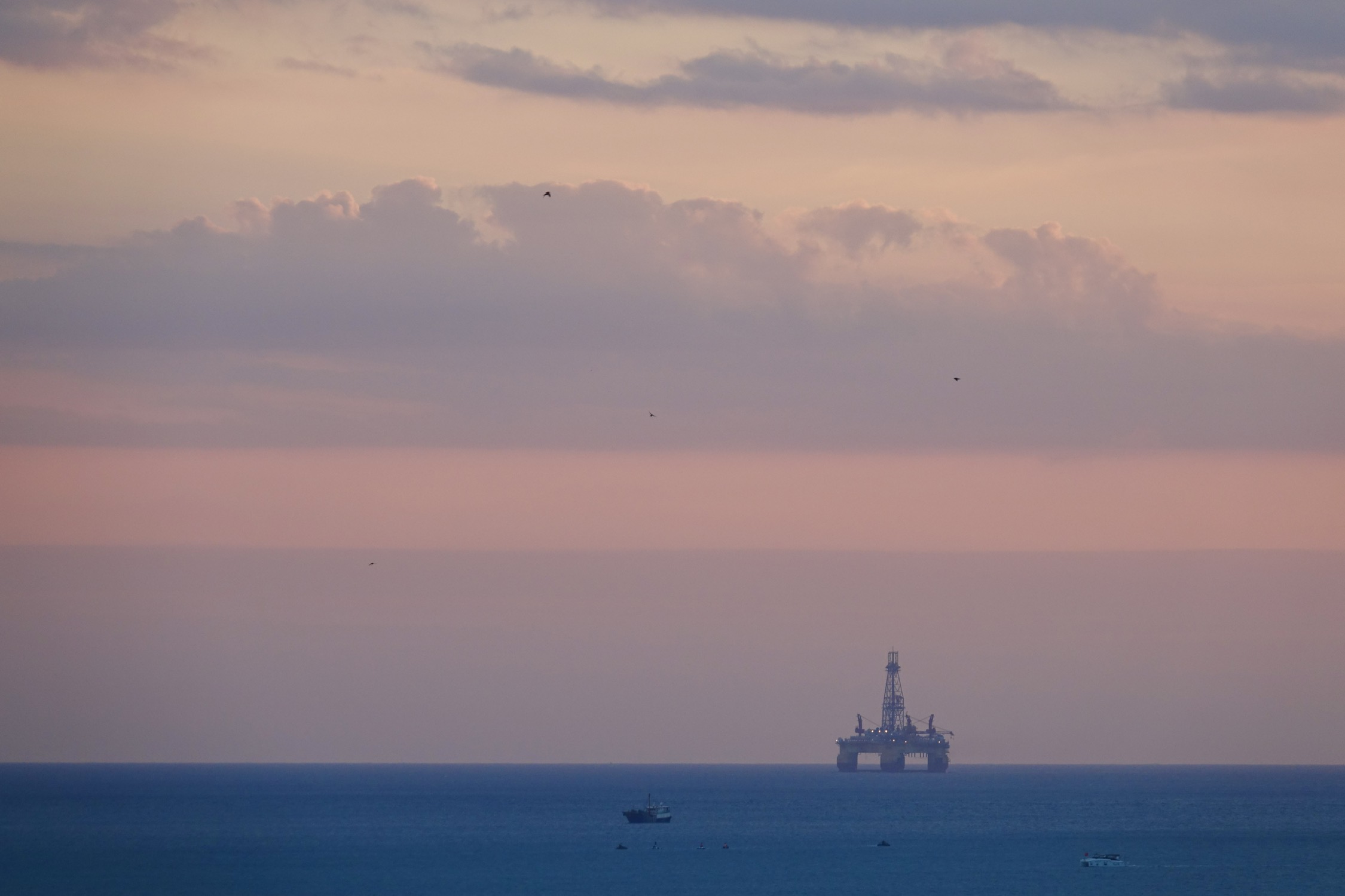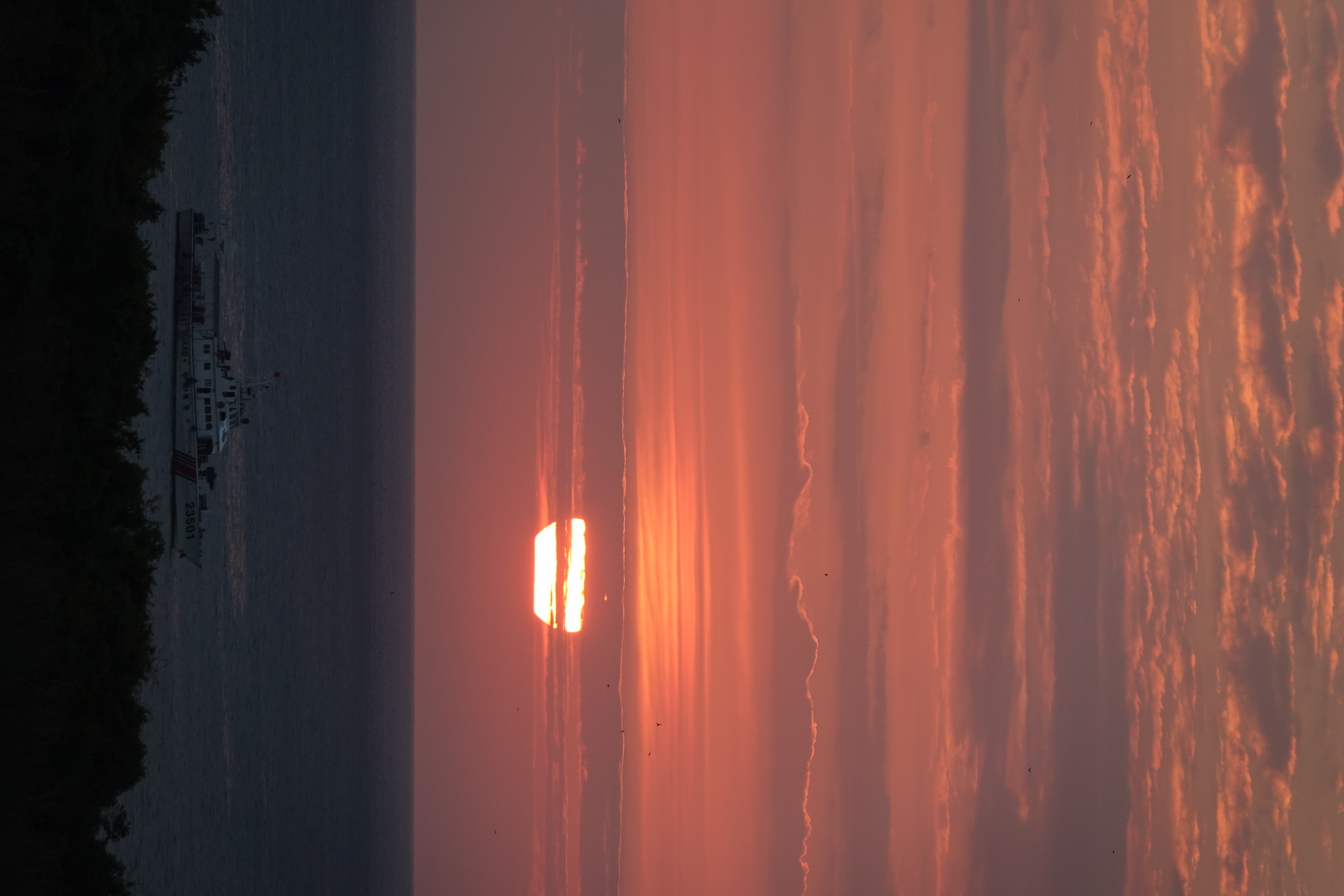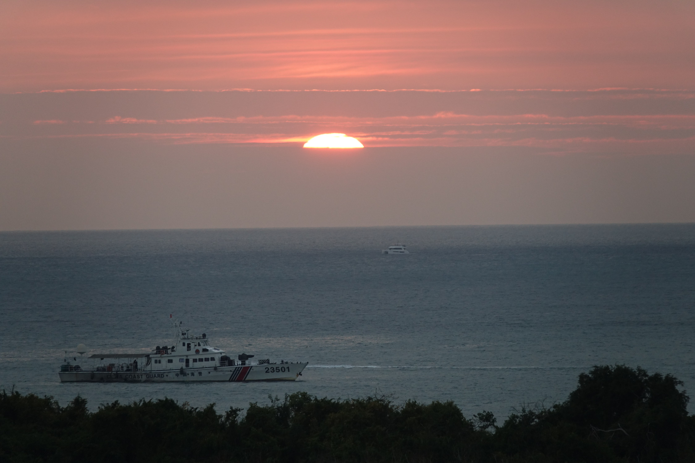 日落时分海上天上有朦胧的雾,落日的橙红不再那么浓烈,有种温柔静谧的美。