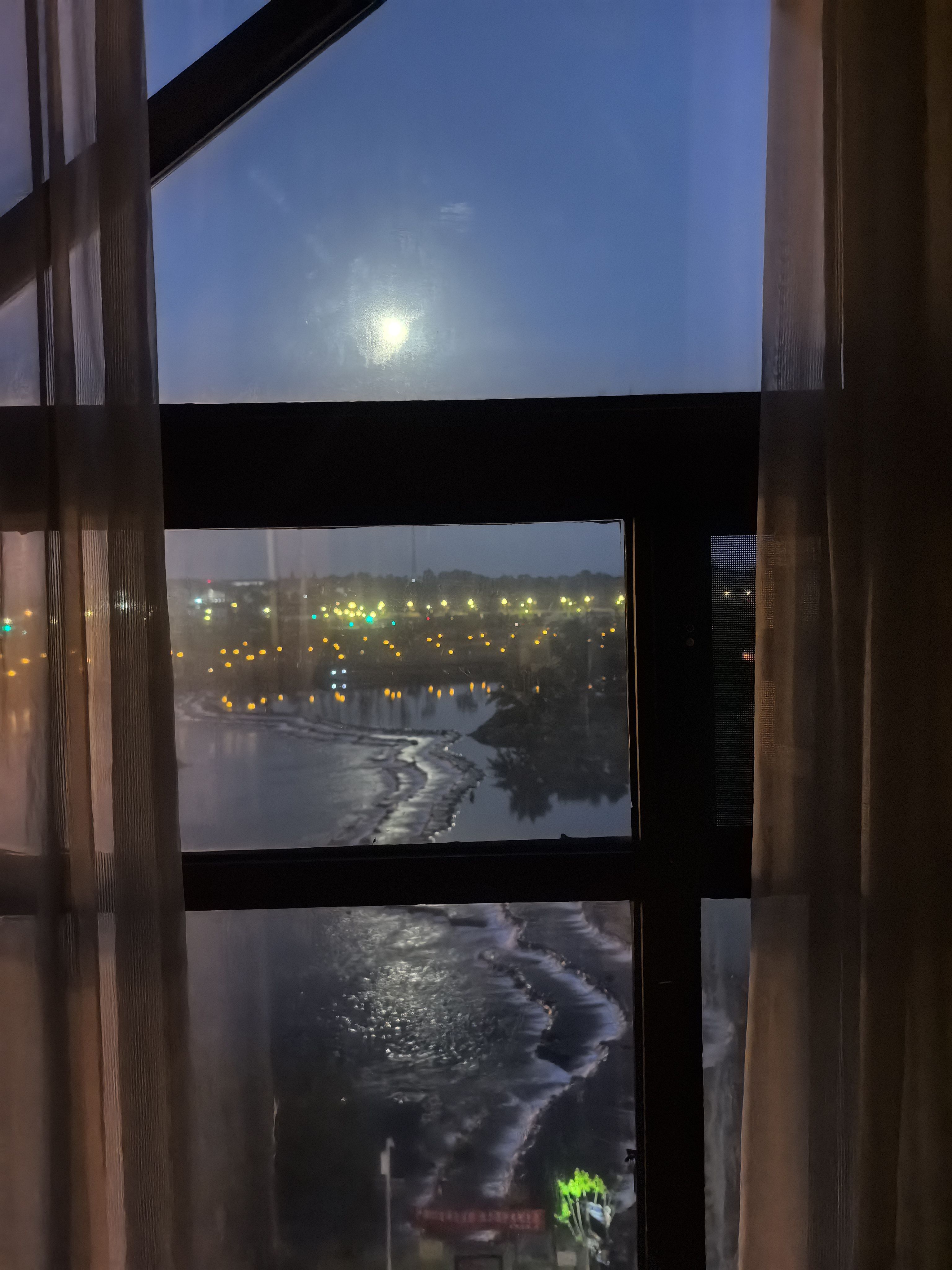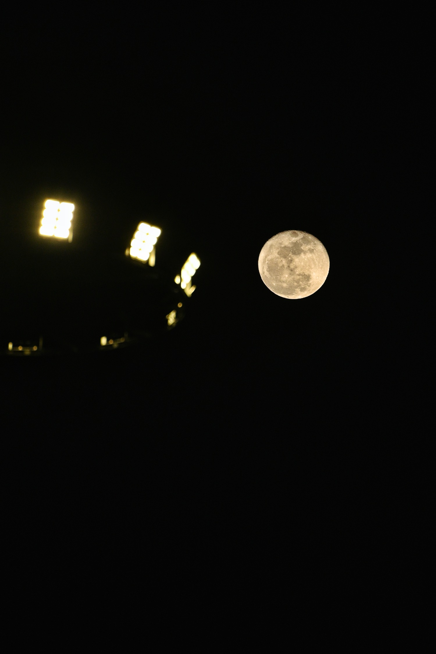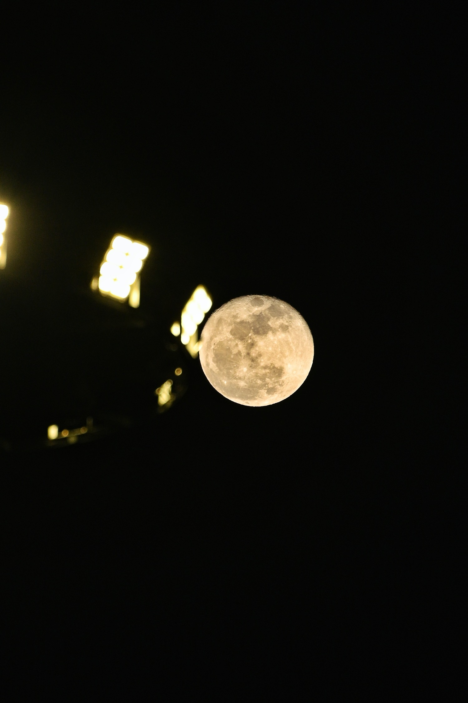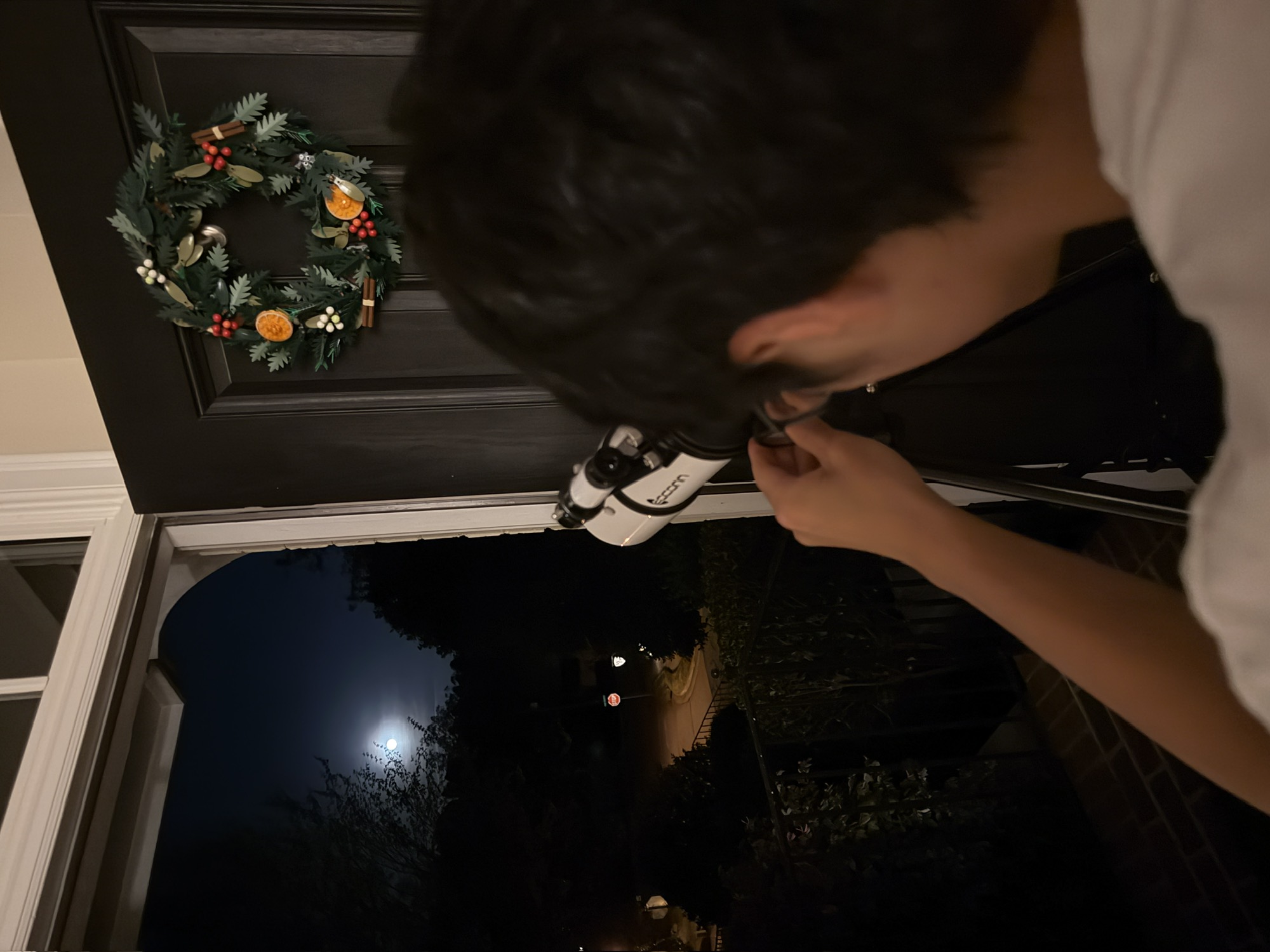 回家路上,看到满月刚从一个湖面上跳出来,诺大个盘子般,金灿灿的。后来车子转了方向,月亮就在我们身后了。回到家,老公把望远镜装上,刚好在家门口就能看。