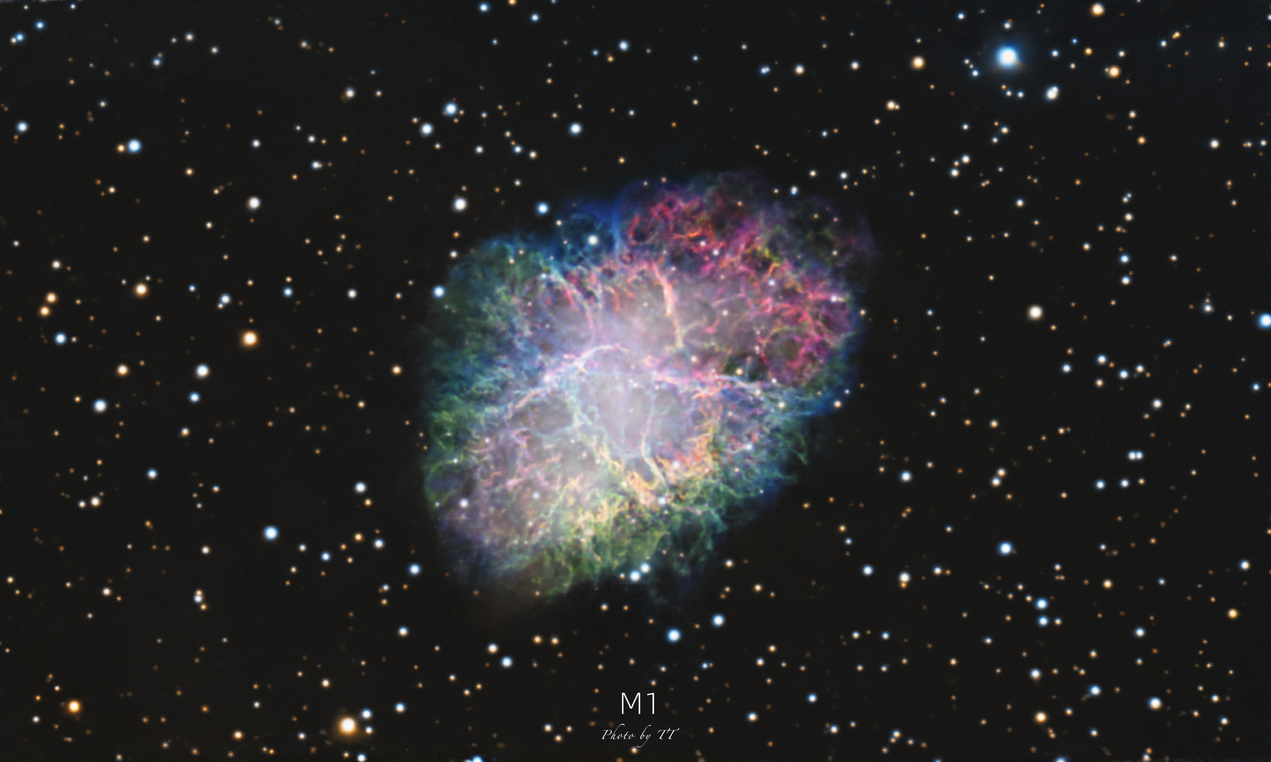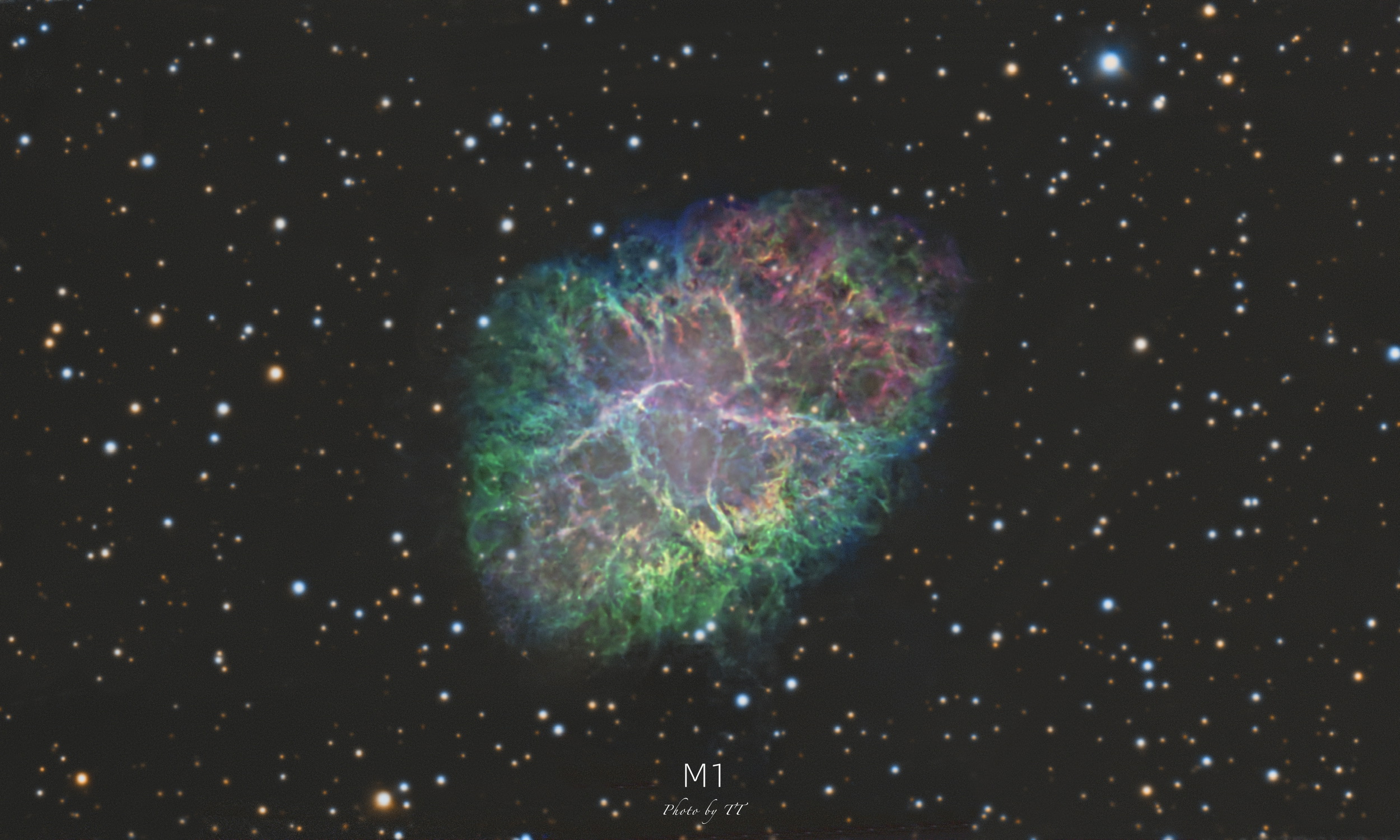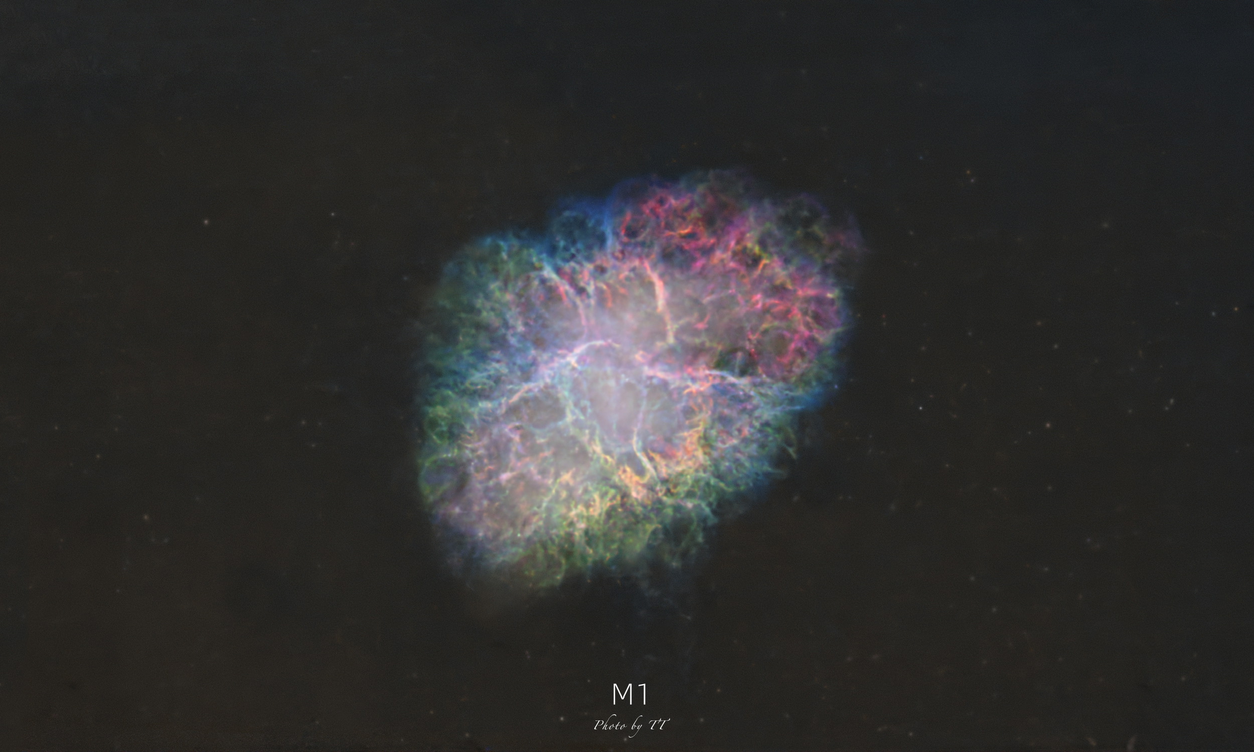 从去年11月拍到今年1月底的蟹状星云,使用C8HD+草帽相机拍摄,攒了接近20个小时的素材。我既喜欢它在RGB宽带拍摄下丰富的云气,又喜欢在SHO窄带拍摄下五彩斑斓的视觉感受,于是把RGB图像跟SHO图像拼在一起,得到了图一的效果~