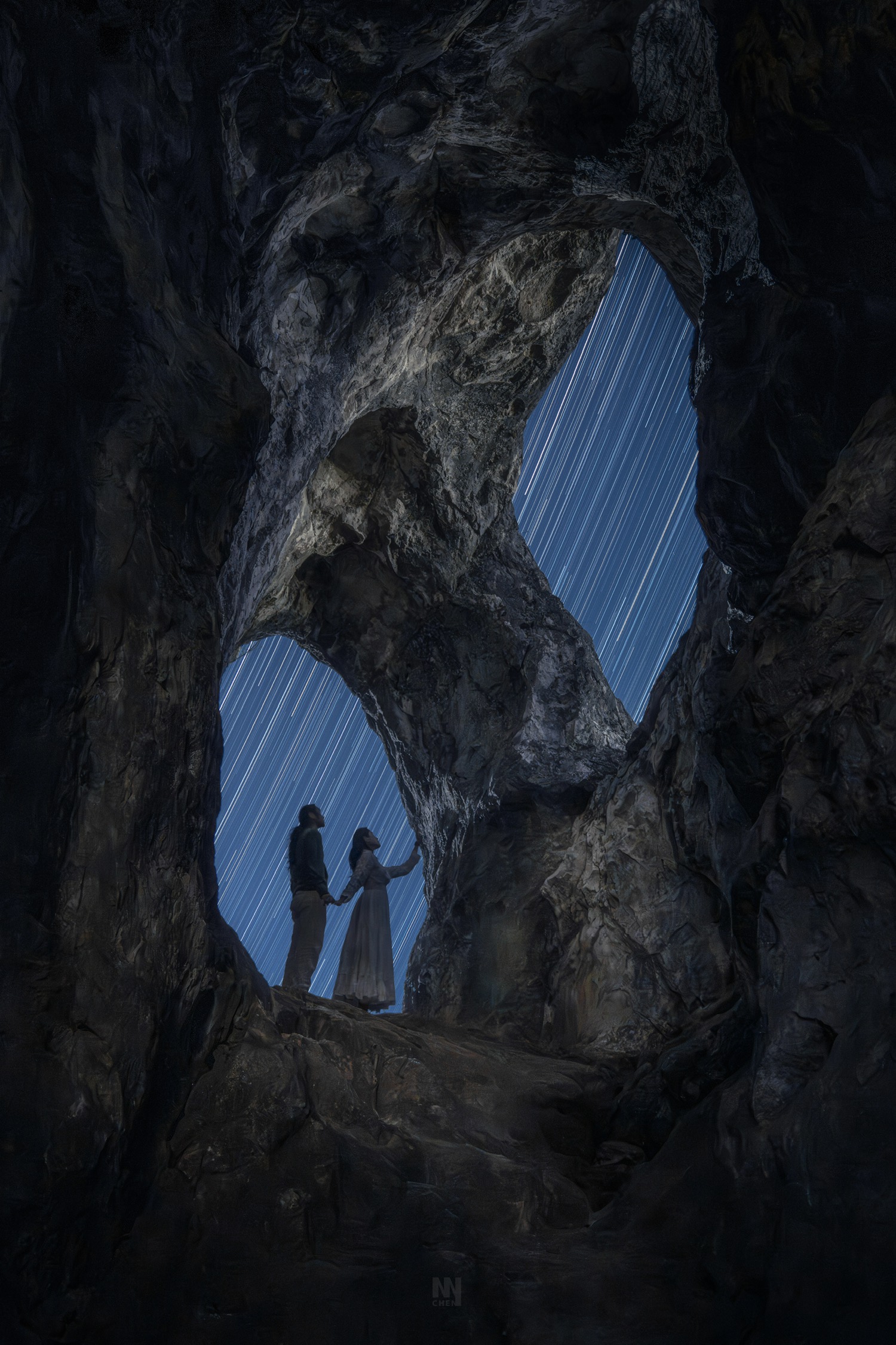 洞穴深处的岩壁像被岁月缓慢雕刻出的时间裂隙,两扇天窗将夜空引入山体,也把流动的星轨留在了黑暗之中。站在洞口的我们,像是停留在现实与未知之间的一瞬,下一秒,仿佛就会通往宇宙深处,迈入另一个时空。