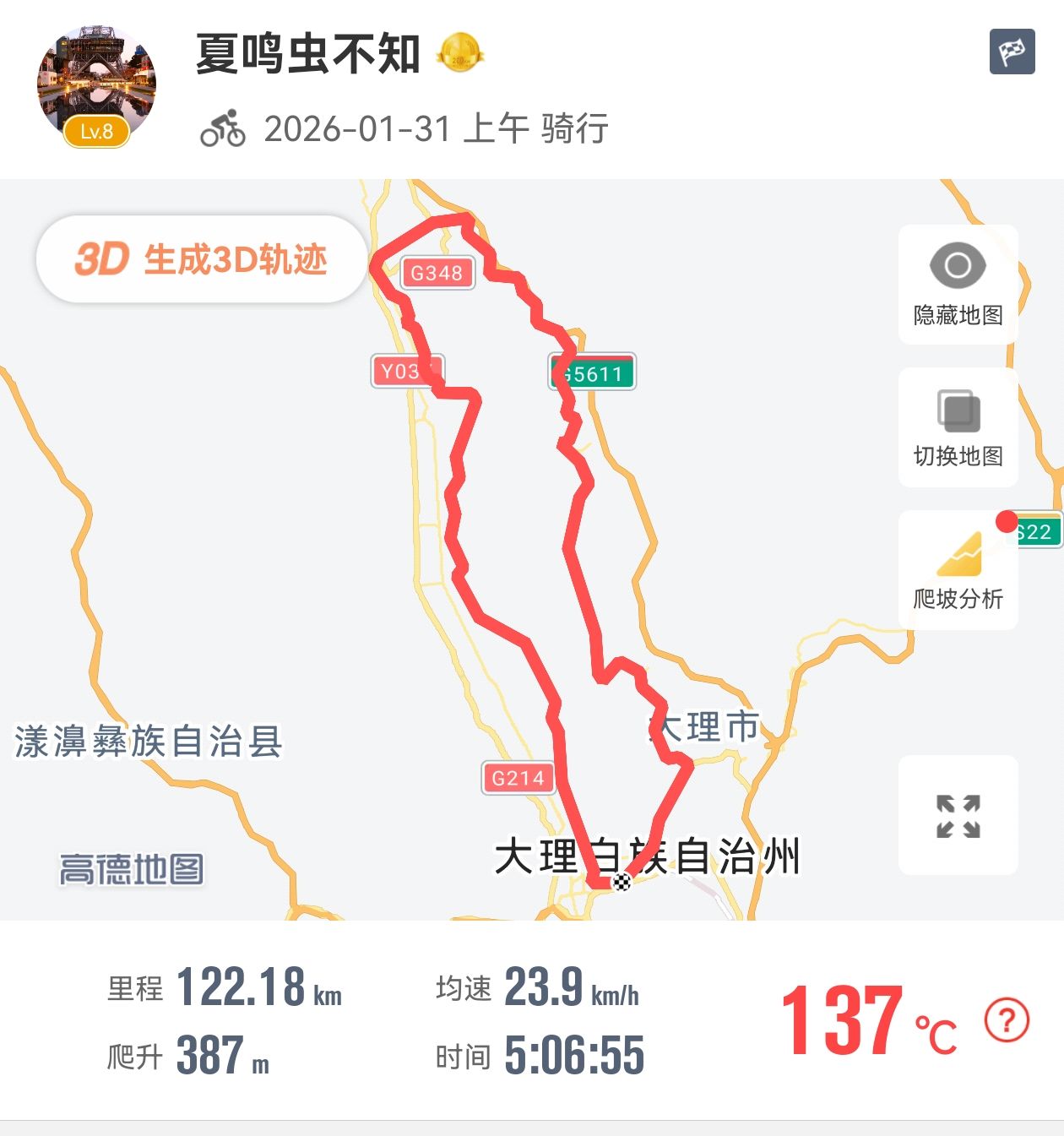 我一直以为我速度不快是我的原因,原来是车的原因!早上在车行租了车,上手一提怎么这么轻!骑行裤也没带,骑的屁股裂了