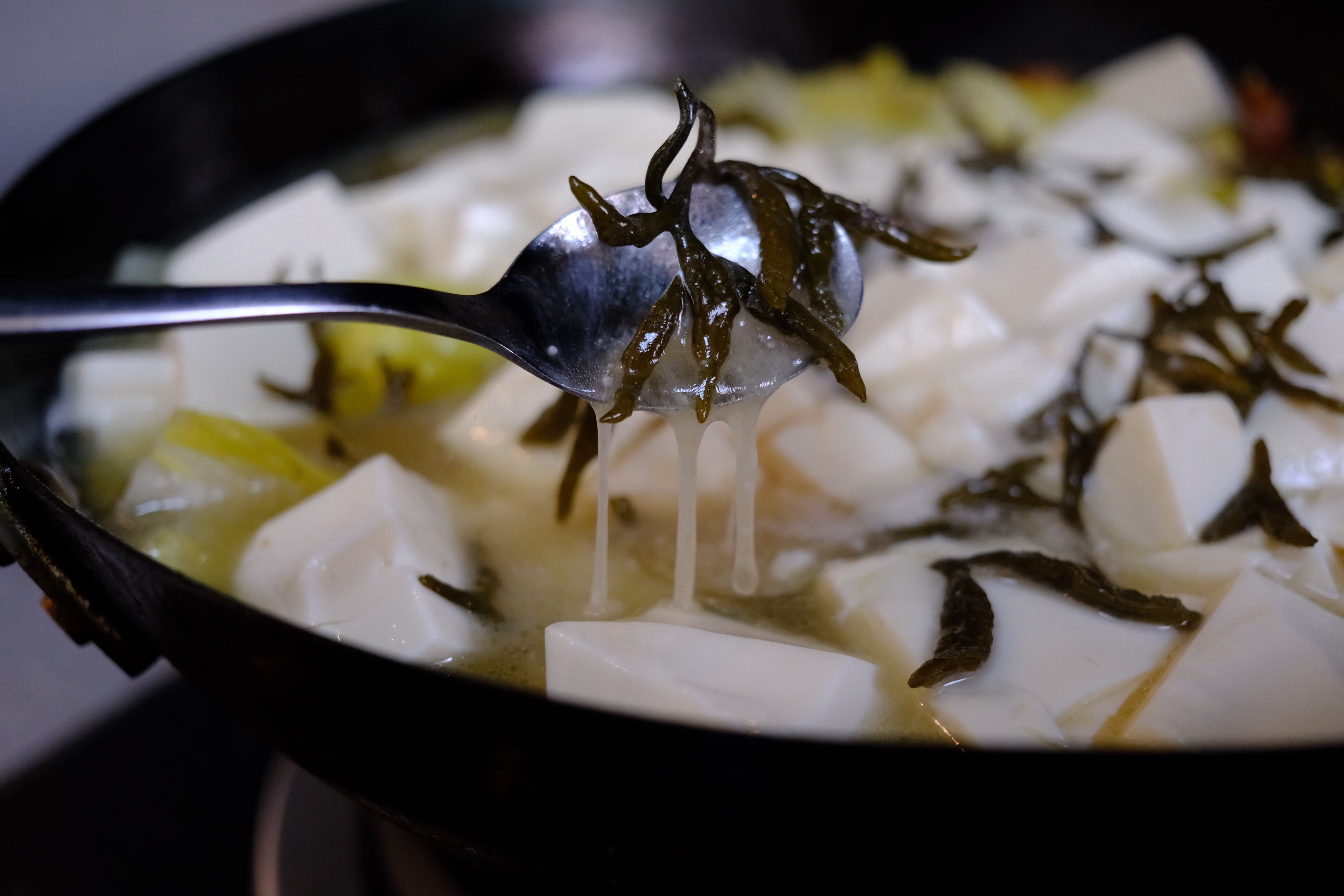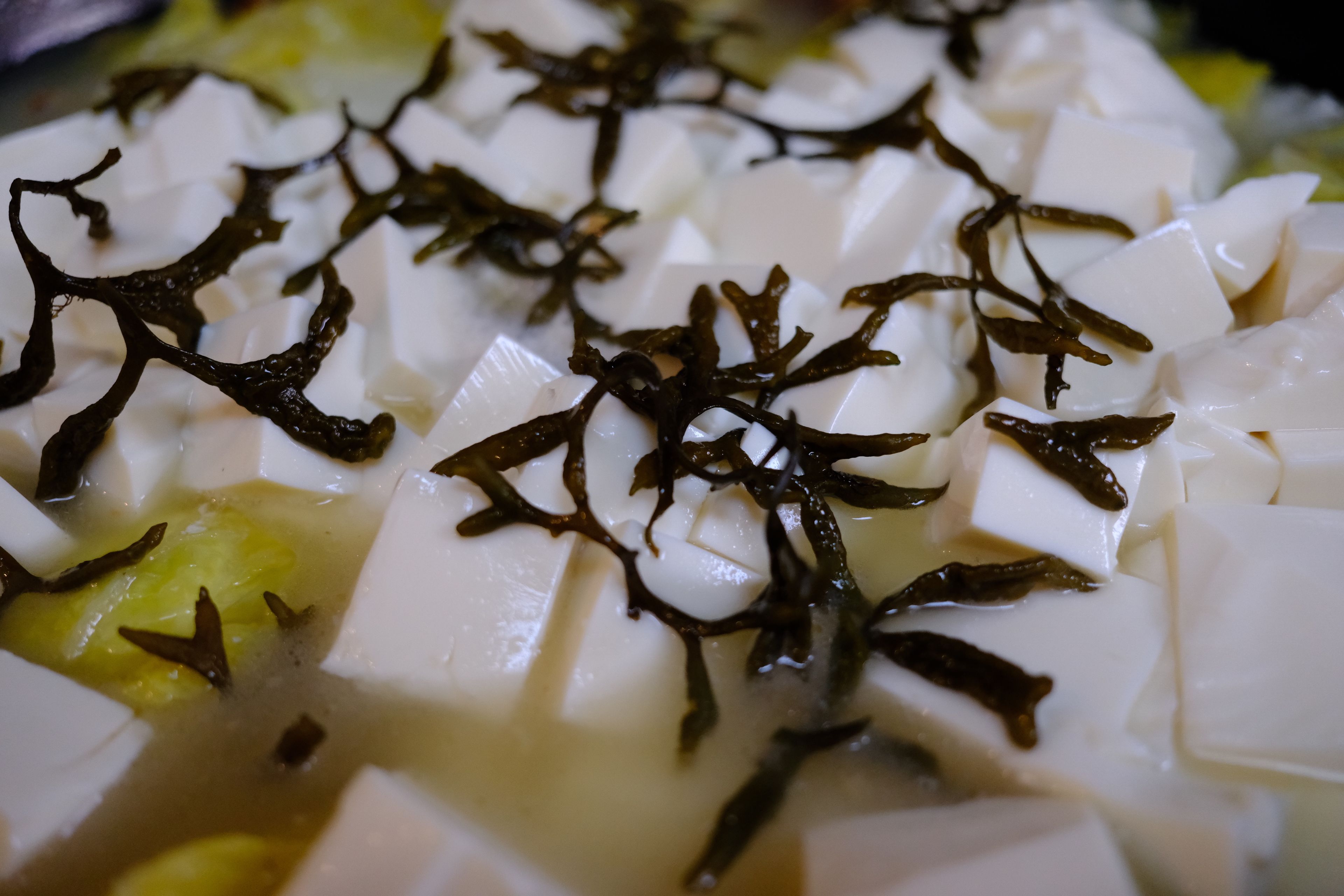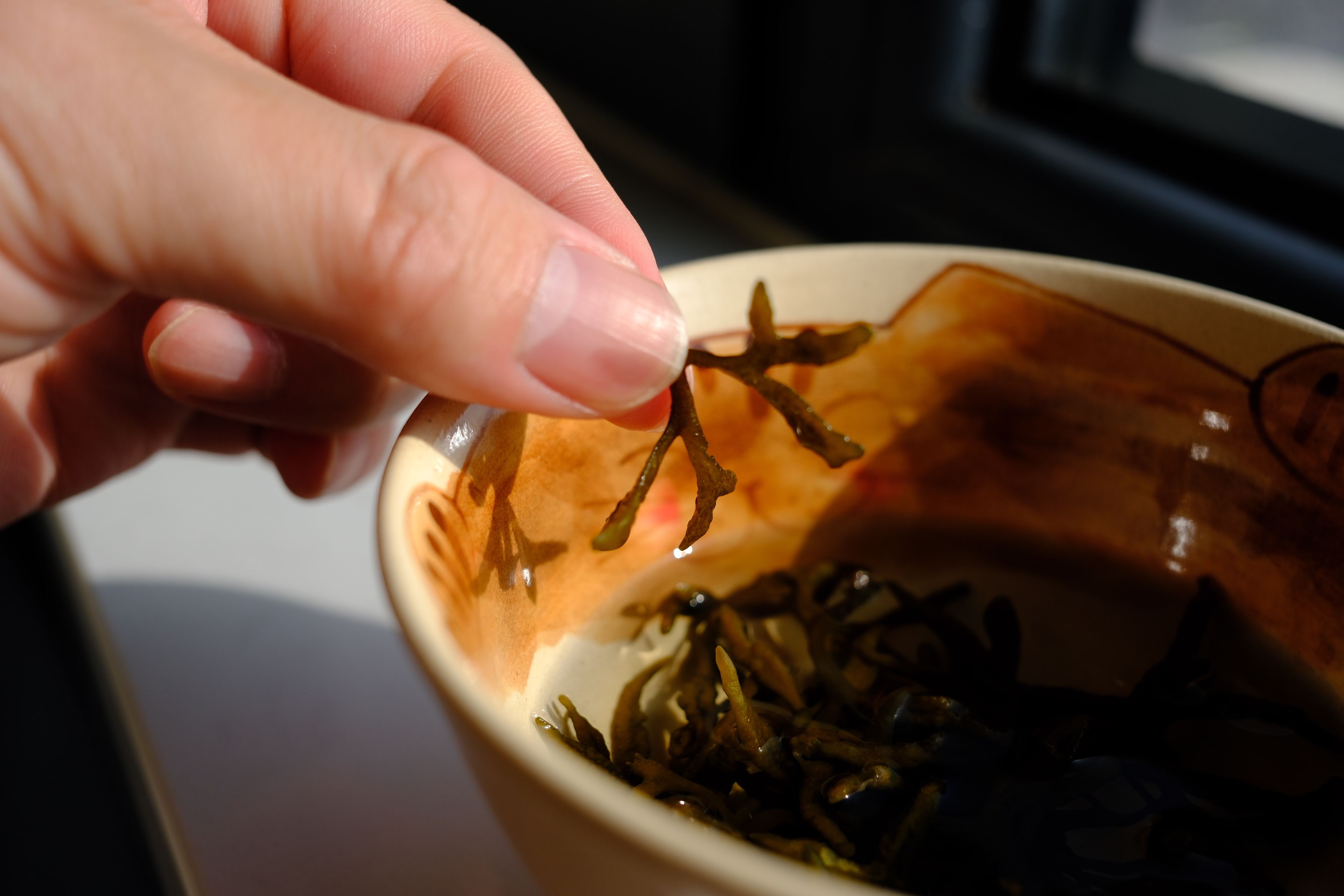 鹿角菜(Pelvetia siliquosa,曾呈奎院士1953年发表)是陪伴了我国北方菜系特别是鲁菜千年之久的黄海生态区特有藻类,是打卤面,招远丸子等传统菜肴中的关键性食材。但遗憾的是,上世纪90年代之后,鹿角菜突然减产,直至最终从食材市场中彻底消失了,并于2021年9月被列为了国家2级保护野生植物。但我们这代人真的再也吃不到真正的鹿角菜了么?没有什么能难得倒爱吃之人,在不懈的努力之下,终于让我找到了合法合规可持续的鹿角菜,虽然价格略高采购繁复,可也总算让我在春节期间收到了。现在市贩的鹿角菜已经全部用羊栖菜(胶东地区俗名:鹿角尖)做了替代,只保留鹿角菜的鲜味特性,可实际是真正的鹿角菜在烹饪中更重要的特性是口感和制滑(类似于天然勾芡和粘合),鹿角菜加热之后会析出大量粘液(图四很明显),这个粘液会变成浓稠透亮的卤子和招远丸子的粘合剂。