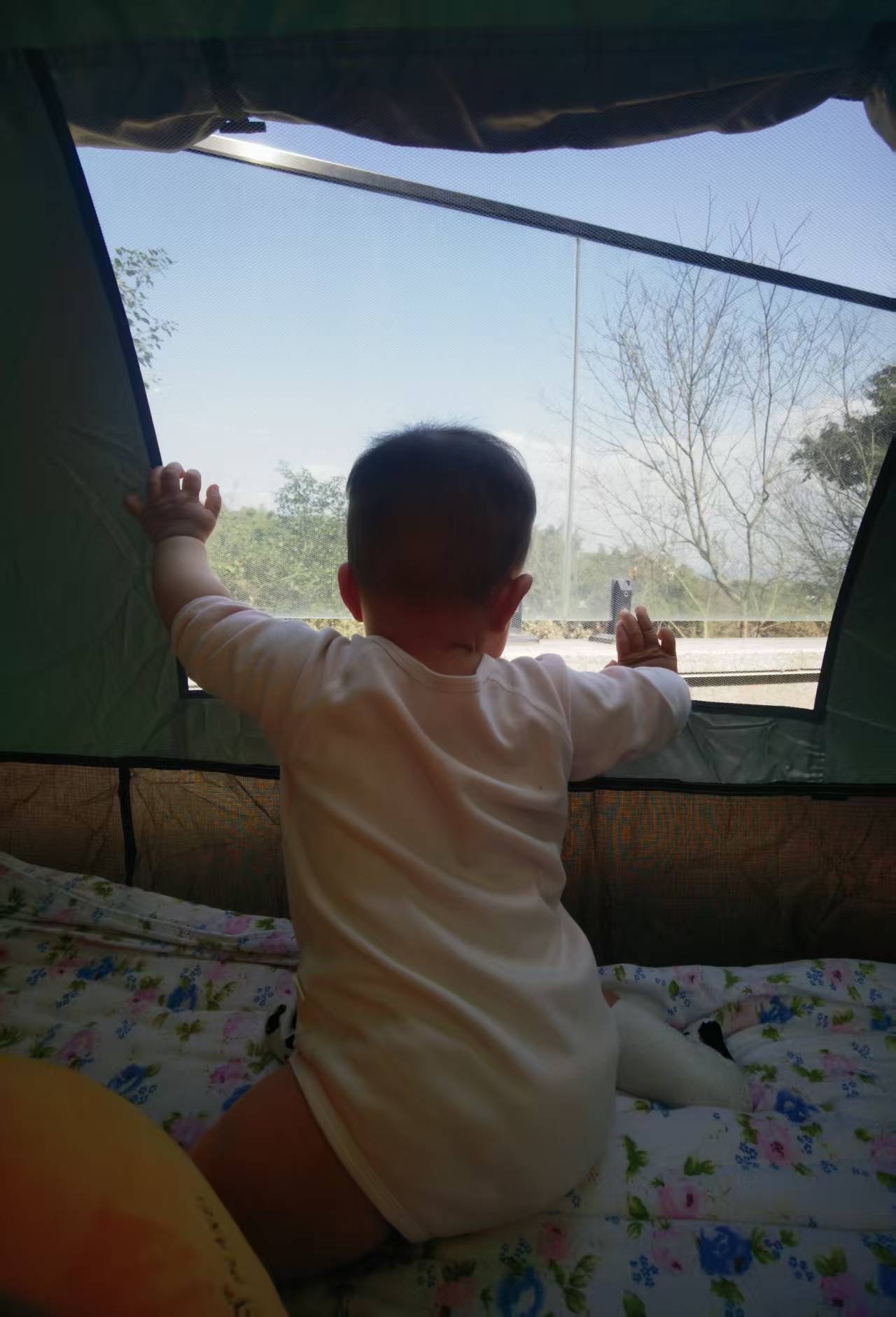 孩子大了,最近一直担心她忽然从婴儿床上翻下来。今天把她放在帐篷里,简直不要太香。更宽敞,更安全,她也更喜欢。天气好的时候还能晒到太阳,而且刚好有一床旧被子尺寸吻合,铺在里面也不怕她摔。她爸已经带着在里面睡了一个午觉了,在家露营,美滋滋。