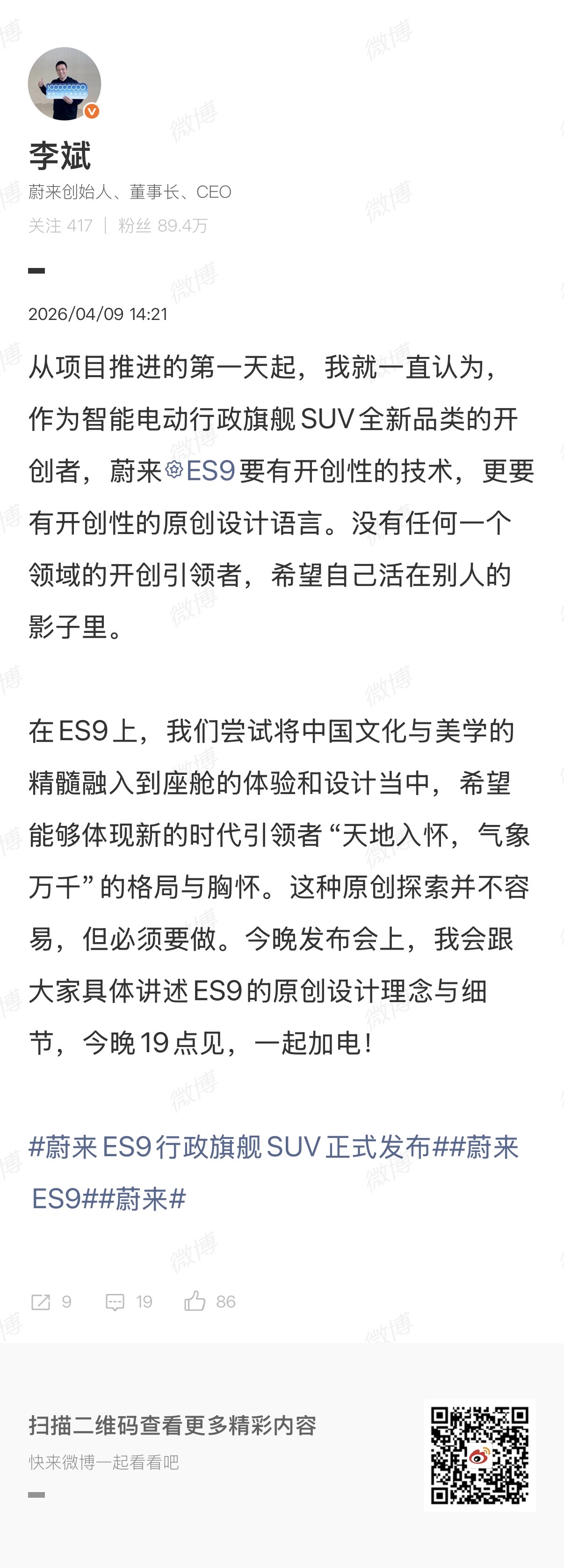 看来这次 ES9 的打法和 ET9 有很大区别,今晚发布会,斌哥要着重讲ES9的原创设计理念与细节。「 ES9 要有开创性的技术,更要有开创性的原创设计语言。」