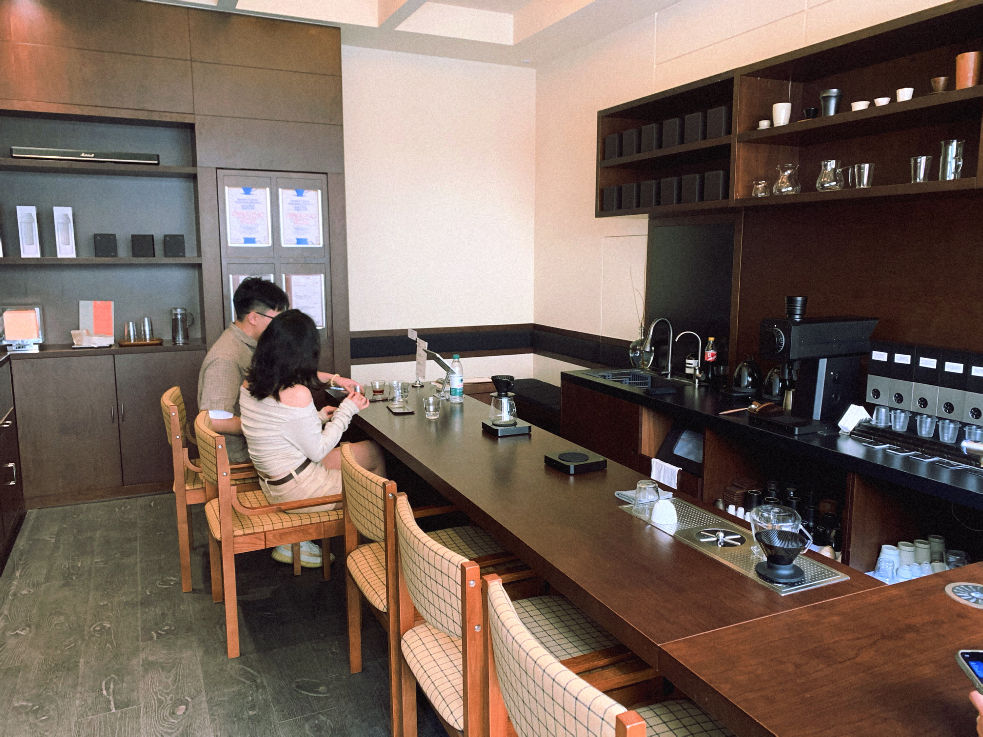 冲着多项式的新店去,结果是单独搞了个手冲咖啡体验店,整体主打深咖色,背面墙体远看像中药铺,偏“新中式”风,价格偏高,咖啡豆价格170/100g,索性拐到隔壁喝奶咖算了😐