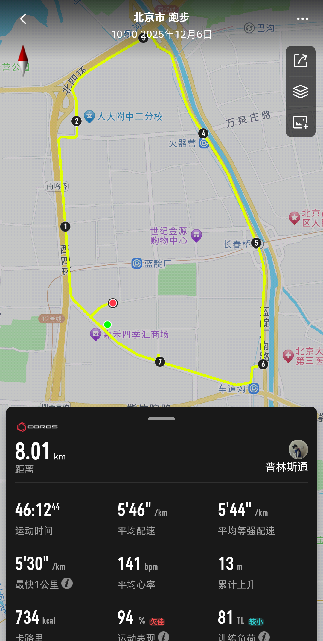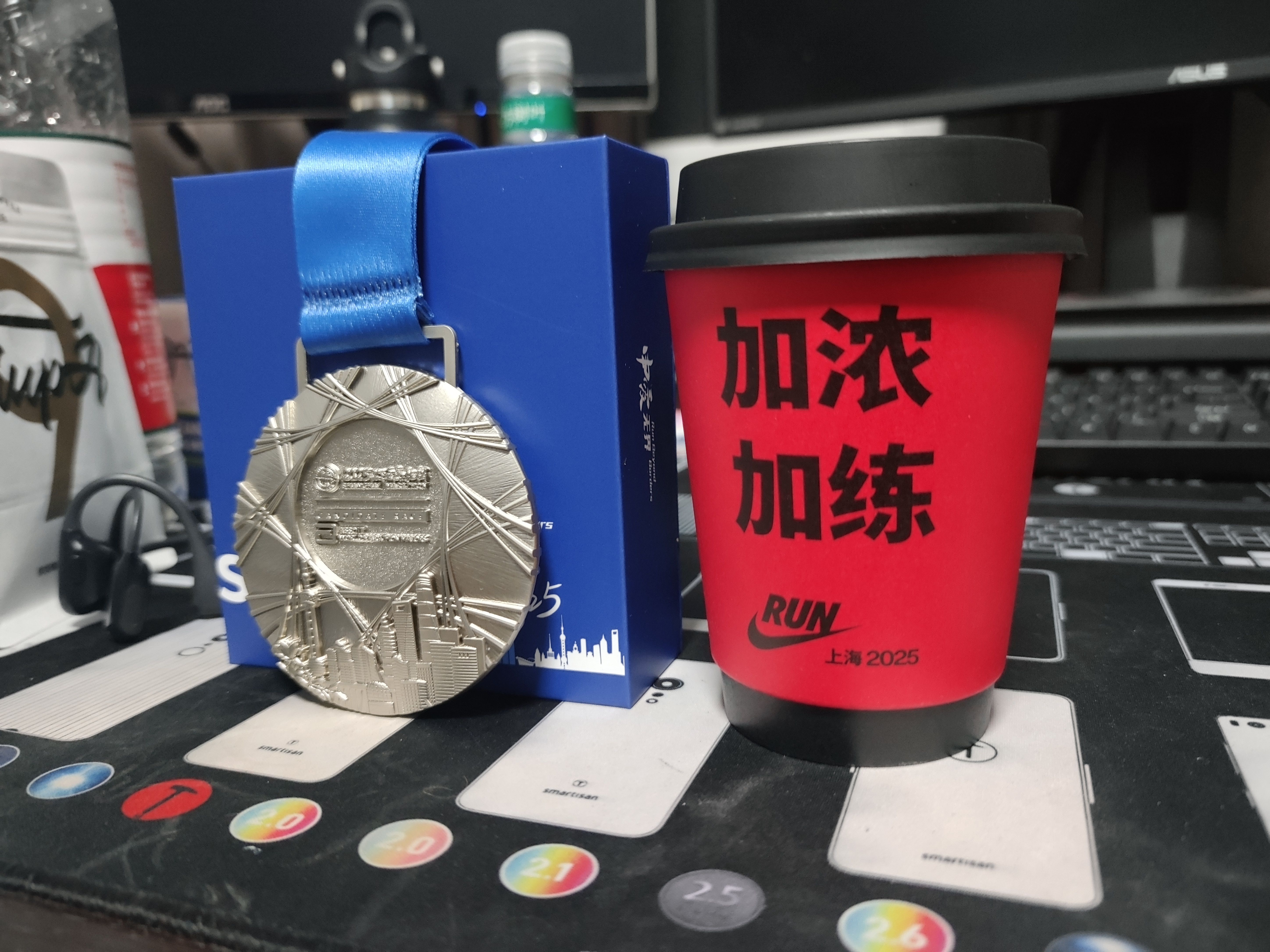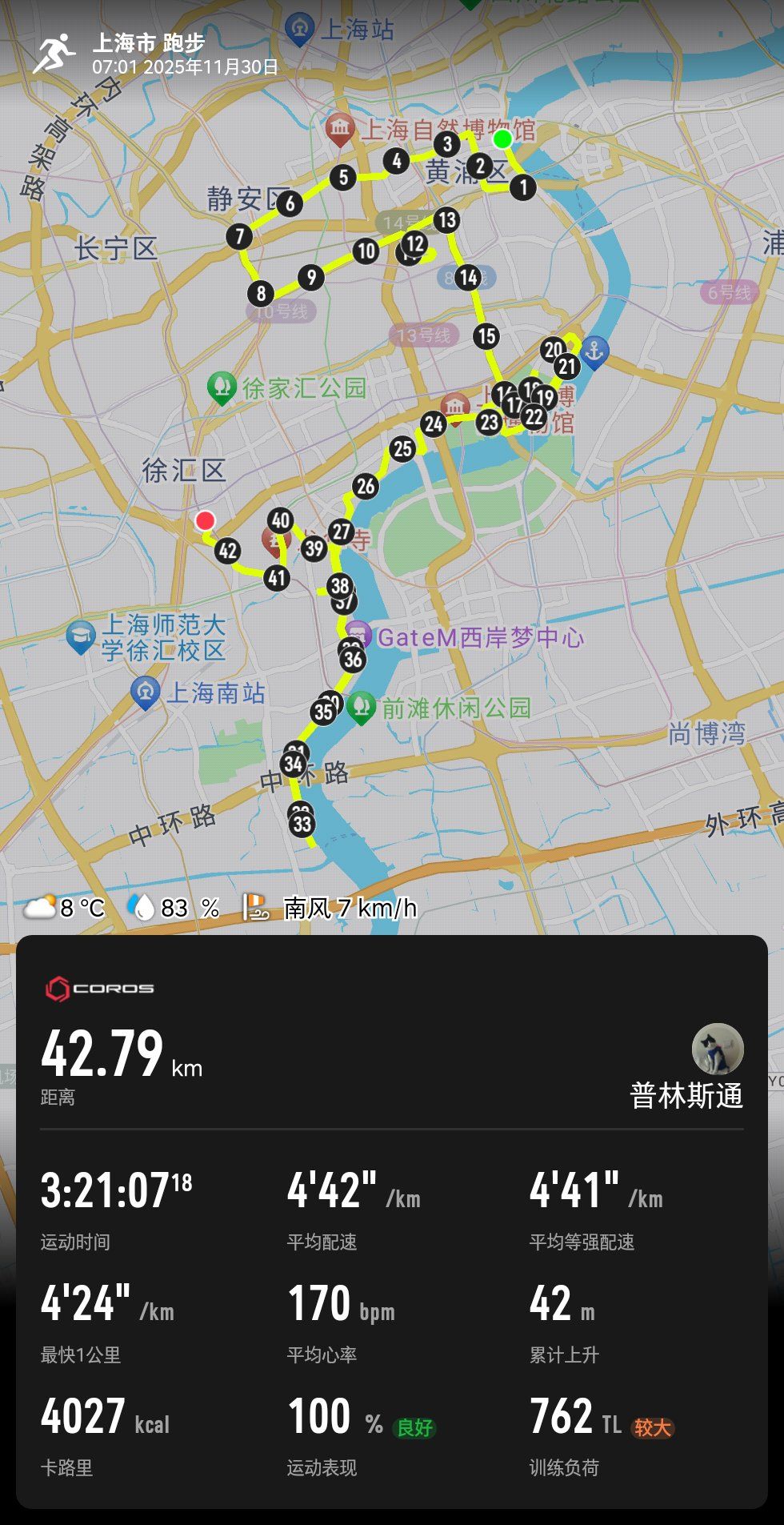 上海后程极速升高的温度是个考验,天津前面跑433后面崩,今天就从440开始慢慢加,心率却比天津还高,37k开始掉速,在耐克PUA标语和热情加油中咬牙坚持完赛。
