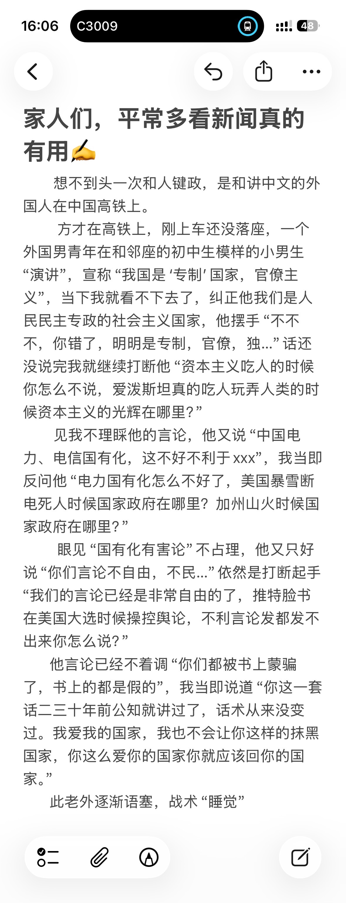 想不到头一次和人键政,是和讲中文的外国人在中国高铁上。