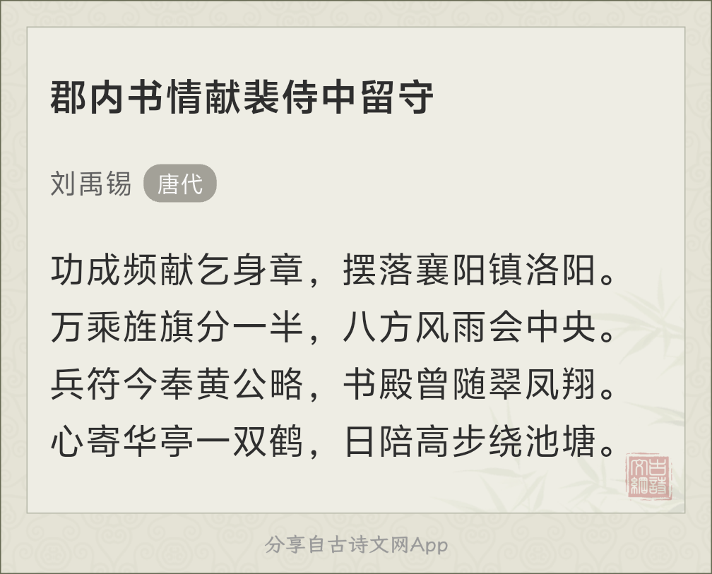 刘禹锡被称为“诗豪”真的有道理,他很擅长这种“大”的语言。一句“万乘旌旗分一半,八方风雨会中央。”,一位一人之下,万人之上,总掌枢密的宰相,如在眼前,令人心神一振。