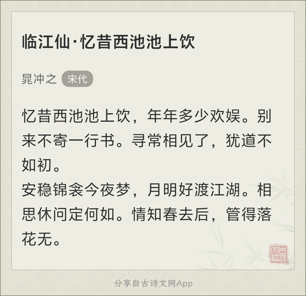 宋词的细腻,总会在不经意间戳中内心。我们也会有些老朋友,很长时间没联系了,虽还记在心中,但也是只有怀念了,而且有时怀念的也是那段时光。
