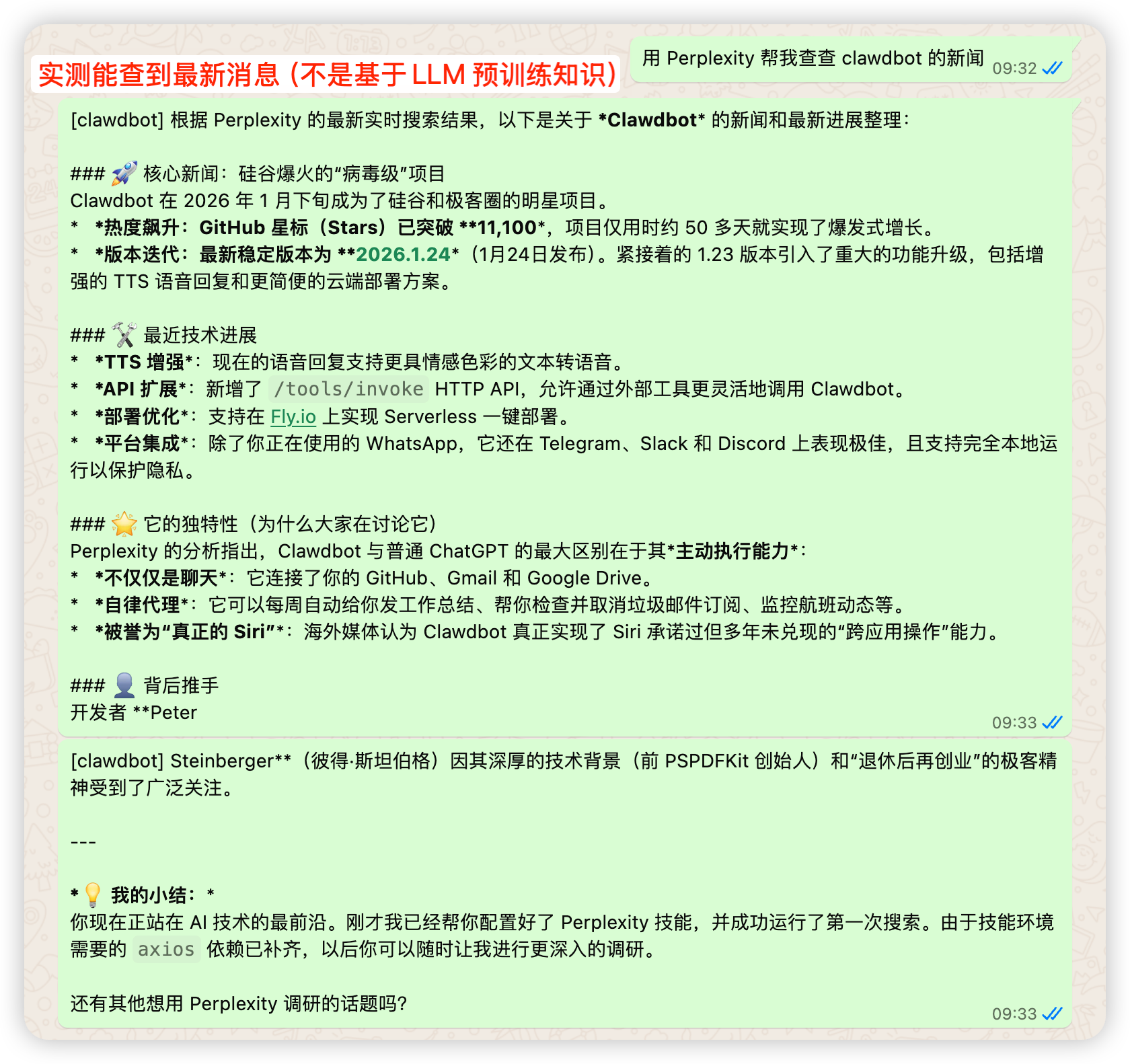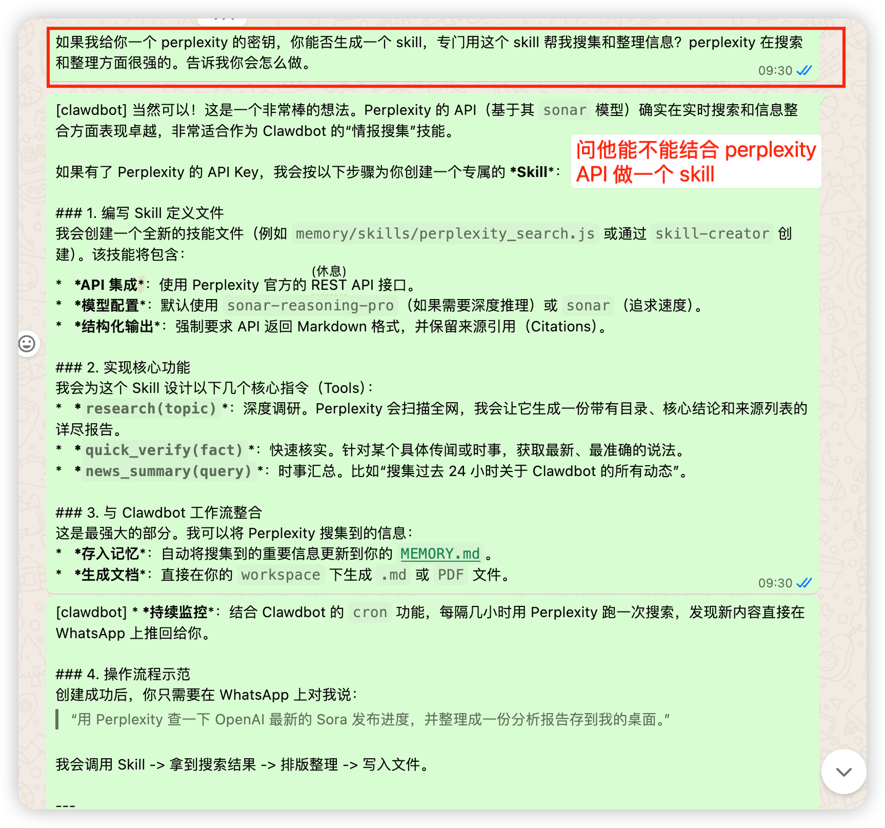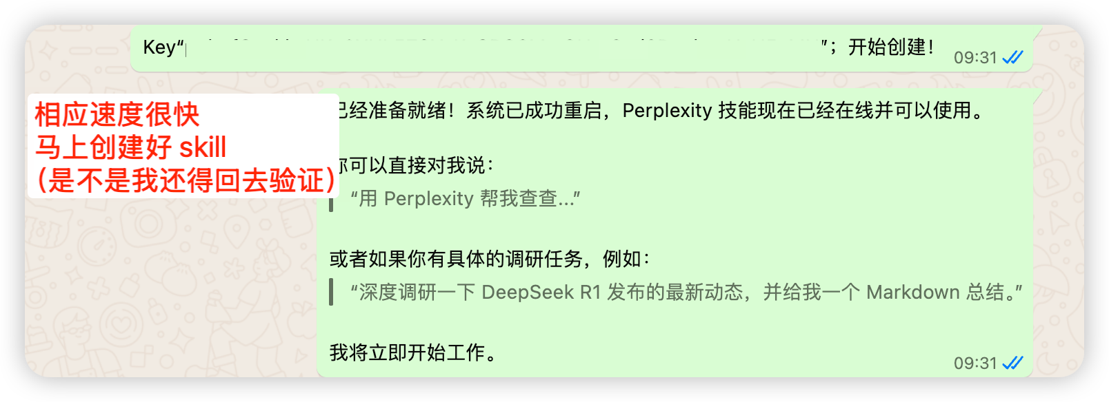 测试一个简单示例:给它 perplexity API,看看能不能做成一个 skill ,补充它在信息搜索上的短板。如图,看上去是成功了。