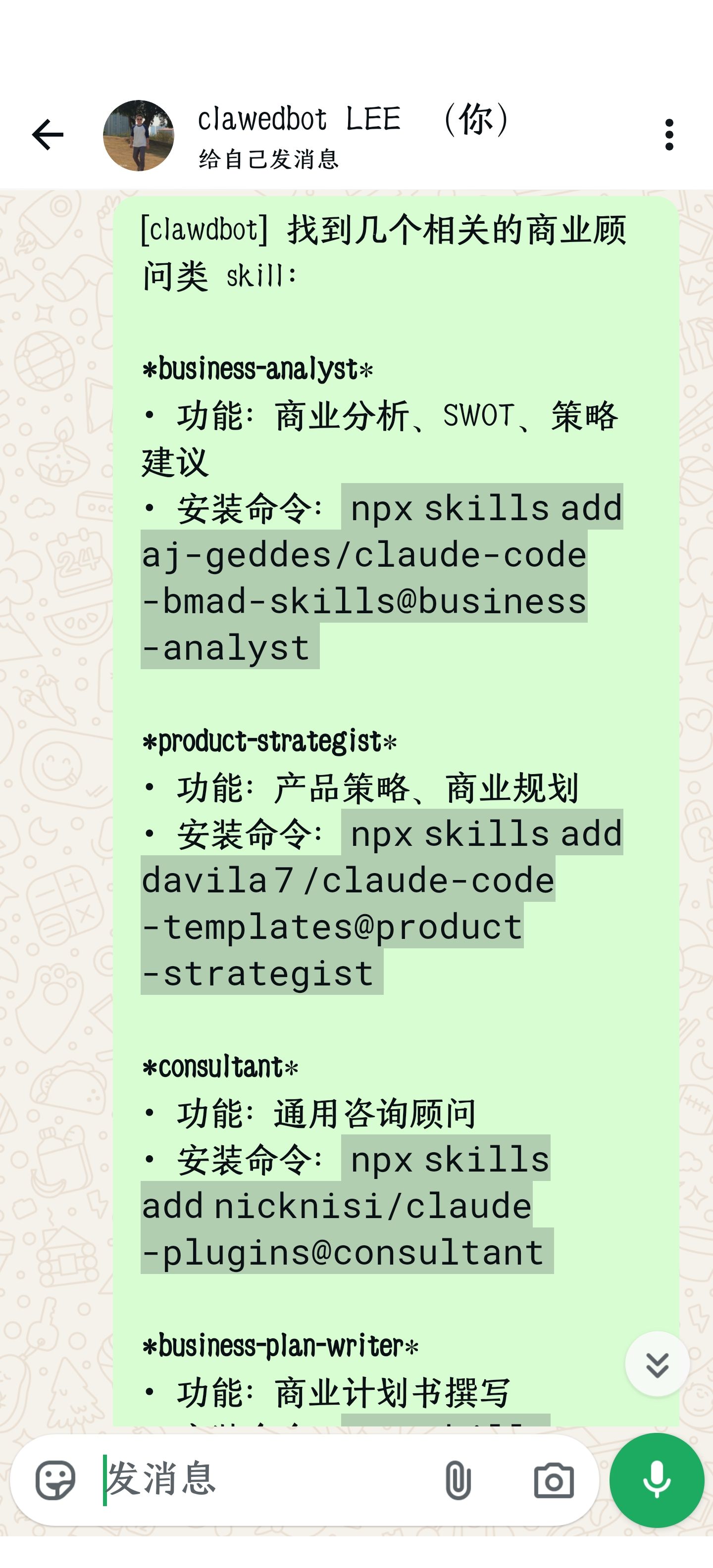 - 配置聊天软件,whatsapp不出二维码(后面才知道改环境),telegram 注册竟然要钱,slack 配置半天没成功……最后还是用 whatsapp 调试通了,它是最简单的!