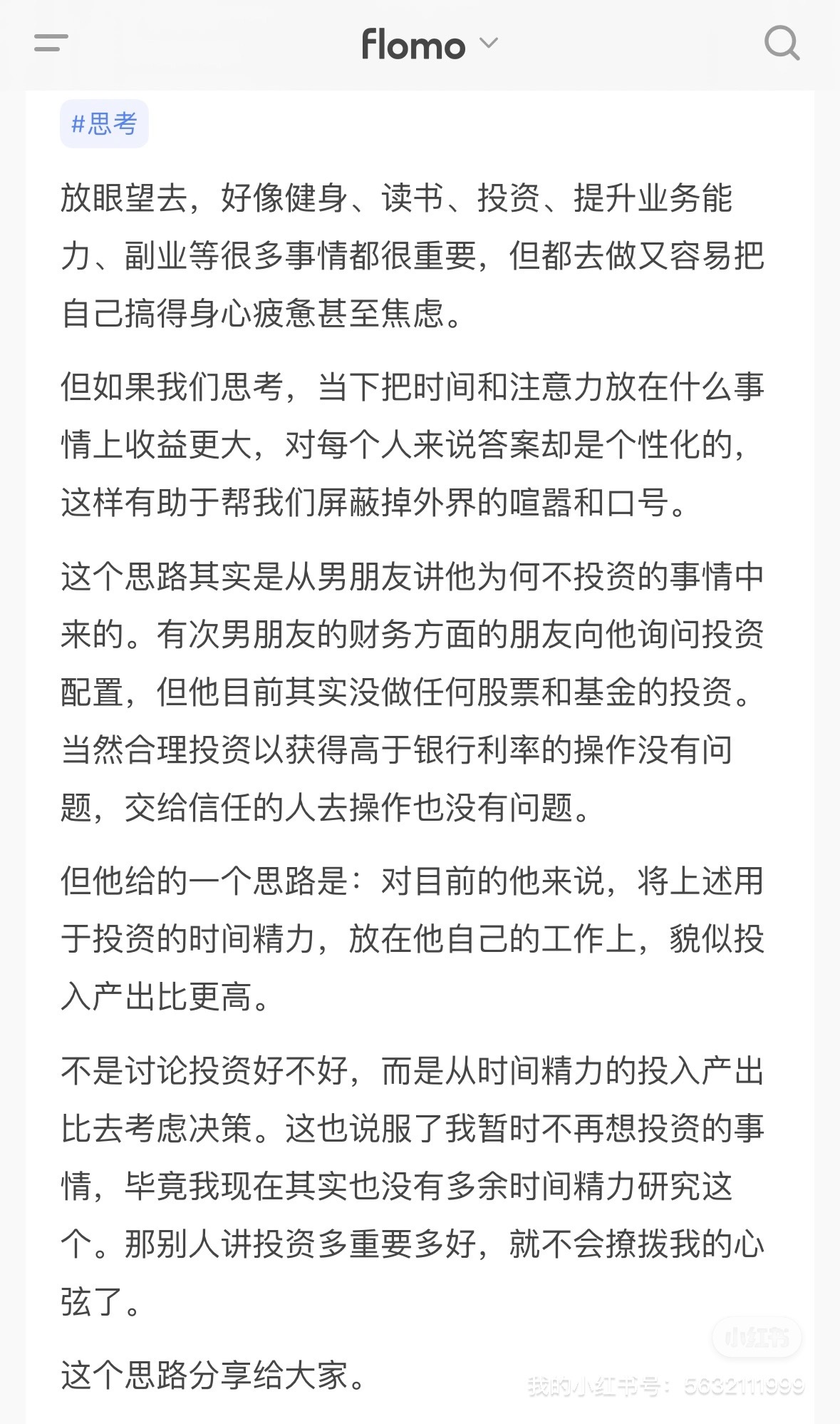 🌟不是讨论投资好不好,而是从时间精力的投入产出比去考虑决策。这也说服了我暂时不再想投资的事情,毕竟我现在其实也没有多余时间精力研究这个。那别人讲投资多重要多好,就不会撩拨我的心弦了。