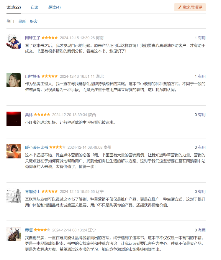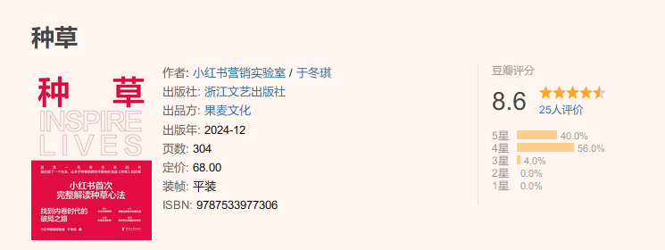感觉小红书营销实验室的这本《种草》,完美地体现了如今种草的诈骗本质,都是包装成真实观点的软文罢了。在豆瓣上开分如此之高,但是25个评价随便看看都是AI文案和假账户,最搞笑的是每个账户的伪装都是刚刚看过《天地辽阔》。豆瓣,为啥好书你不开分,这个25个点评就开这么高分,你也是他们种草play的一环吗?