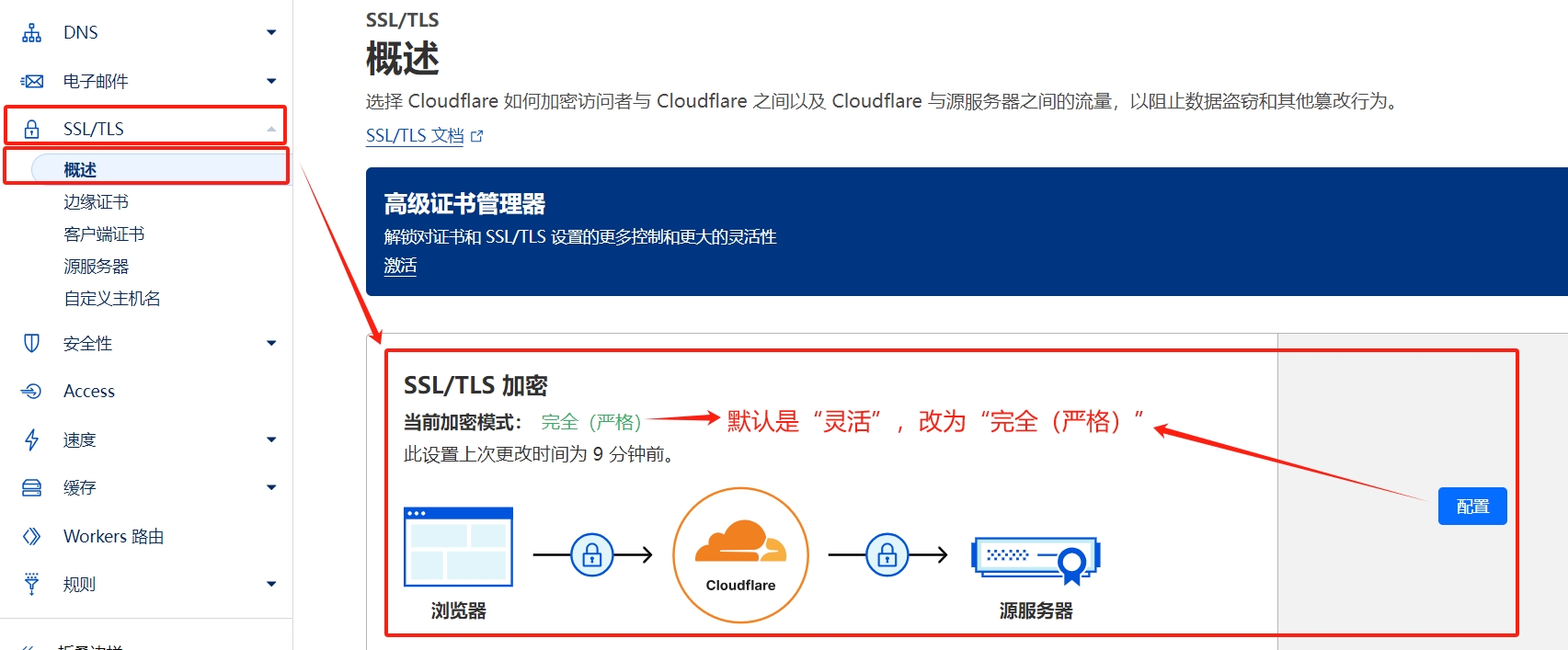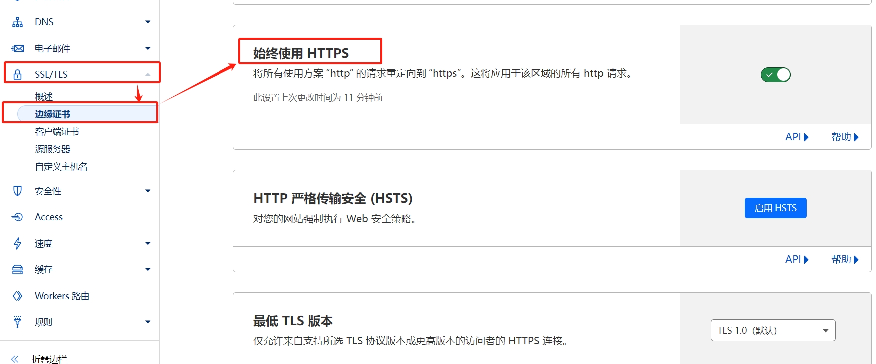使用Cloudflare添加新域名后,还要设置3个地方:1. 始终使用 HTTPS(图1);2. 自动 HTTPS 重写(图2);3. 配置加密模式(图3)