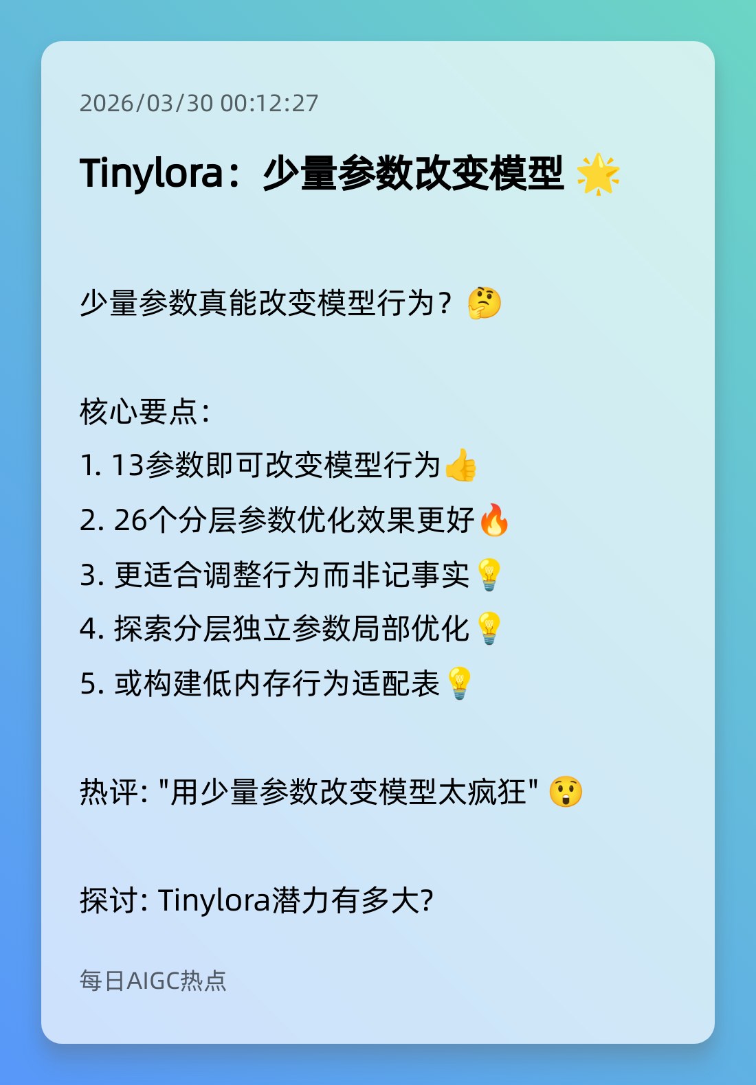 8. Tinylora:少量参数改变模型 🌟