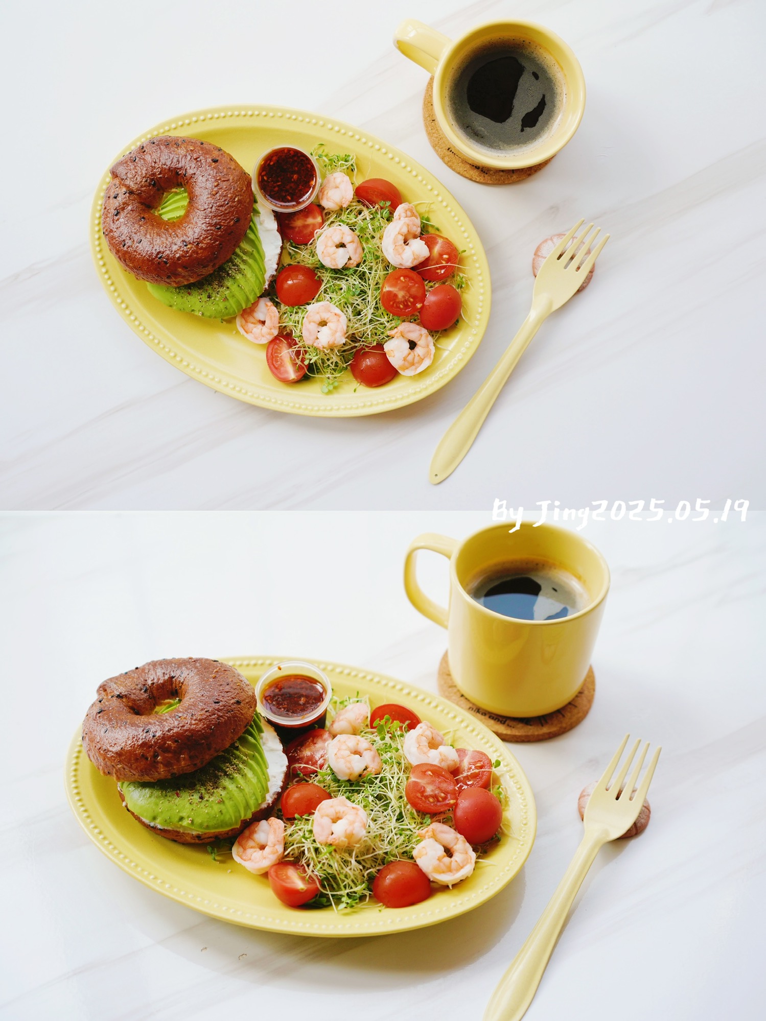 牛油果奶酪贝果三明治&虾仁沙拉 | 咖啡