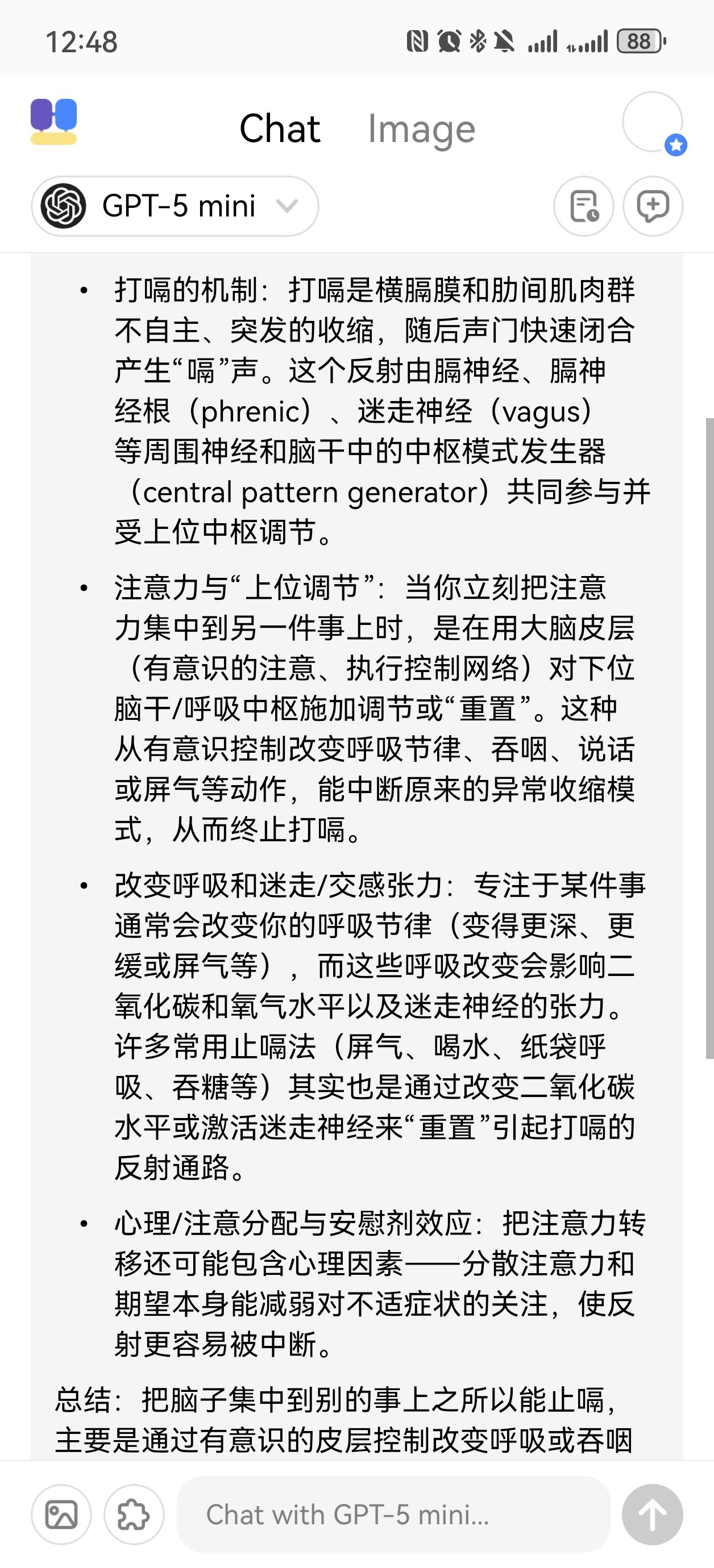 那我想原理应该都是差不多的,所以不一定是要思考肺泡的工作方式。而是当你打嗝的时候,立刻全神贯注想一件别的事,把自己的思绪集中到这件思考的事上,试过两次还蛮有效的。