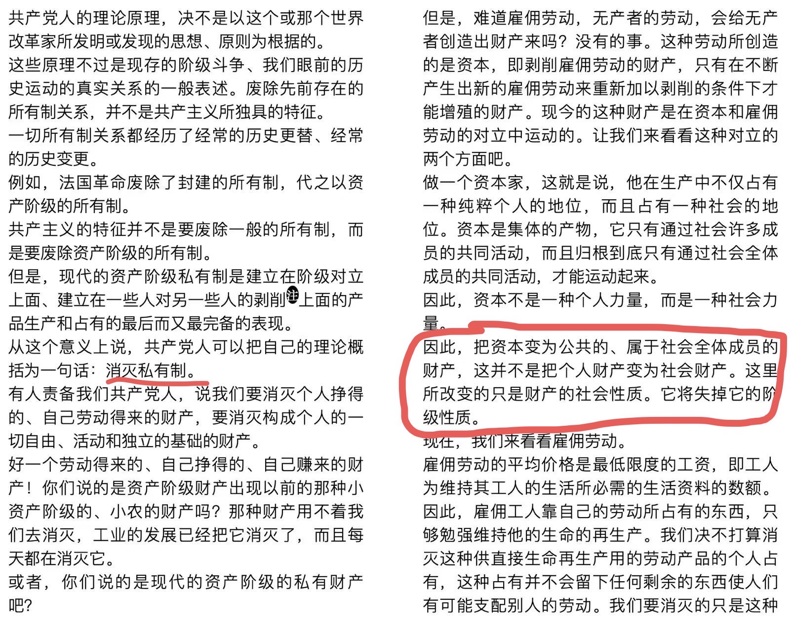 回家后找来马克思、恩格斯的《共产党宣言》搂了一眼,里面有一句:「共产党人可以把自己的理论概括为一句话:消灭私有制。」
