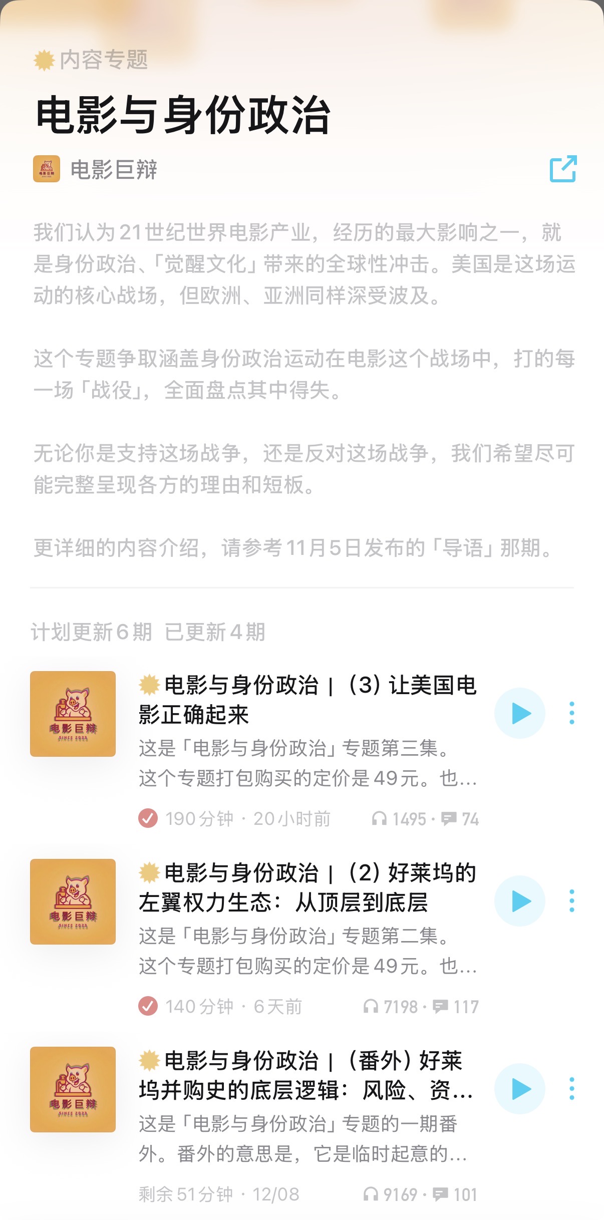 最后一期李安(下)今天也上线了。前后一年时间,终于把「为了华语电影」这个专辑更完了,最后再推广一下吧。含番外一共15集,合计75小时,可以在小宇宙播客等平台订阅。有听友问接下来是否要推出新的专辑,目前还没有具体计划。肯定会继续做,不过要先整理一下思路,沉淀一下经验,把事情做得更漂亮。这包括对播客媒介属性的进一步吃透,呈现出更好的「节目」。也包括电影专业方面,继续精进,提升。下一期可能先补一个之前挖的坑,就是大卫·林奇的《双峰》剧集,肯定会聊一下。也有听友问做不做暑期档盘点?这个就不做了,目前只看了三四部。