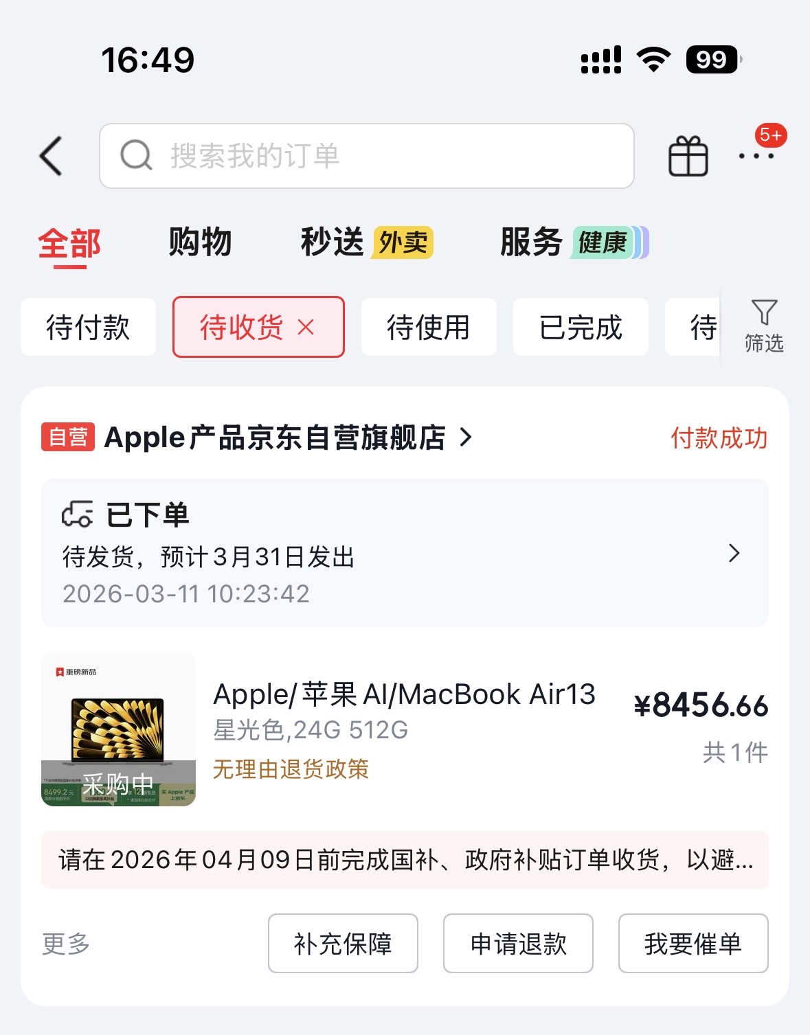 京东买的 MacBook Air M5 24G + 512G,显示要3月31日才发货,还要等半个多月😂